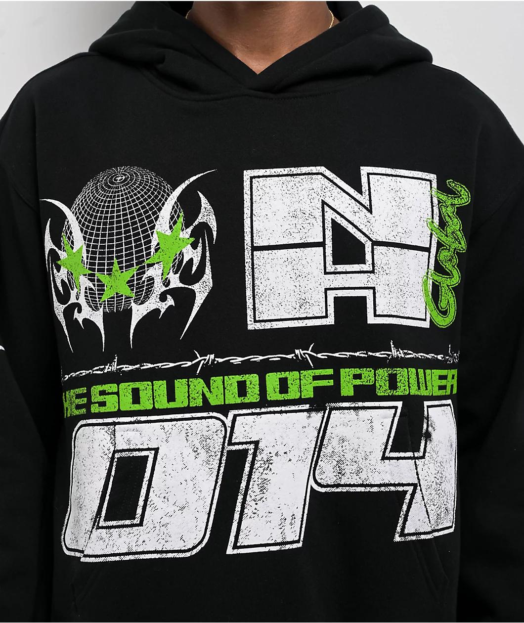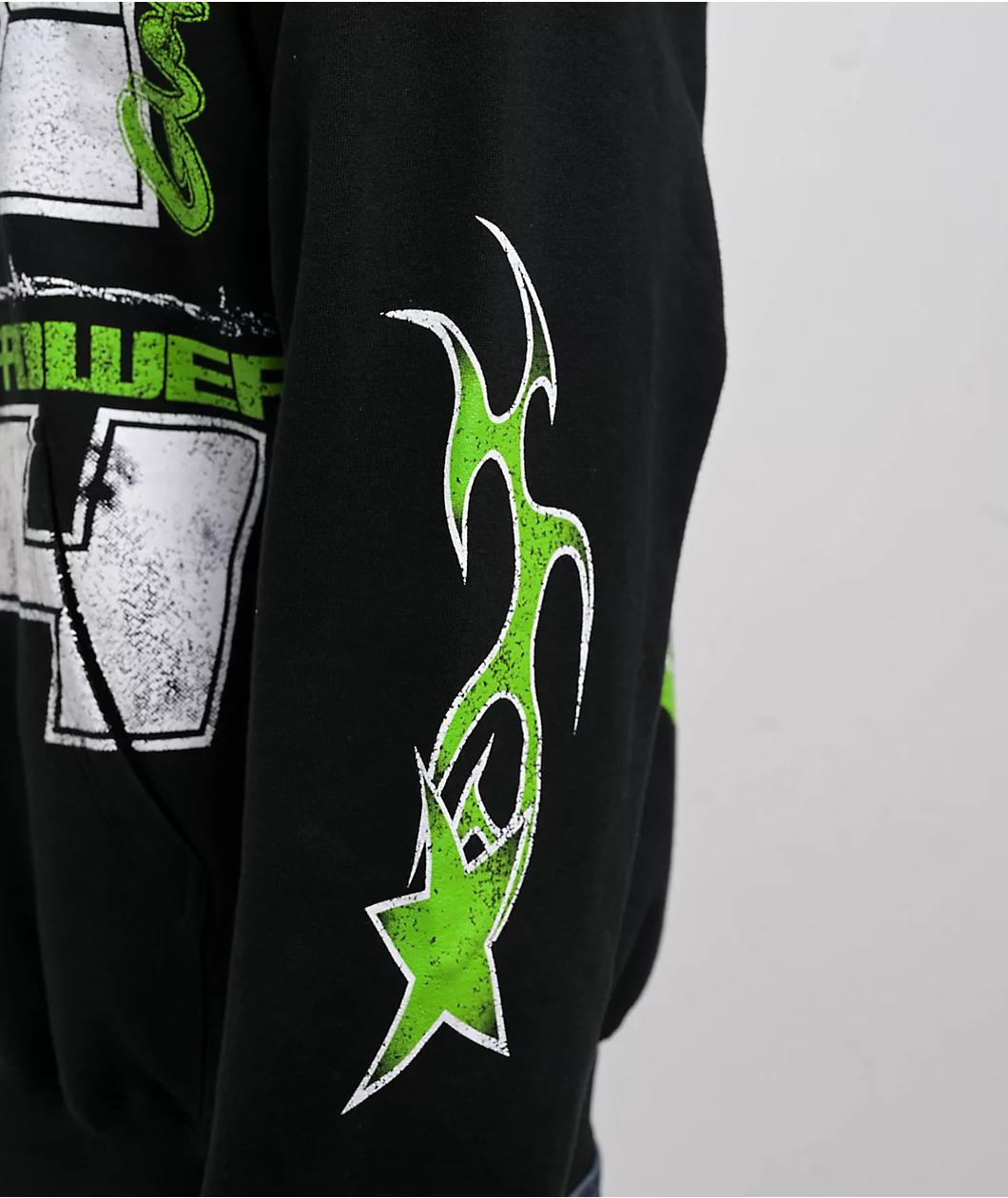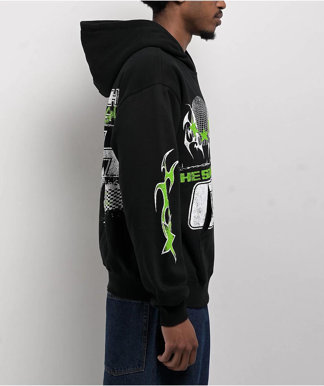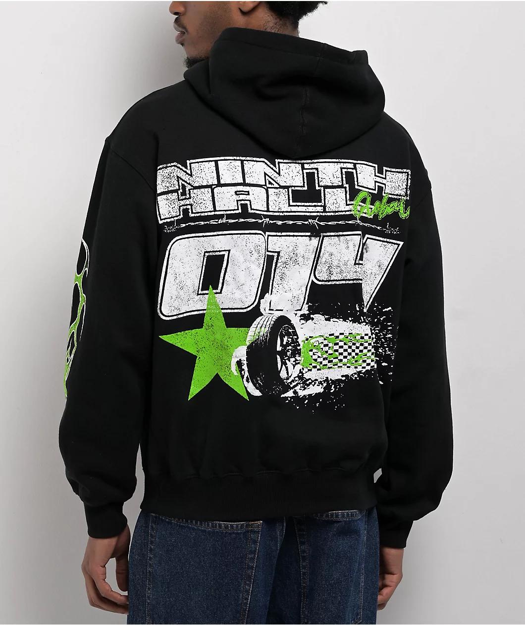 Influenced by racing gear, Ninth Hall presents the Global hoodie in a solid black cotton blend with screen-printed graphics on the front, back, and sleeves. Sporting loud green and white imagery on the front including barbed wire, cyber sigilism acce