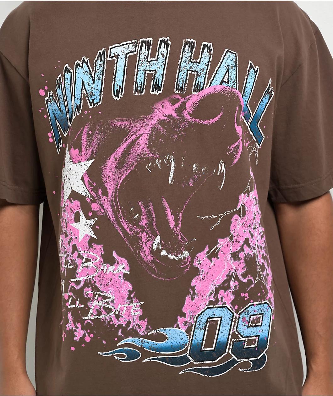 Exhibiting an aggressive scenario with a screen-printed graphic, the Hell Doggie t-shirt is featured in an earthy brown color scheme from Ninth Hall. Titled with arched, bold branding across the chest, a detailed, realistic image of a canine barking