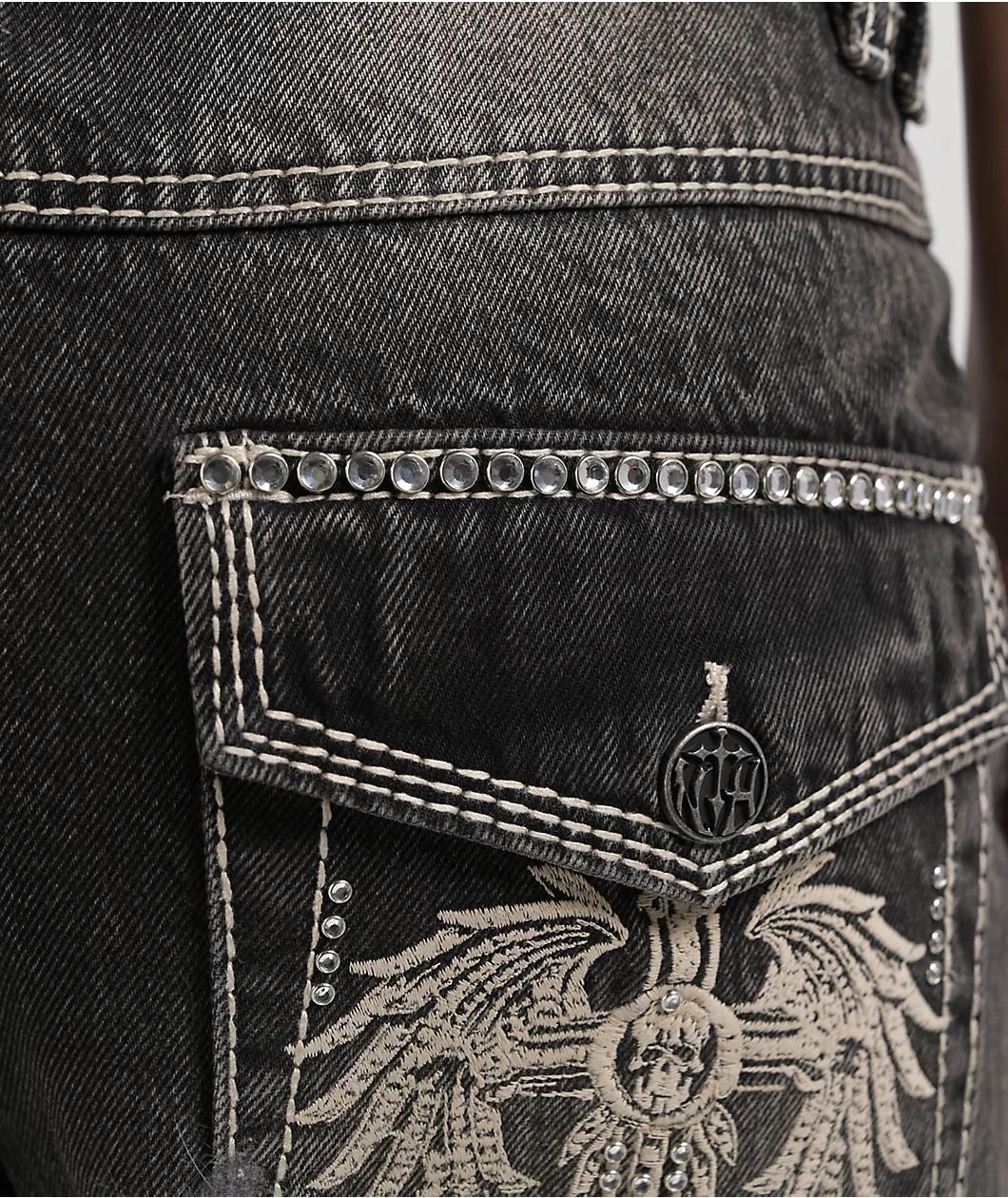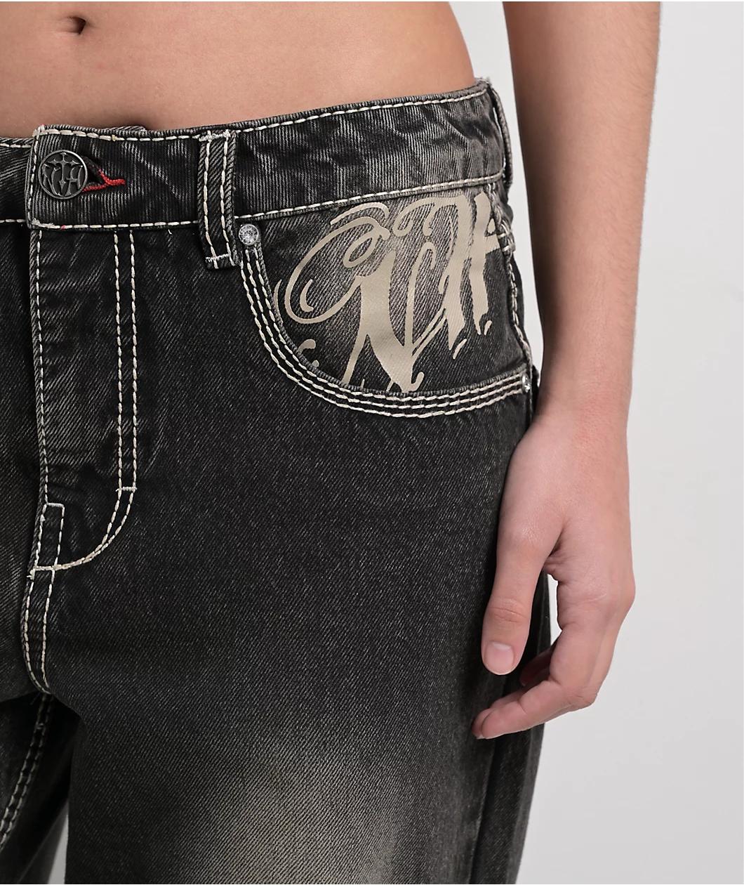 Ninth Hall welcomes the Idle Chapel jeans in a black denim construction with a vintage fade wash treatment and a relaxed, straight leg fit for a nostalgic Y2K look. Framed by bold white contrast stitching throughout, the comfy pants feature shimmerin