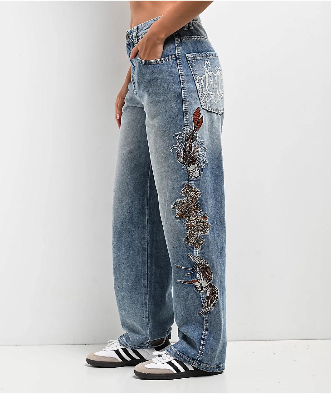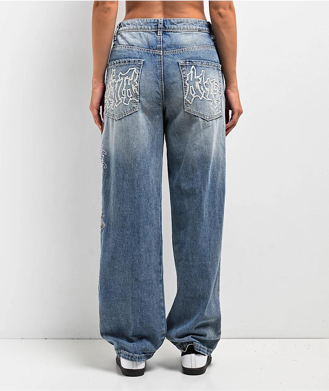 Designed by Ninth Hall with a "Consult" blue denim, the Idle jeans arrive with a straight leg fit and detailed embroidery for a boutique designer look. The streetwear pants feature white contrast stitching throughout, showcasing graffiti branding on