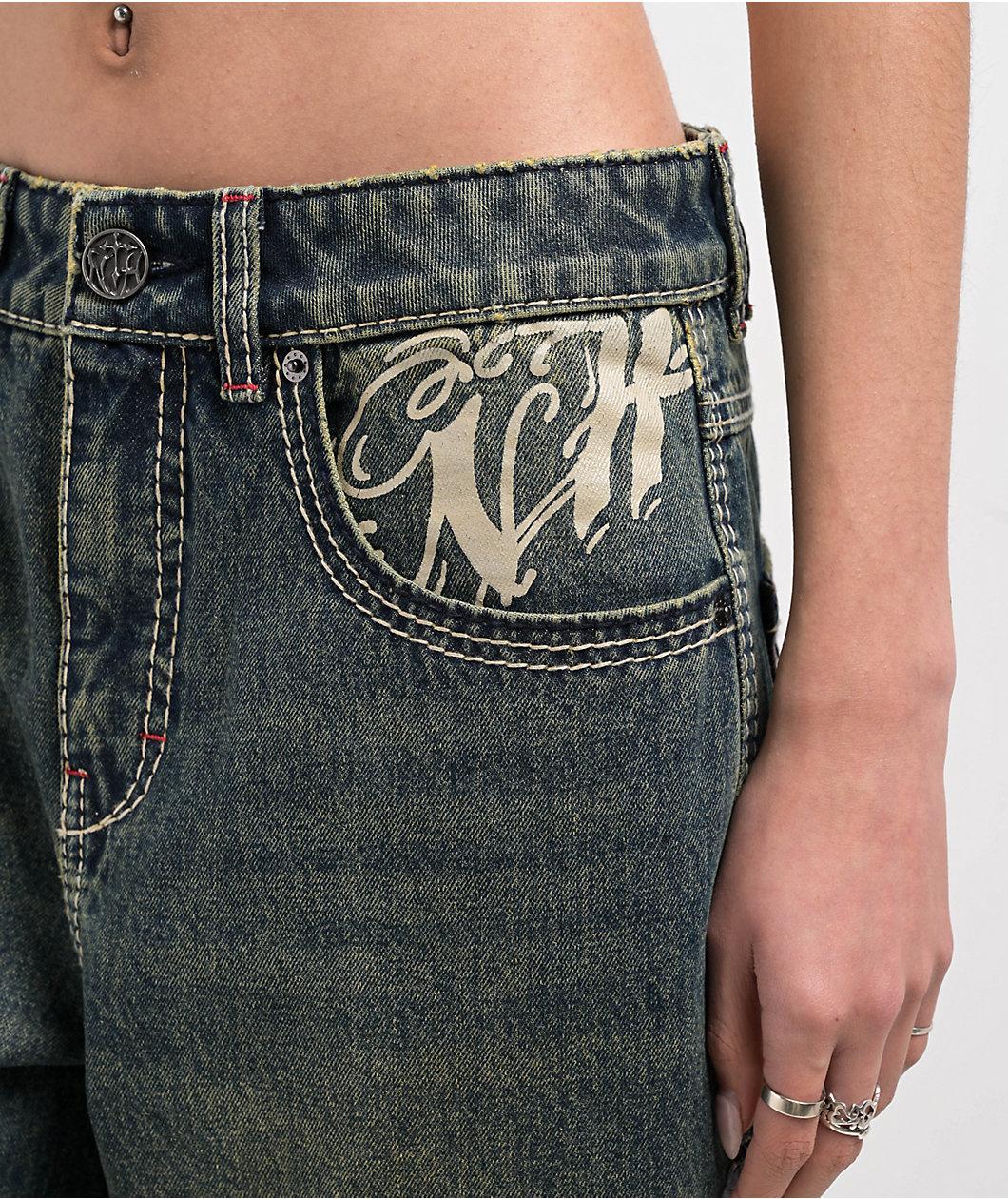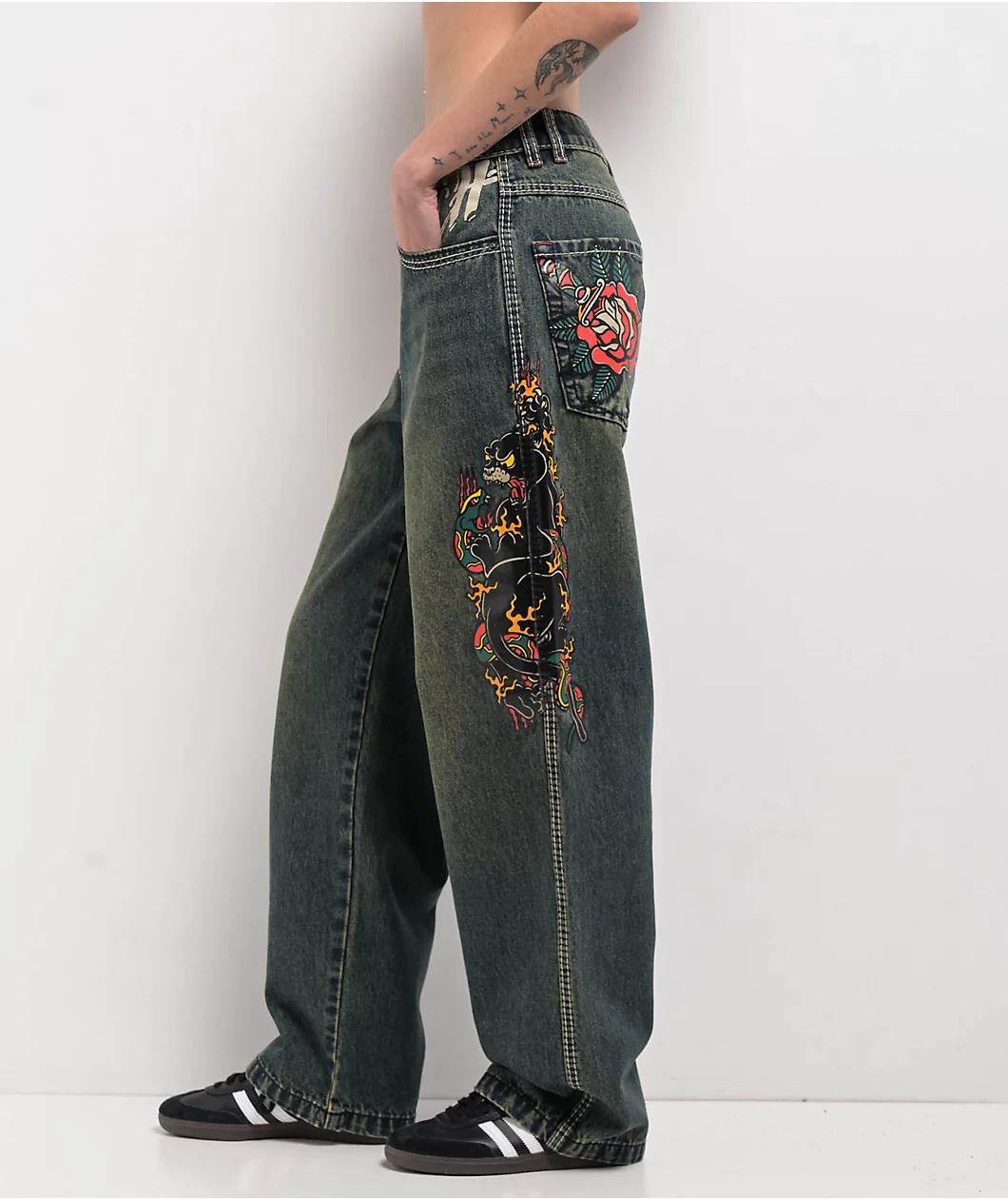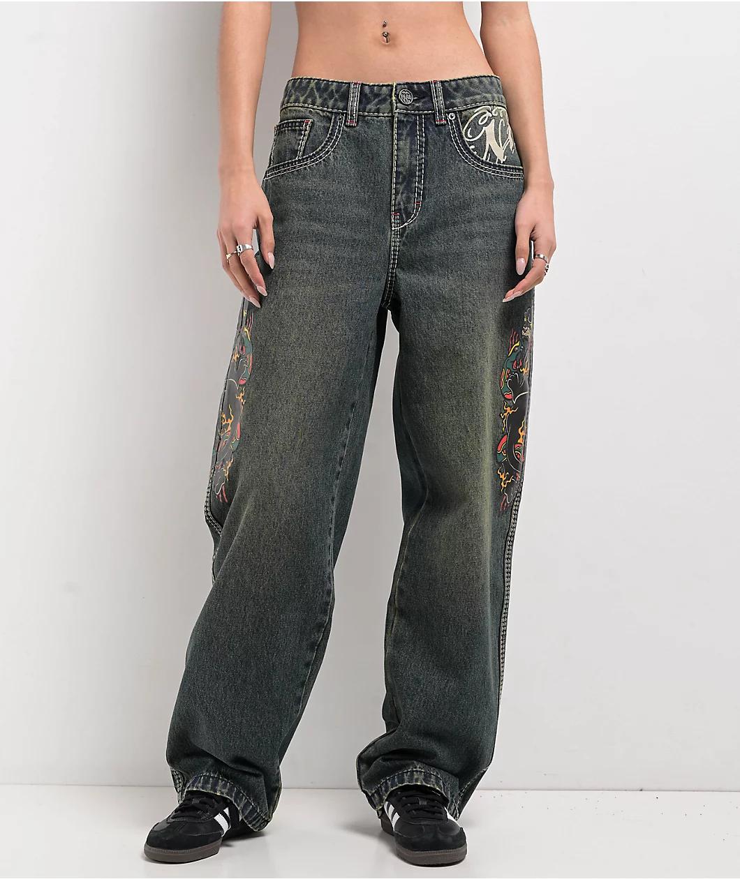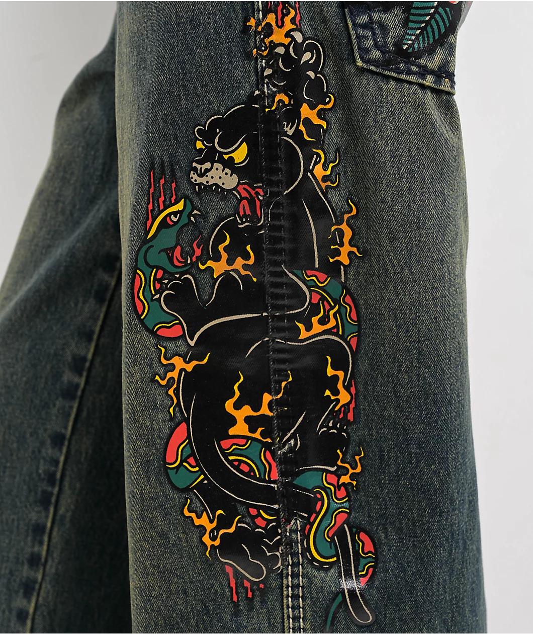 The Idle Envy Cougar Snake jeans arrive from Ninth Hall in a dark blue denim construction with a faded wash and a straight leg fit. Adorned with tattoo-inspired graphics screen-printed on each leg, back pockets, and above the left hand pocket, the de