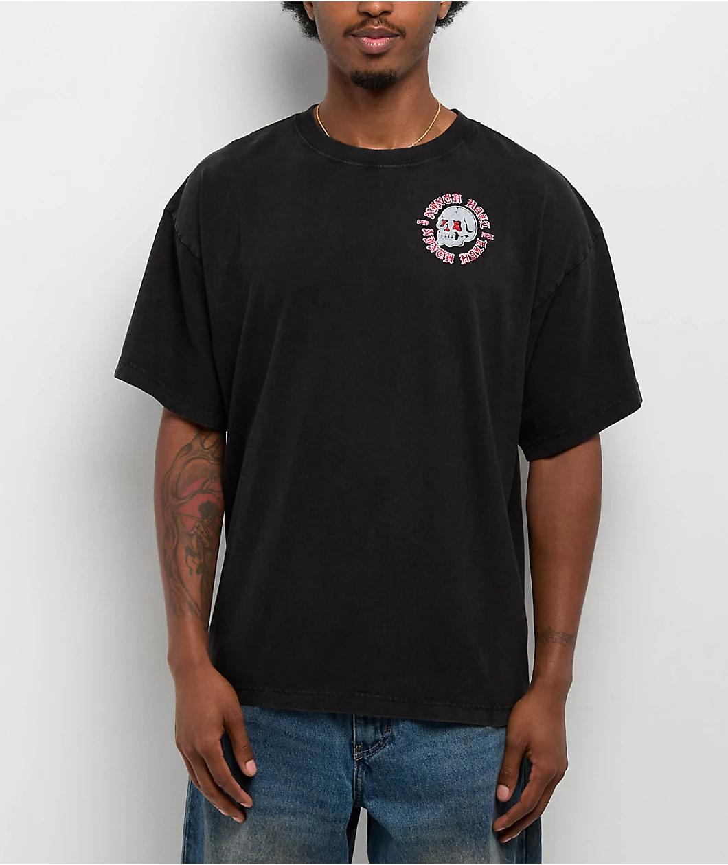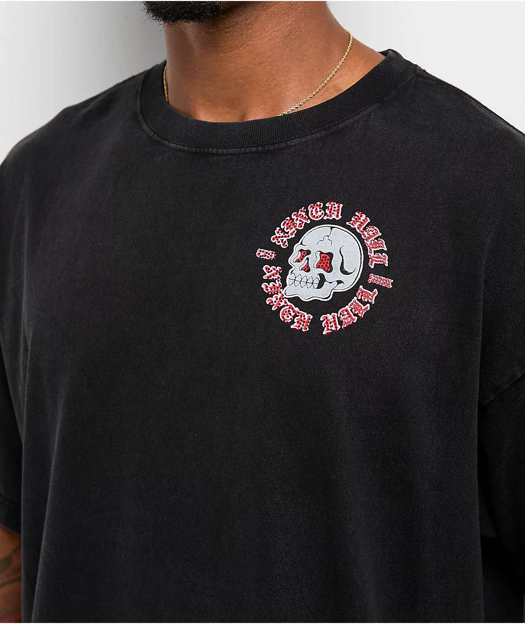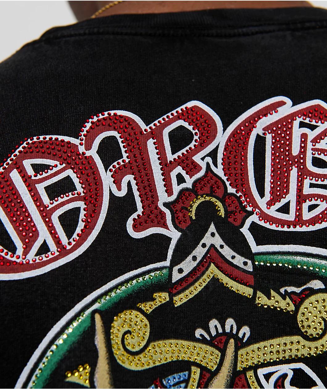 Ninth Hall introduces the Inferno t-shirt in a washed Vintage black for a relaxed look. Red rhinestones adorn branding on the left chest, with additional rhinestones accents tattoo-inspired dragon artwork on the back. Made from 100% cotton, the boxy