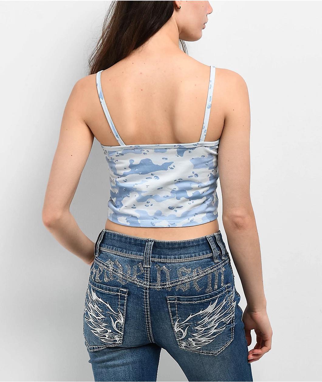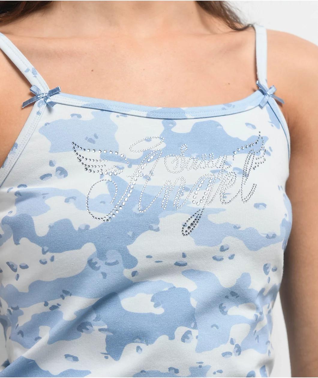 Ninth Hall welcomes the Kerri Angel tank top in a cropped, slim fit with a printed blue camouflage pattern and rhinestone text on the front. Adorned with cute ribbon bows on the front for coquette accents, the shimmering rhinestone text reads "Sassy