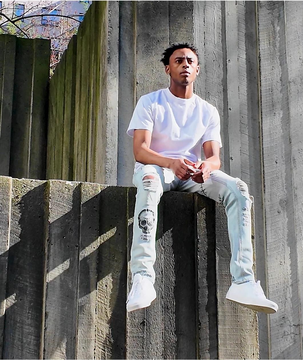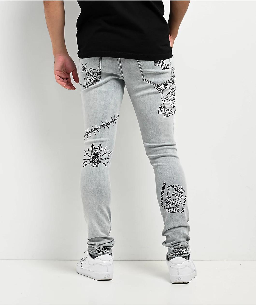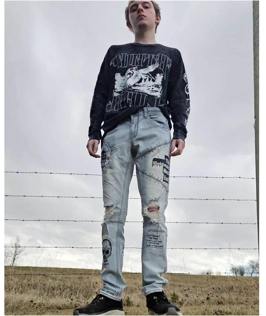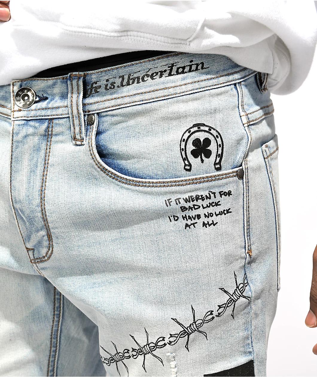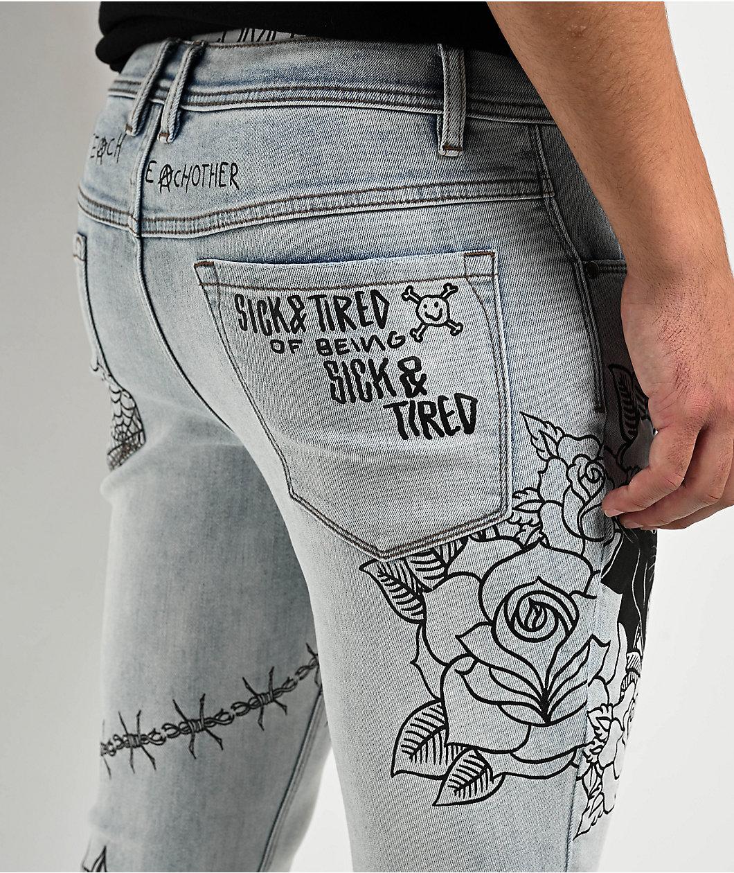 Toss some DIY style into your jeans collection with the Ninth Hall Rogue Printed light aged skinny jeans! These light blue wash jeans feature various graphics printed throughout in a scribbly, marker style for a custom look. A horseshoe and clover, barbed