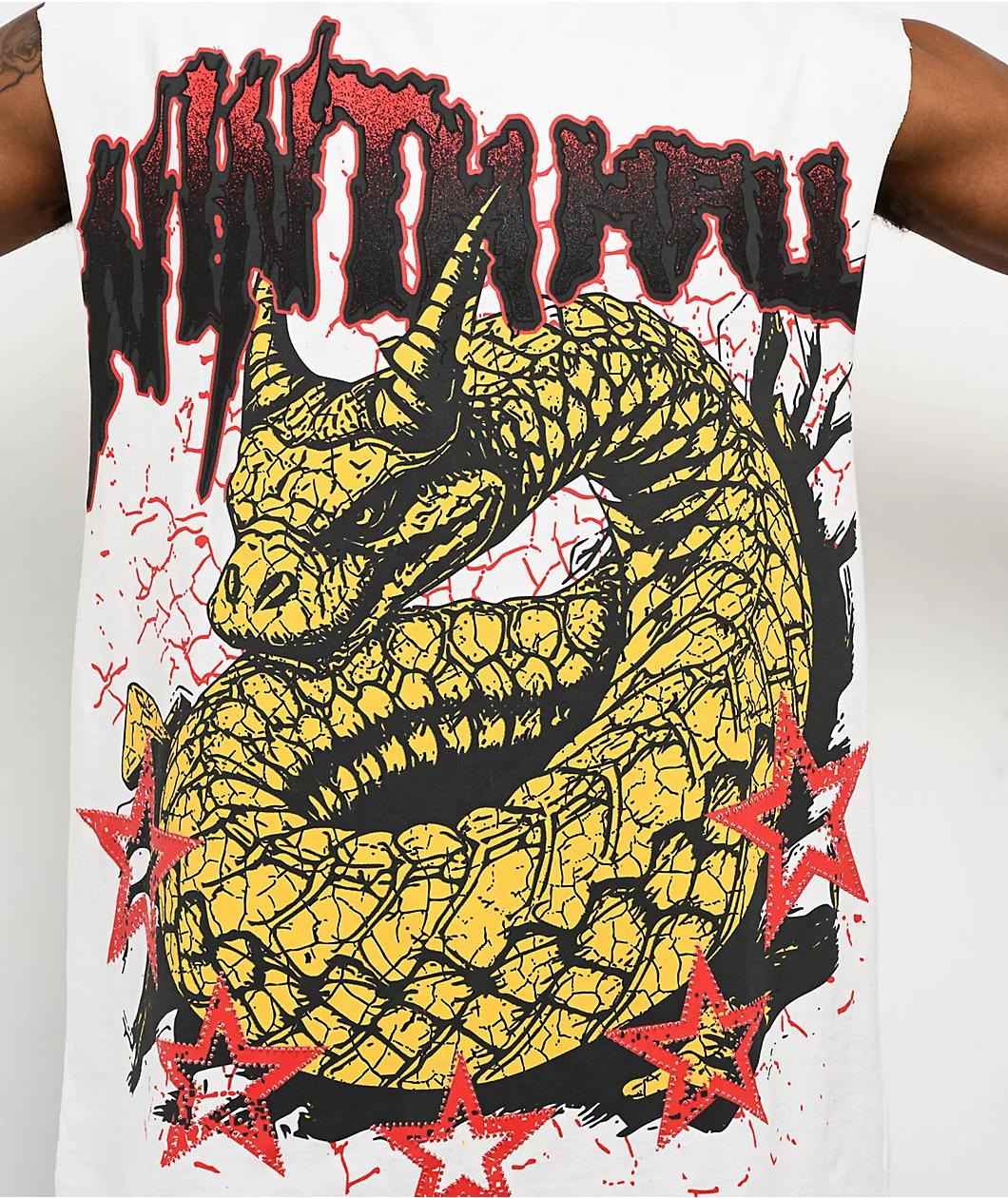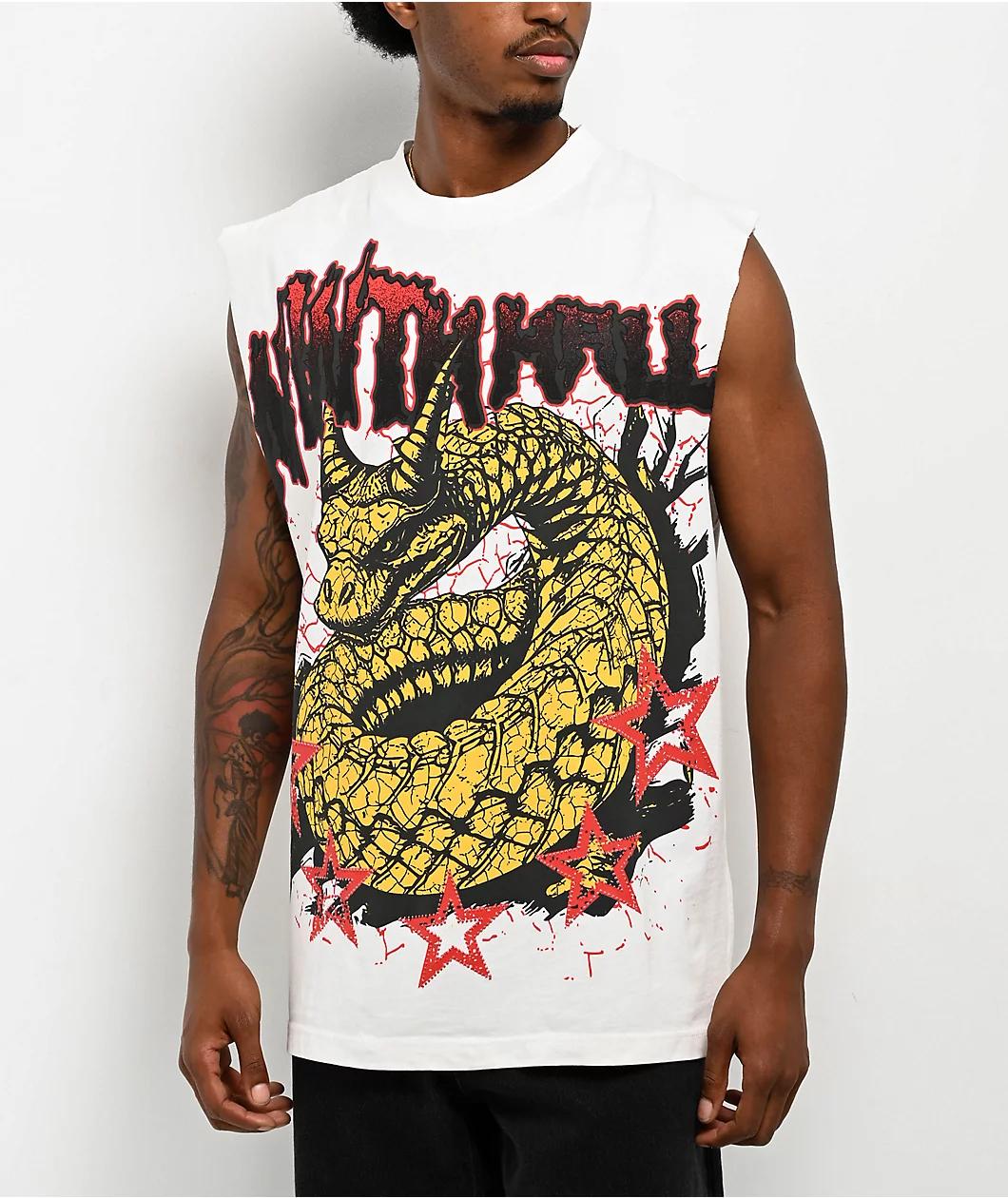 Add bold modern flair to any outfit with the Snarky tank top arriving in white from Ninth Hall. Artwork of a yellow dragon surrounded by red and black branding adorns the top of the muscle tee for a tough look furthered by unfinished arm openings. A
