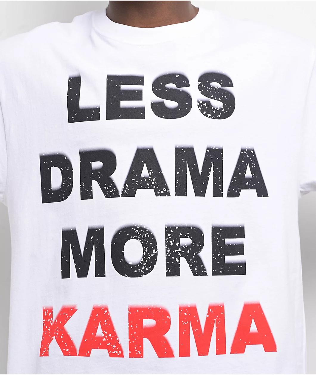 Express your desire for payback in the world with the Statement t-shirt from Ninth Hall. Bold black text across the front reads "Less drama more karma", with "Karma" being red for an eye-catching pop of color. A comfortable printed neck label ensures