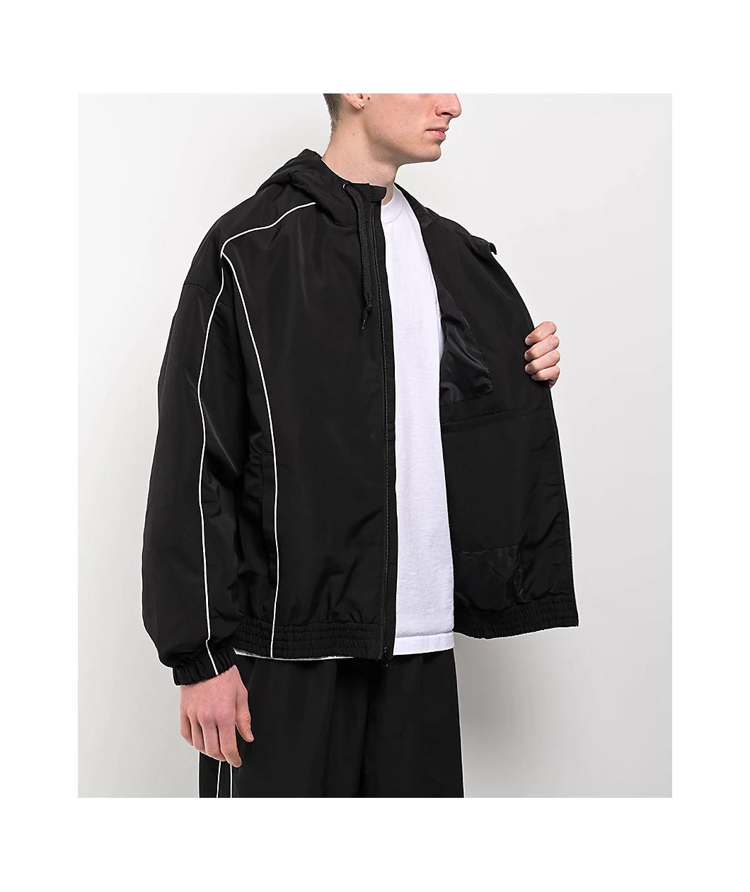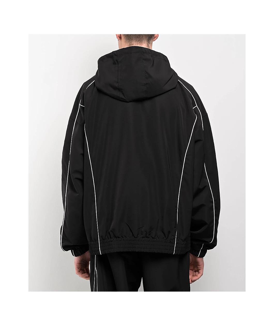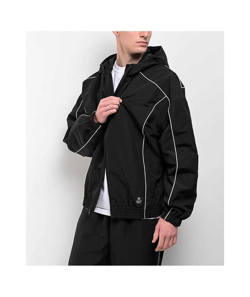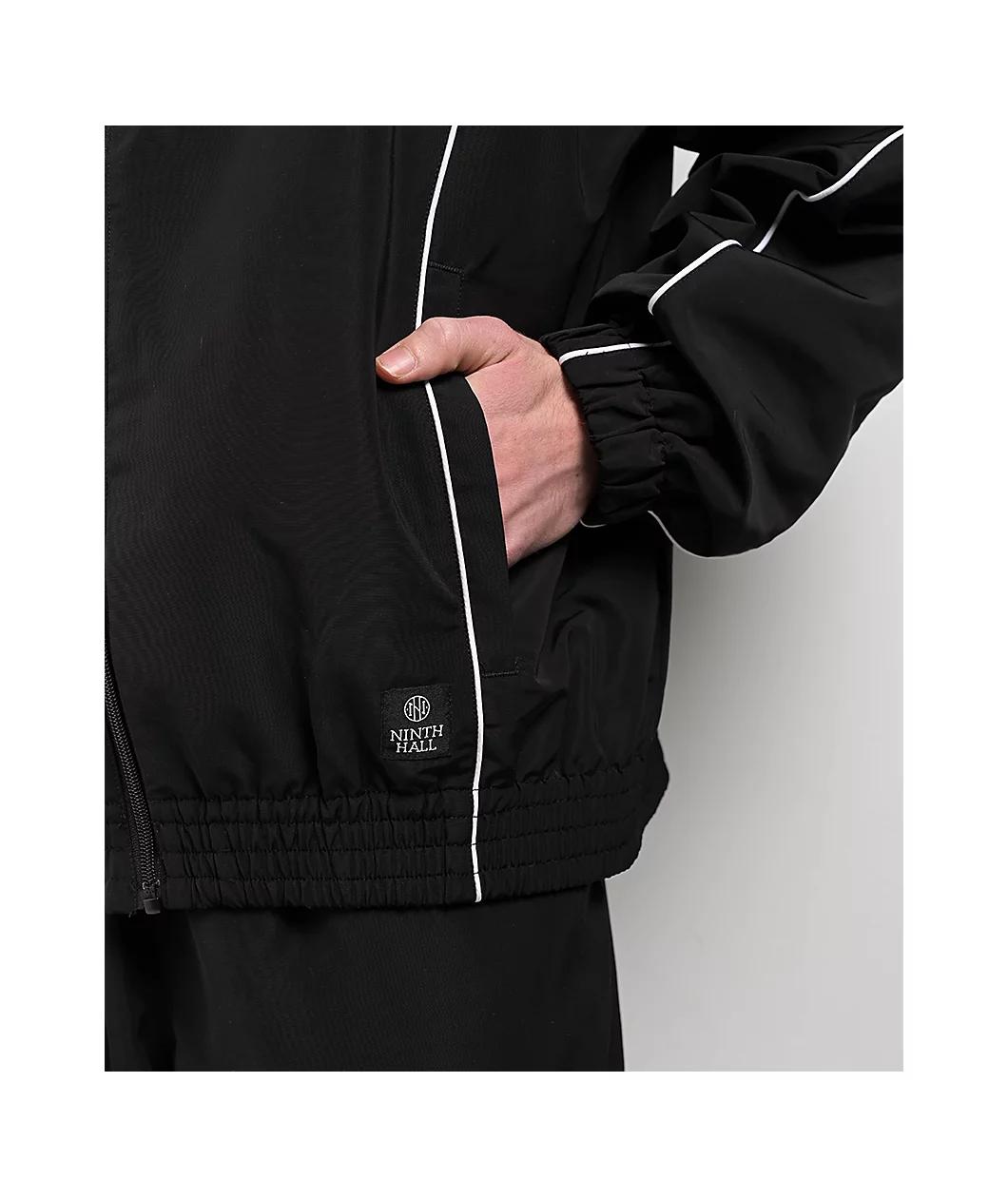 From the minds at Ninth Hall, the Vessel jacket arrives in a solid black polyester build with a subtle, yet eye-catching design using white piping details throughout for a timeless, athletic look. Fully lined for added warmth, the lightweight coat em