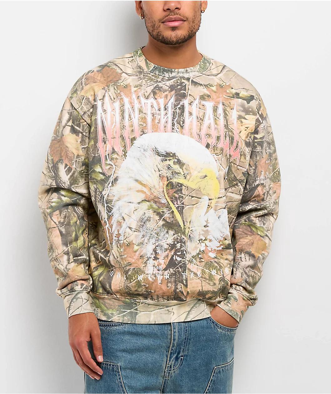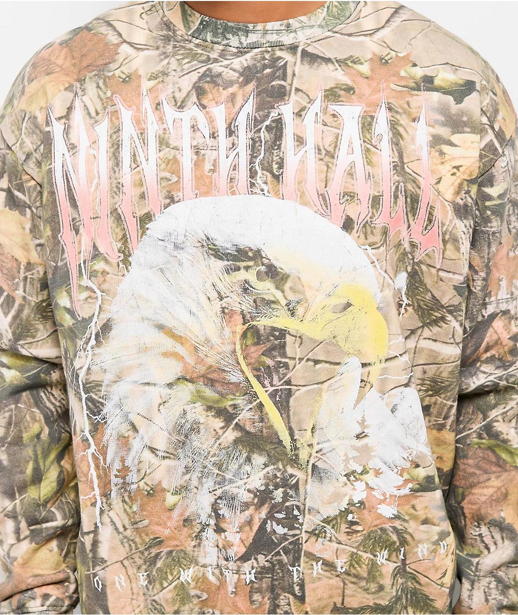 Streetwear label Ninth Hall presents the With The Wind crewneck sweatshirt embellished with a unique camouflage pattern for an outdoorsy vibe. A cracked vintage-inspired graphic decorates the front of the tee, depicting branding, lightning, and a bal
