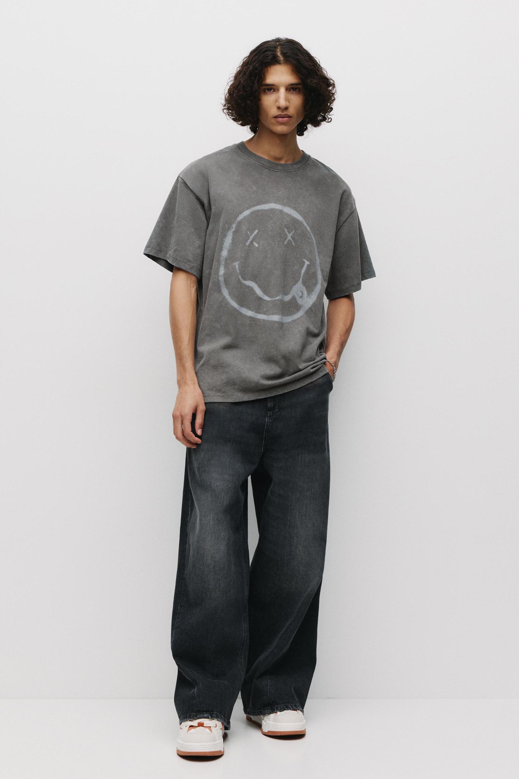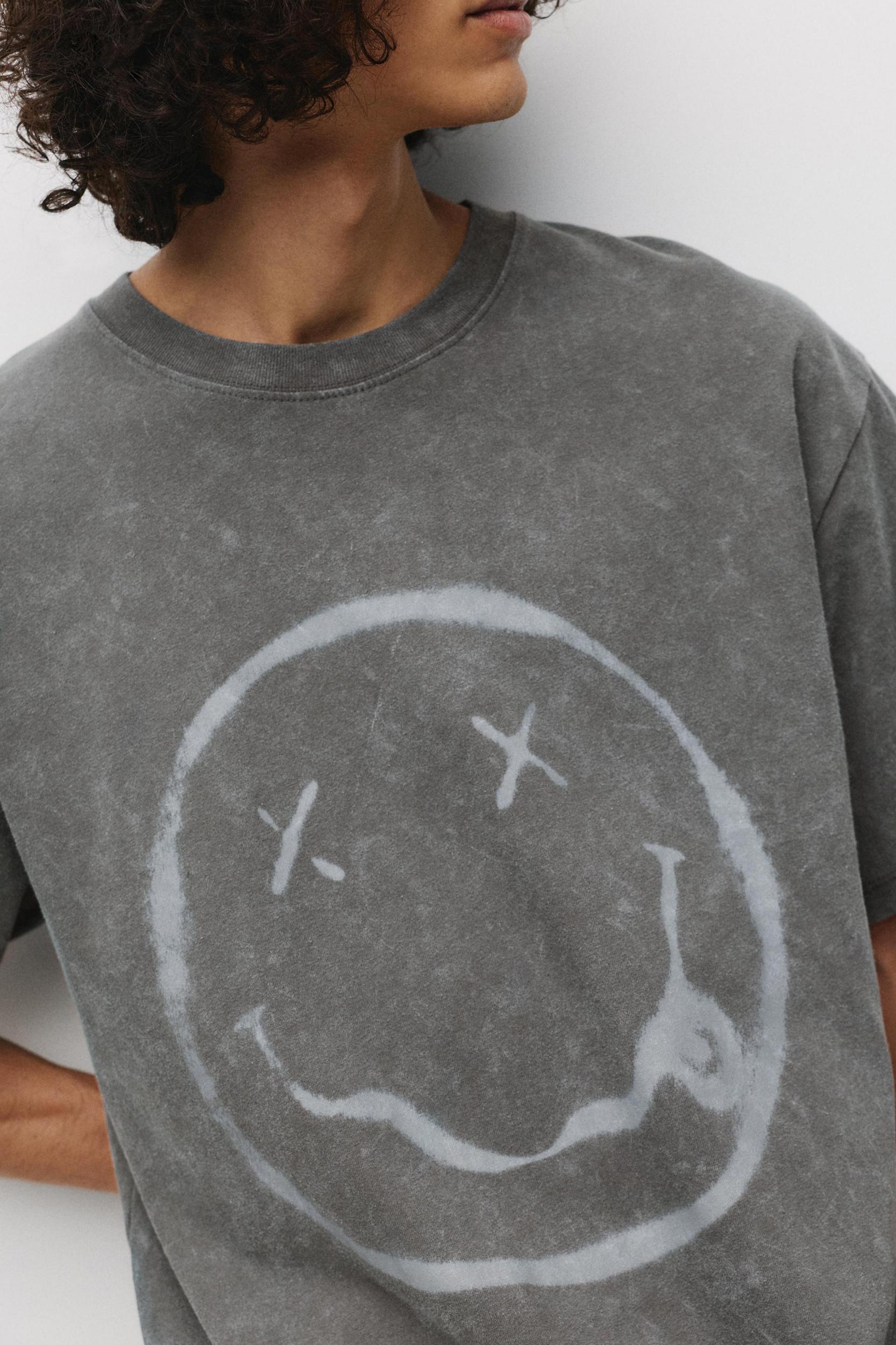 Grey Nirvana licensed short sleeve T-shirt with Smiley graphic and round neck.