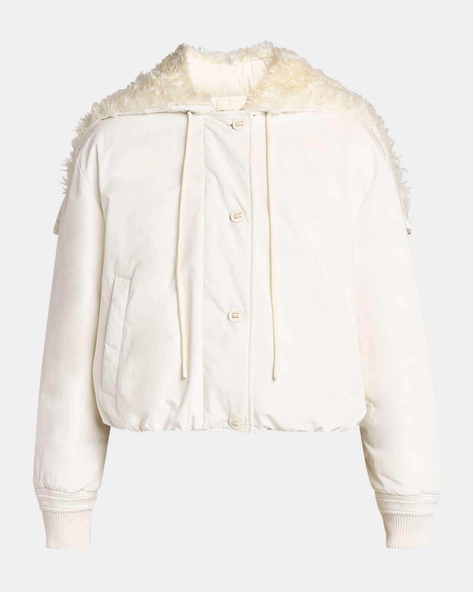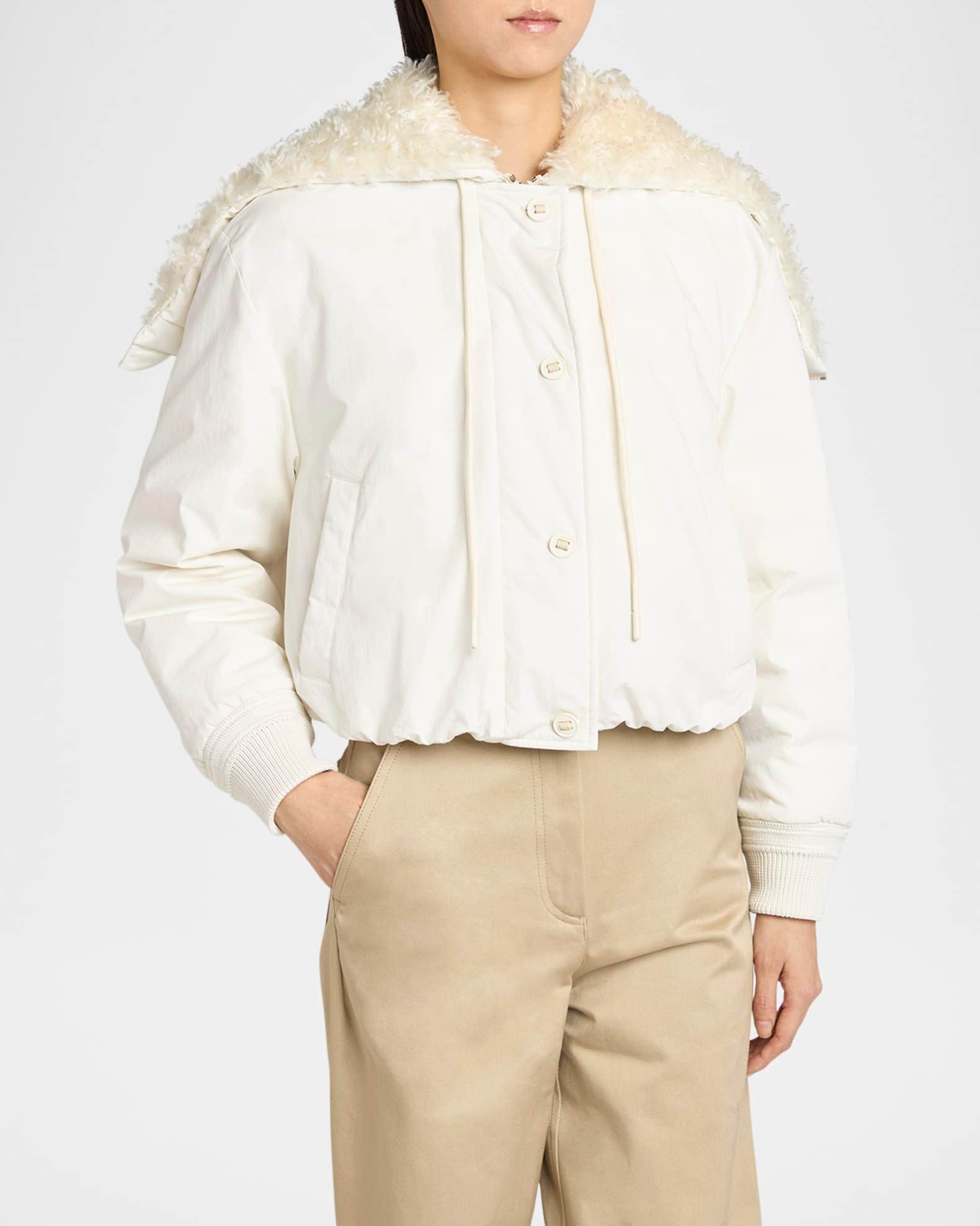 Moncler "Nisiro" bomber-style puffer jacket elevated with a wide faux-fur (nylon) collar for a touch of elegance Long sleeves with rib-knit cuffs Side slip pockets Relaxed fit Adjustable drawcord hem Two-way zip-front with button placket Cotton/nylon/polyamide Fill: Down/feather Lining: Polyester/acrylic/wool Hand wash Made in Italy