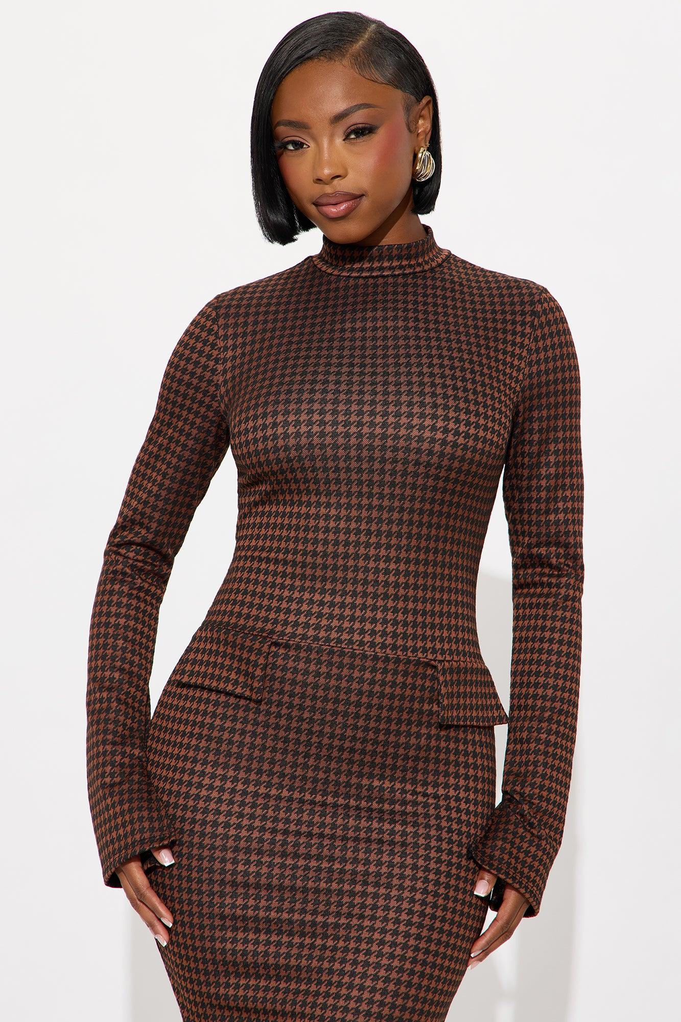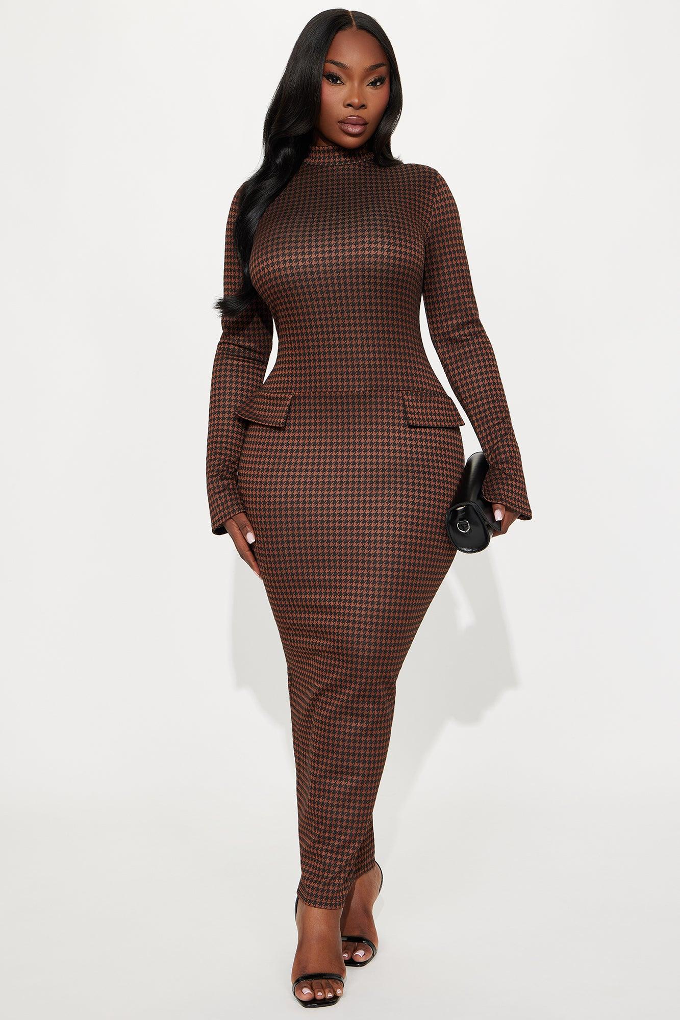 Available In Rust/combo. Houndstooth Print Maxi Dress Mock Neckline Long Sleeve Front Pocket Detail Back Slit Hidden Back Zipper Stretch Self : 97% Polyester 3% Spandex Imported California Proposition 65WARNING: Cancer and Reproductive Harm - www.P65Warnings.ca.gov.
