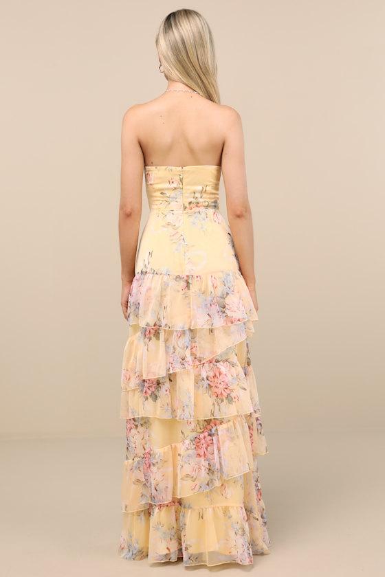 This floral chiffon dress is all about effortless enchantment, thanks to a sweeping maxi silhouette that will easily sway with your every step. The strapless bodice boasts a sweetheart-style neckline and a fitted waist, all atop a chic column skirt accented with cascading asymmetrical tiers. Hidden back zipper/clasp.