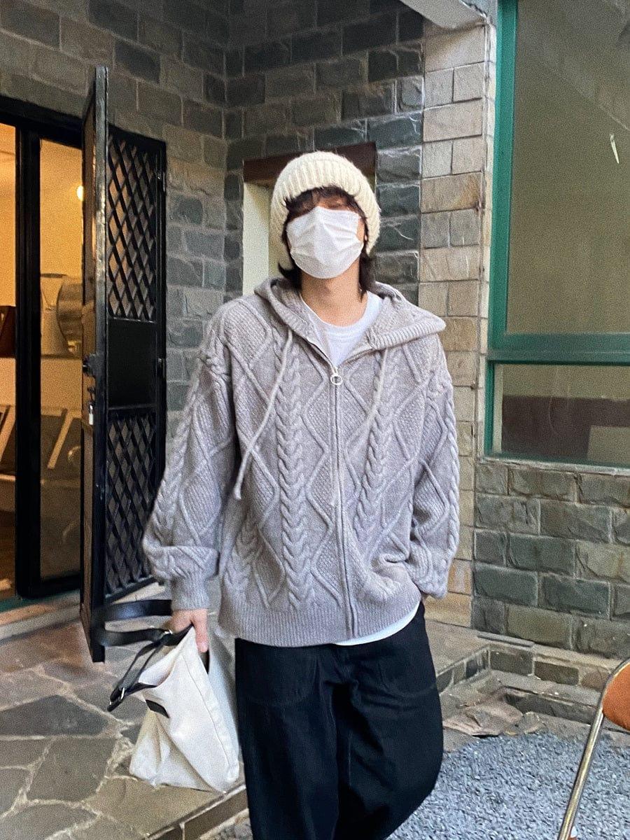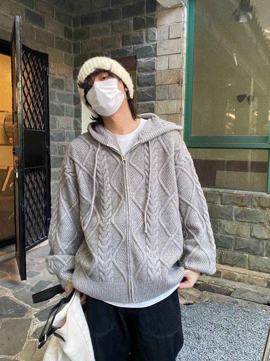 Model is 5ft 8.9''(175cm) tall, 122 lbs(55kg) weight and wearing a size M - Gray- Knitted- Zip-Up- Hooded