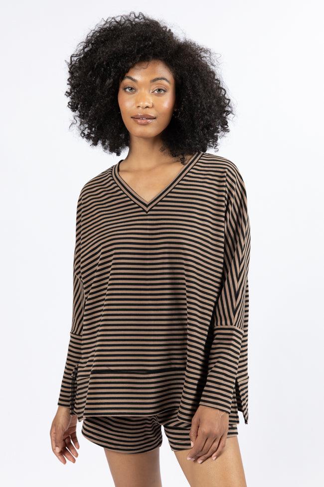 Details Mocha and Black Striped Top Fabric is stretchy Side slits, V-neck Unlined Size small from shoulder to hem: 25" Material and Care 96% polyester 4% spandex Machine wash cold, no drum drying Patterns may vary Materials may have natural variations Colors may vary from different viewing devices.