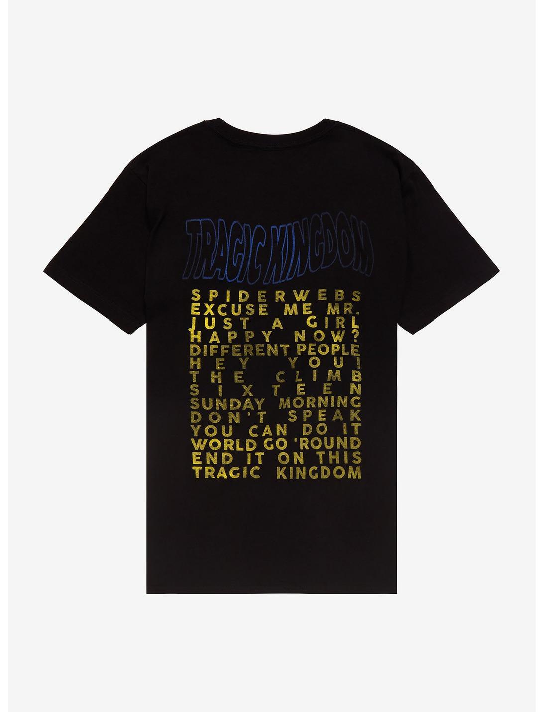 Covered in spiderwebs? Change into a fresh No Doubt tee! This one features a photo of the band during their iconic Tragic Kingdom era, with the band name and hometown of Anaheim, California, below.100% cottonWash cold; dry lowImportedListed in men's/unisex sizes