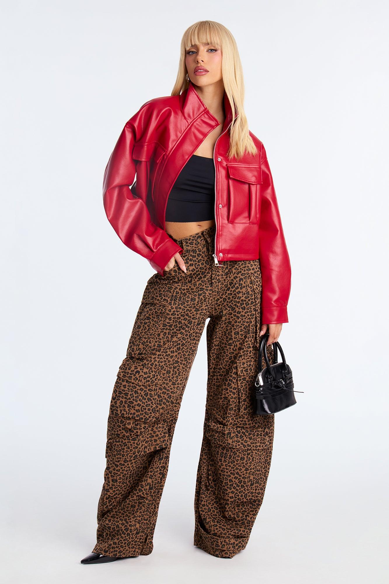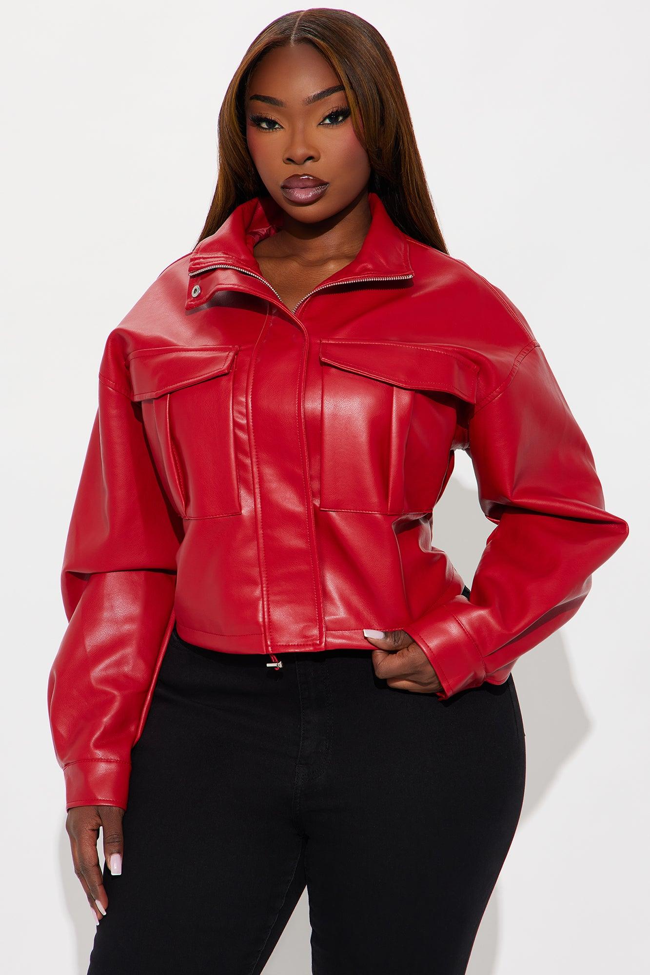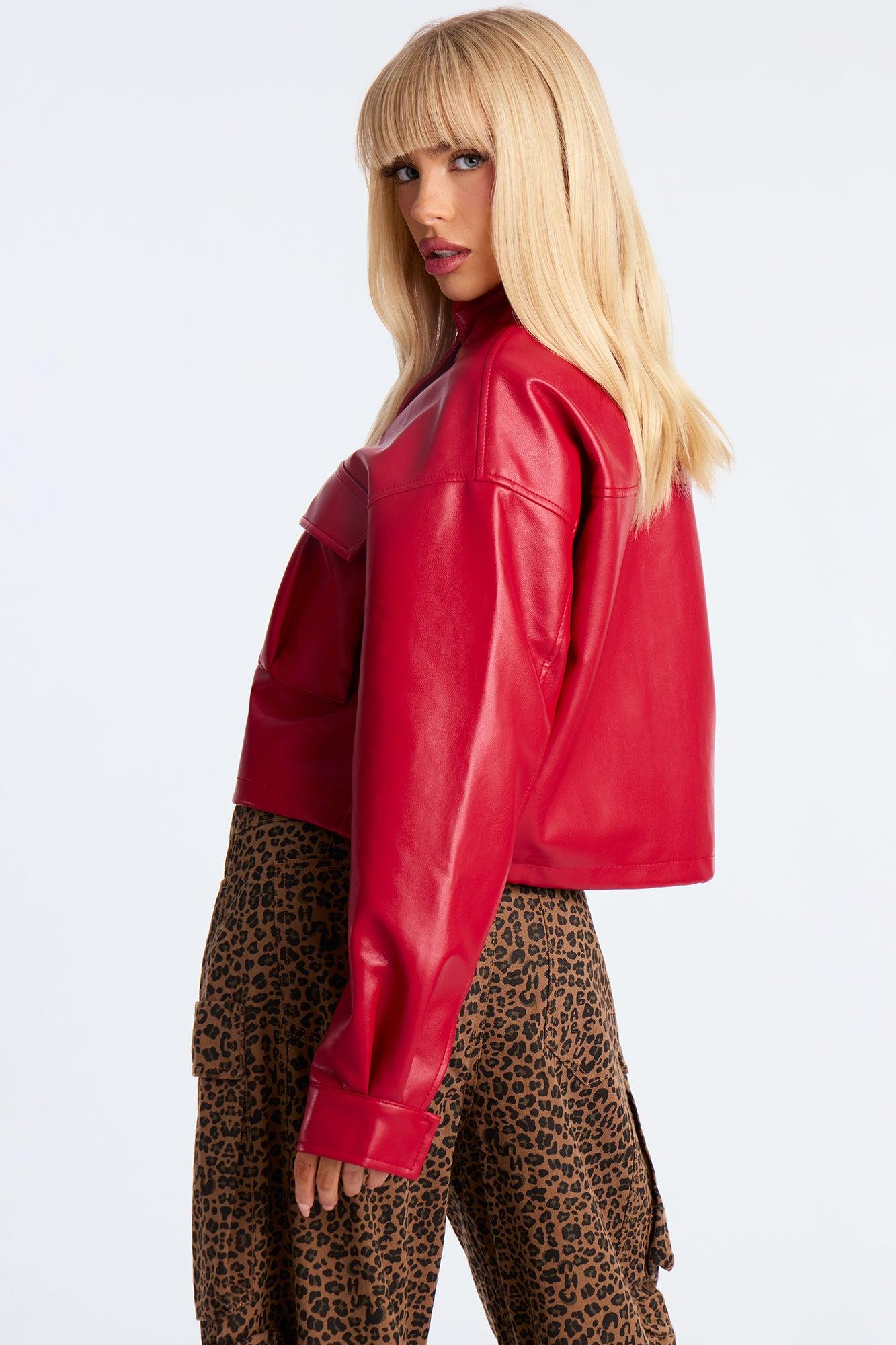 No Hard Feelings Faux Leather Cropped Bomber Jacket - DarkRed Female