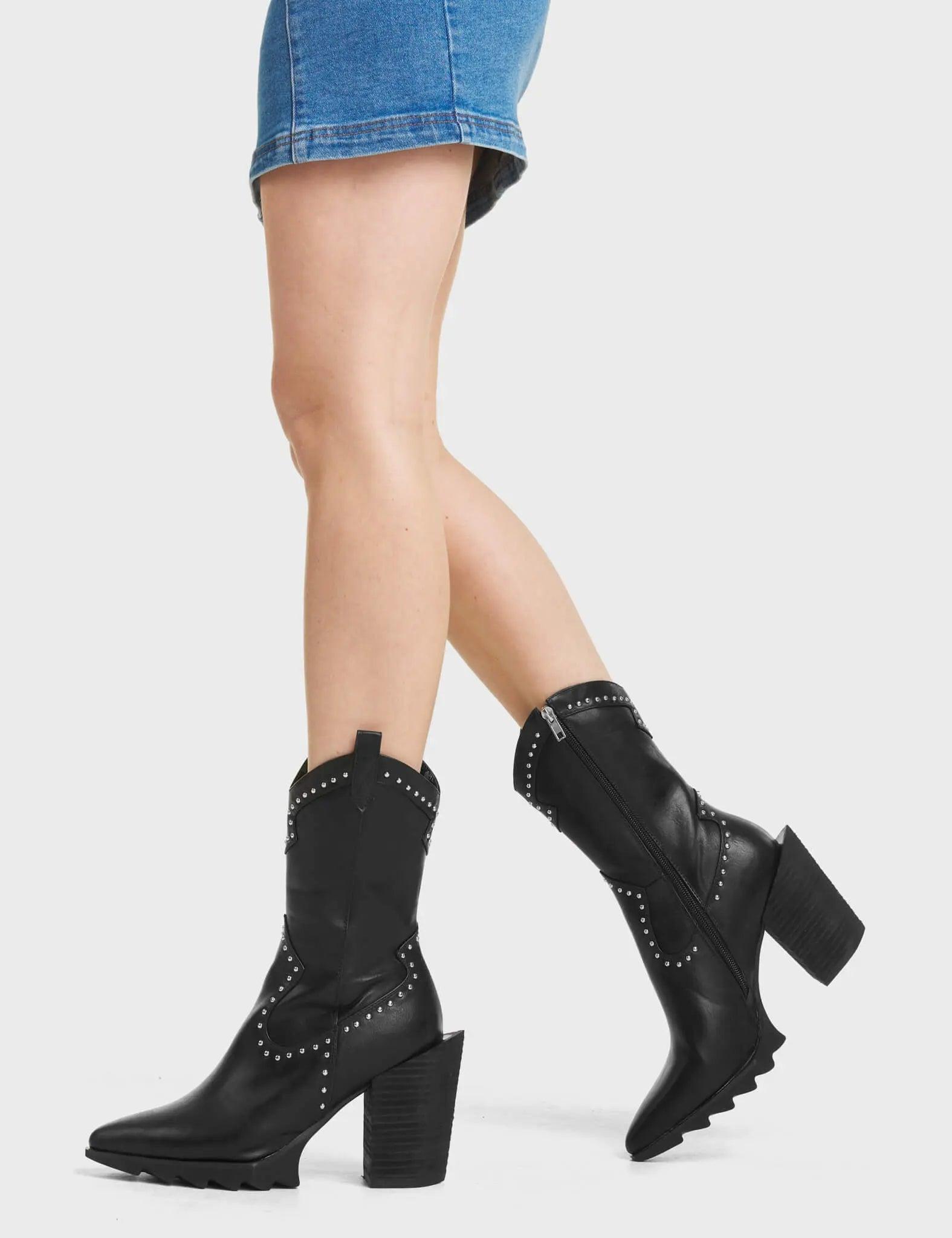 MY STORYNo Insecurities Western Ankle Boots in Black. These western boots feature silver studs and a pull tab on the side of the Boots. Made with eco-friendly materials and 100% cruelty-free.- Platform Height- Black Tassles- Black Zip- Pointed Toe- Western block heel- 100% veganSKU: LMF 5513 - BlackPU