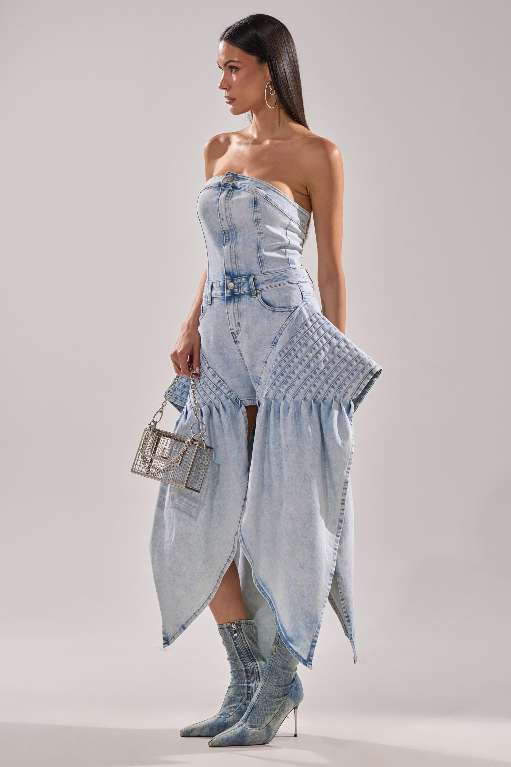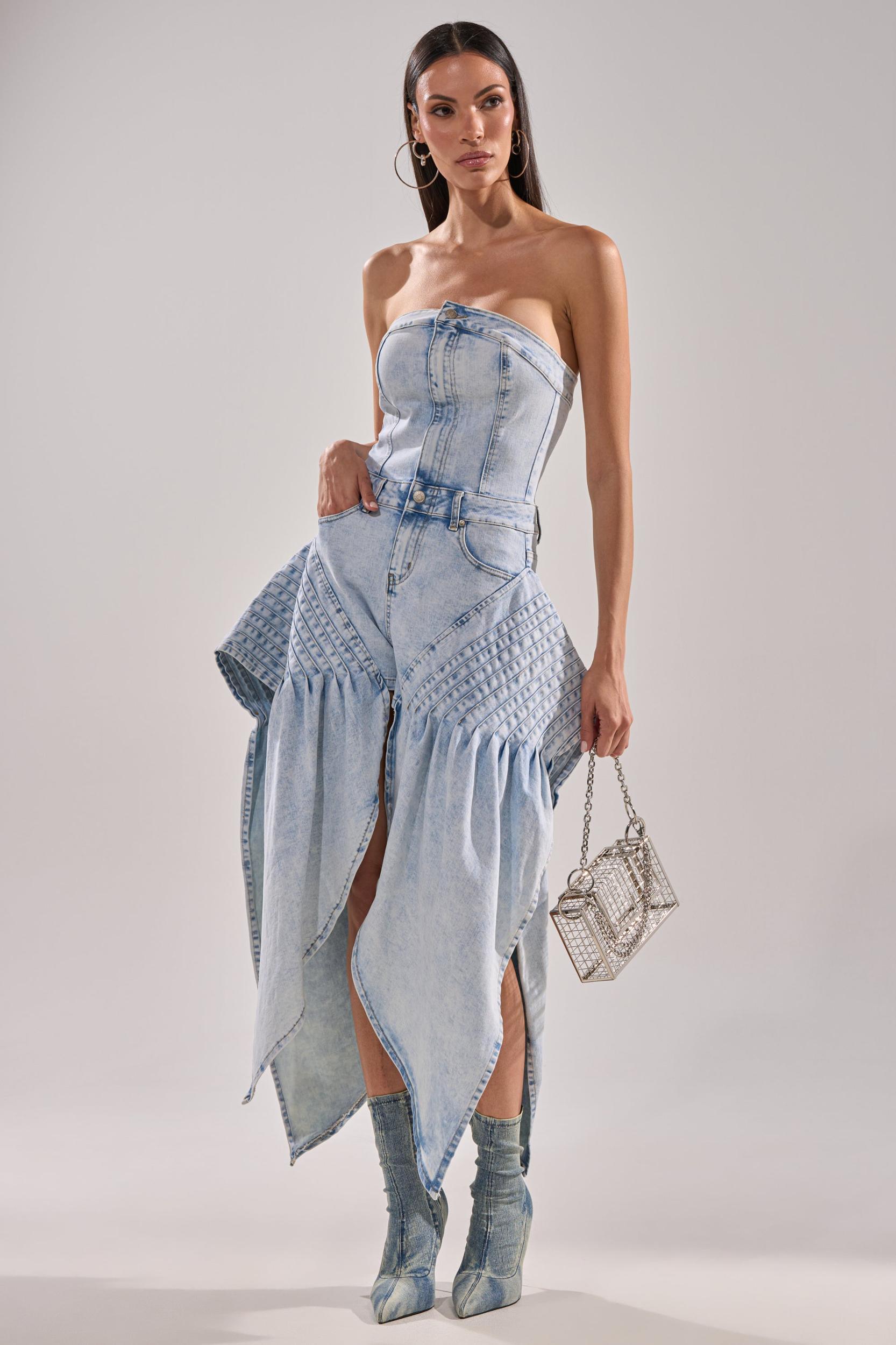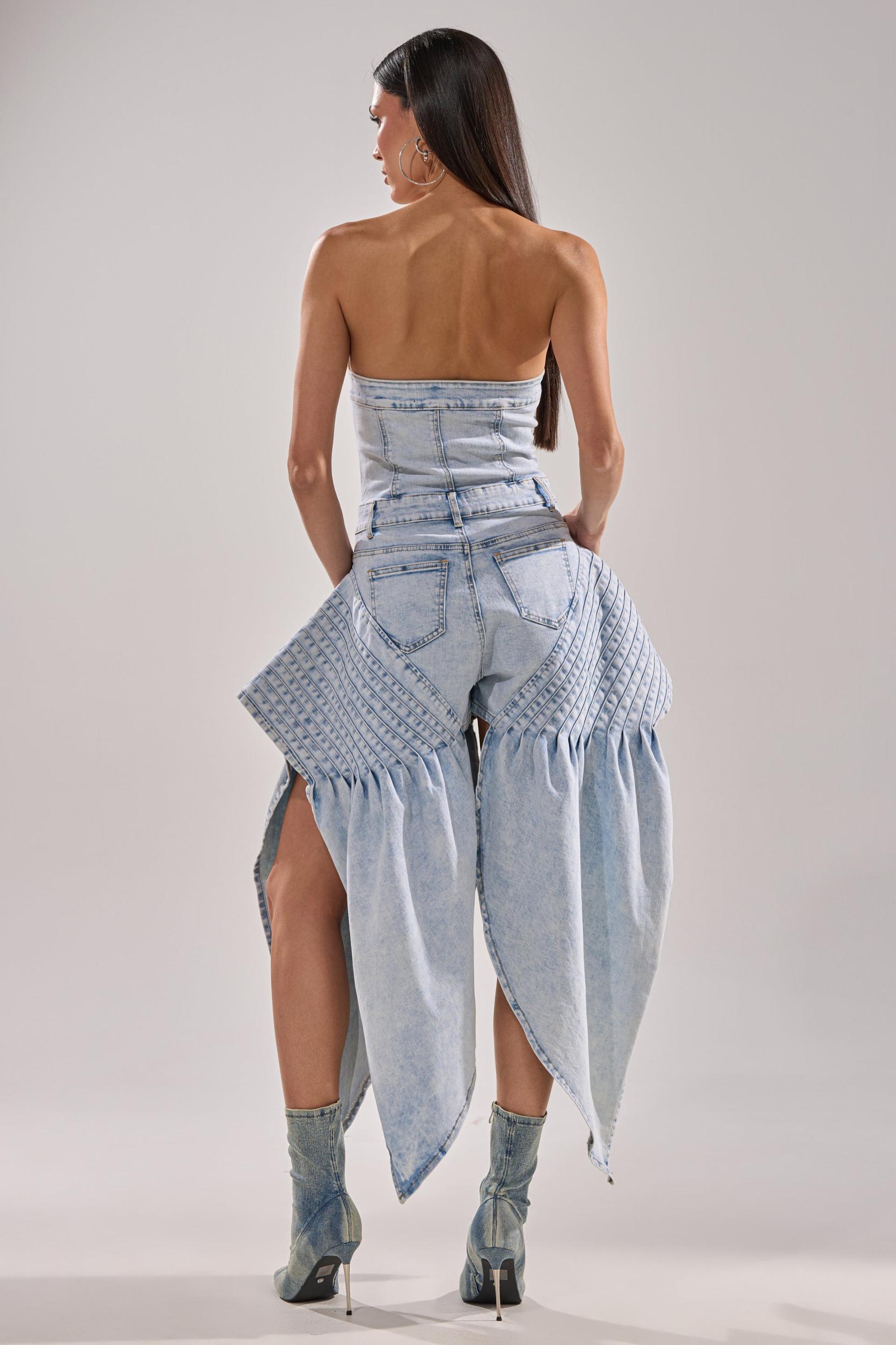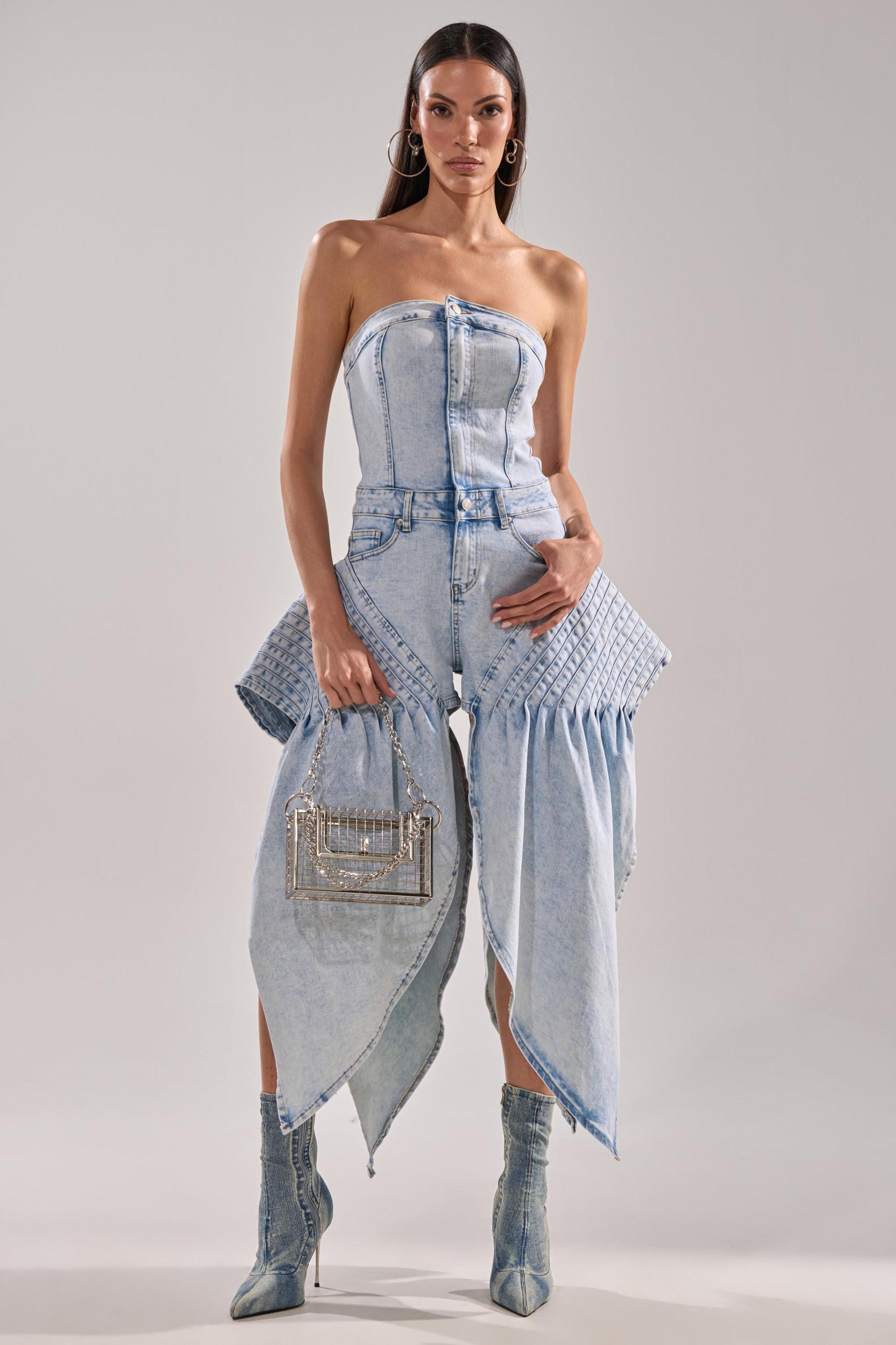 This isn’t your average romper. The AKIRA Label No One Like Me Denim Romper is a show-stopping one-piece crafted from light-wash denim with dramatic pleated paneling that cascades into exaggerated, petal-like overlays. The structured, strapless bustier top flatters the silhouette while high-cut slits and tailored shorts underneath balance edge and elegance. Finished with classic five-pocket styling, exposed seamwork, and a zip-button front closure, it’s the definition of avant-garde denim. - 78% Cotton, 20% Polyester, 2% Spandex- Stretchy- Imported (all measurements approximate from size small)- 23” Chest to Shortest Hem- 2” Inseam- 50” Chest to Longest Hem- Model is 5’9” and wearing a size smallProduct ID: 1043491 (all measurements approximate from size 1X)- 26” Chest to Shortest Hem- 2.5” Inseam- 54” Chest to Longest HemProduct ID: 1043495