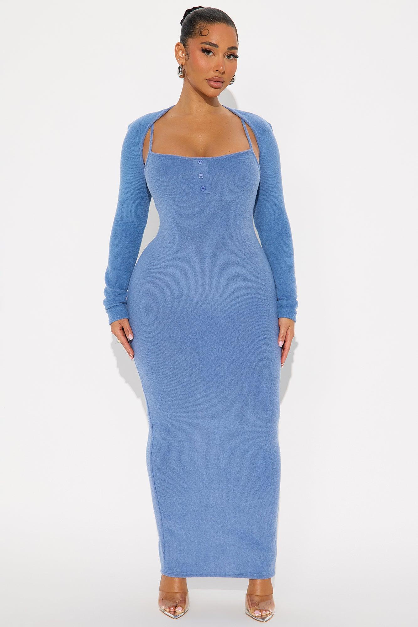 Available In Dusty Blue. 2 Piece Maxi Dress Bolero Maxi Dress Spaghetti Straps Straight Neckline Button Front Detail Back Slit Stretch Self: 65% Polyester 32% Rayon 3% Spandex Imported California Proposition 65WARNING: Cancer and Reproductive Harm - www.P65Warnings.ca.gov.
