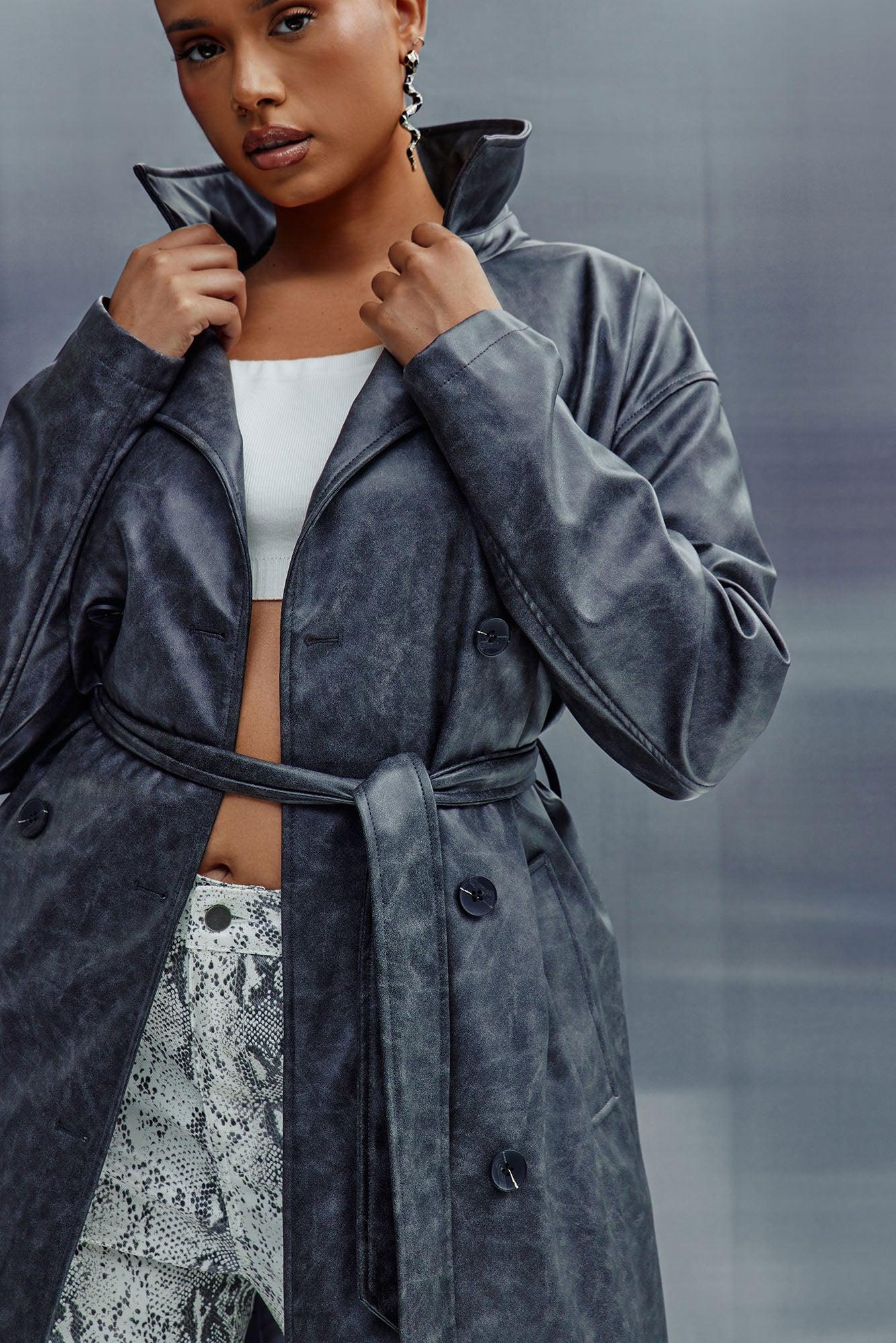Available In Charcoal. Trench Coat Lapel Collar Long Sleeve Faux Leather Belted Washed Fully Lined Disclaimer: Due To The Specialized Wash Process, Each Garment Is Unique. Shell/Coating: 100% Polyurethane Backing/Lining: 100% Polyester Imported California Proposition 65WARNING: Cancer and Reproductive Harm - www.P65Warnings.ca.gov.
