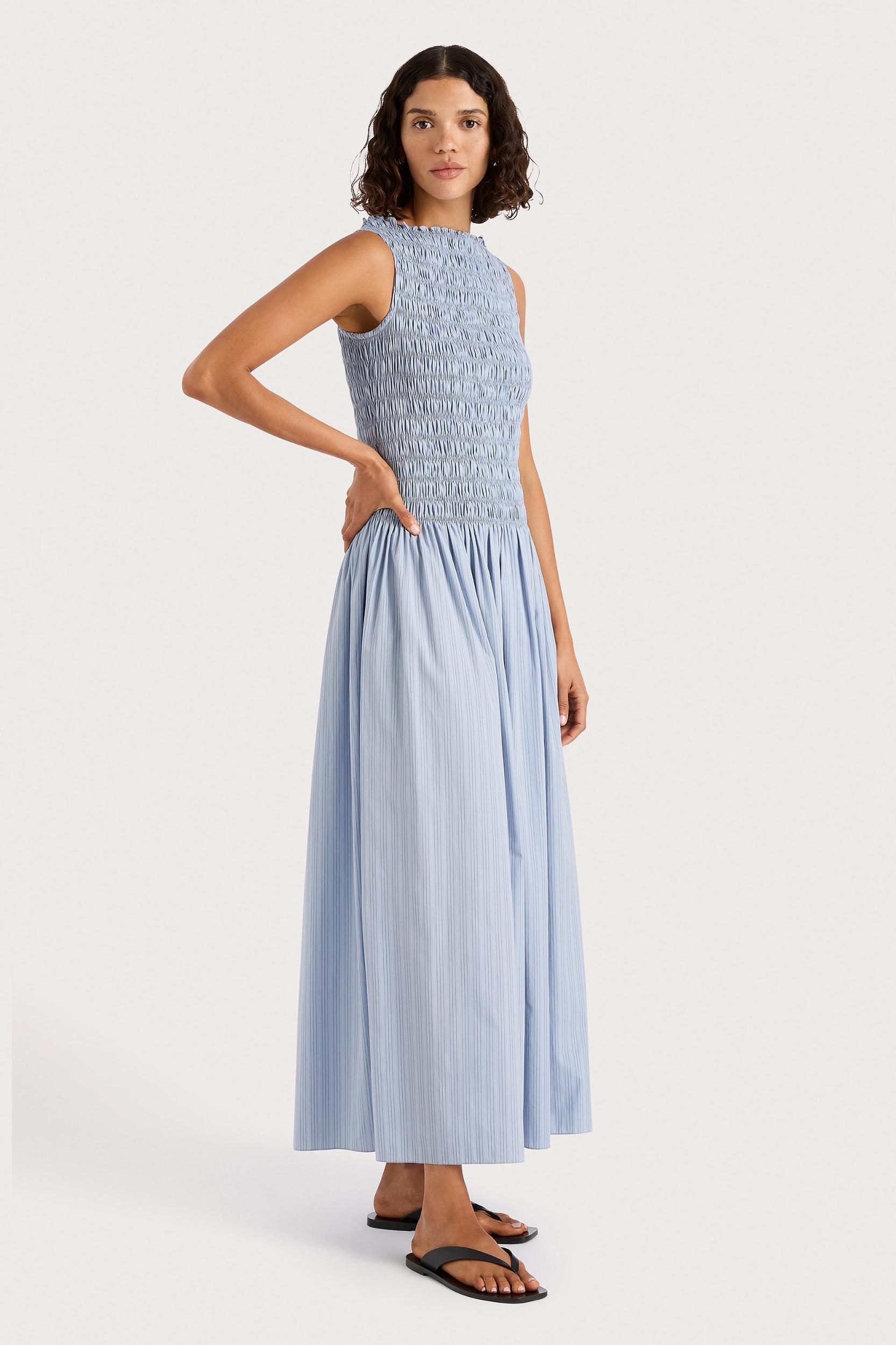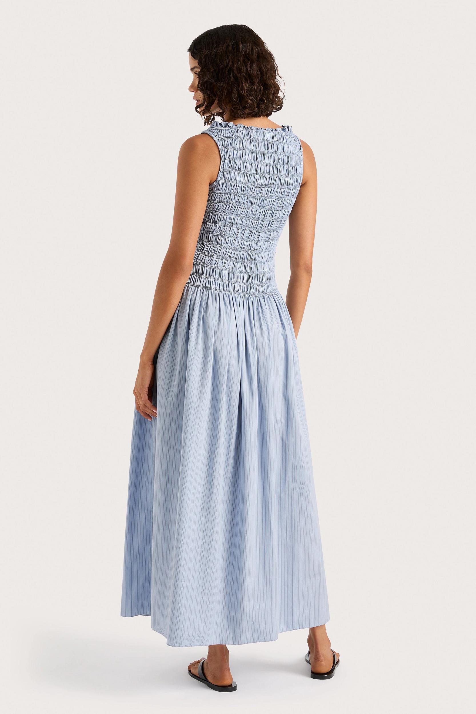 A relaxed maxi dress, crafted from a classic yarn-dyed blue pinstripe in organic cotton. Fitted through the upper-body with a shirred bodice, it features a high square neckline and gathered A-line skirt that crops just about the ankles. Style with a simple slip-on for an elegant everyday.