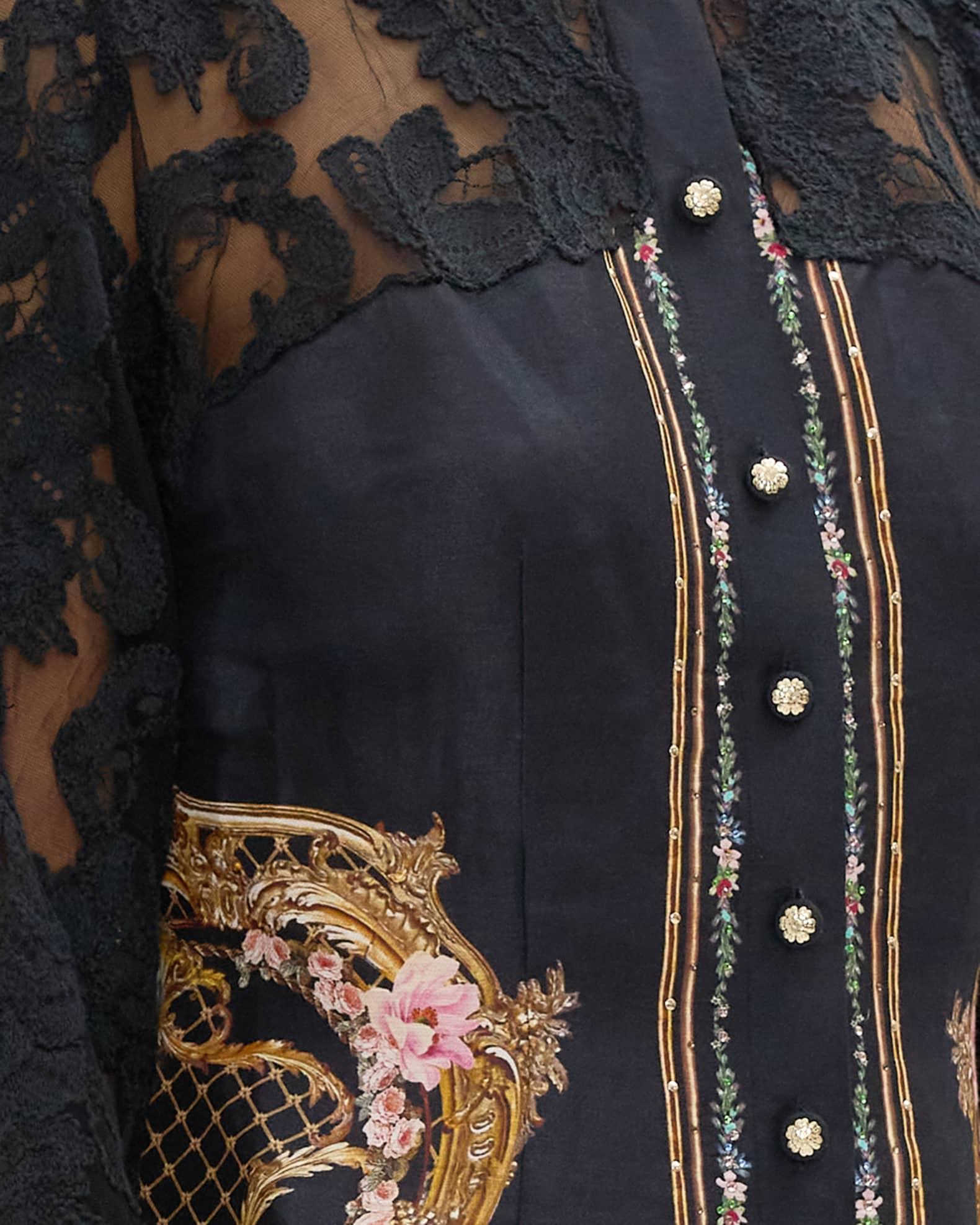 Camilla dress in a floral and golden arch print finished with sheer floral lacework and crystal embellishments High neckline; button front Cutout shoulders Elasticated back waistband Long blouson sleeves; elastic cuffs Hem falls above the knee Linen/silk Imported