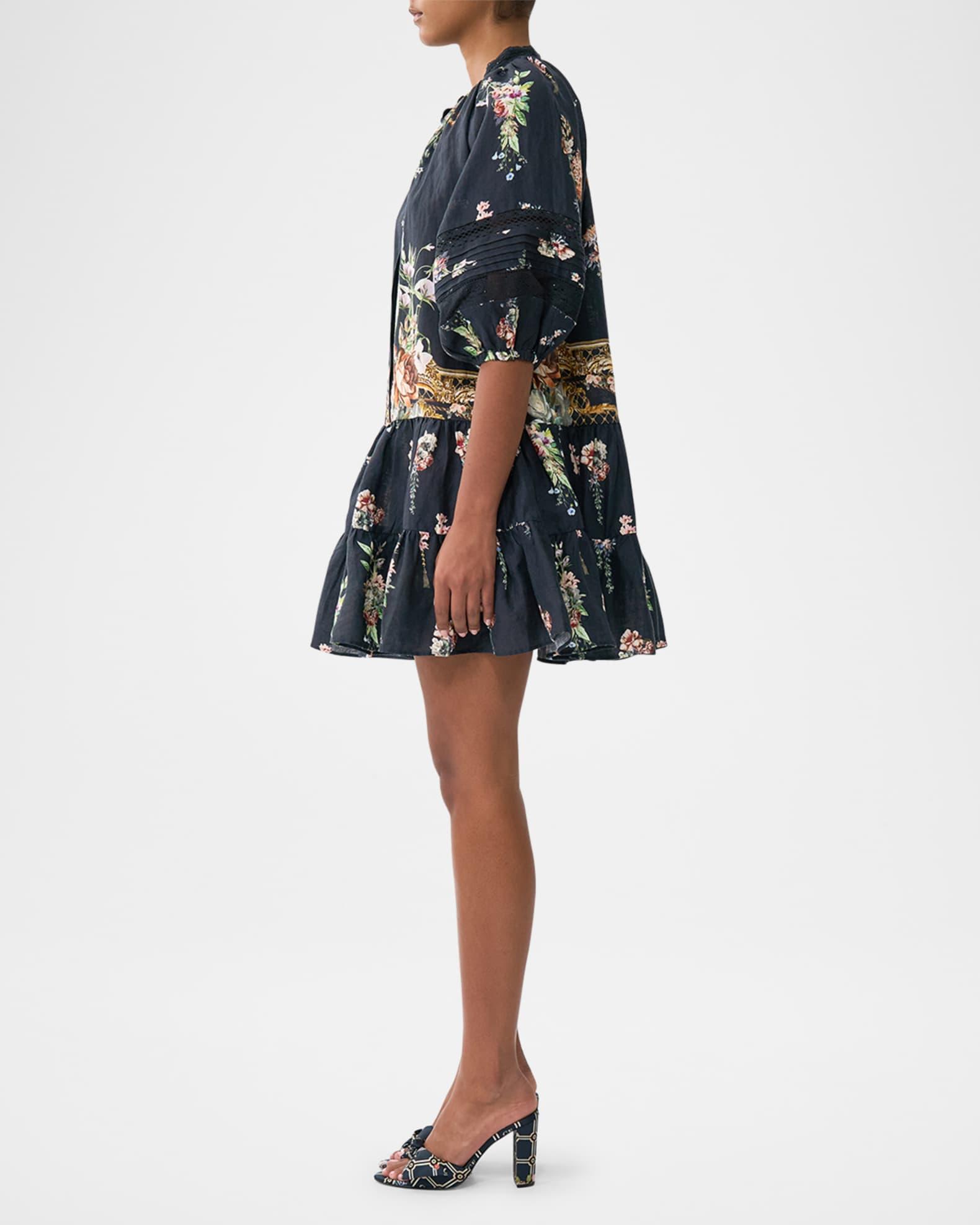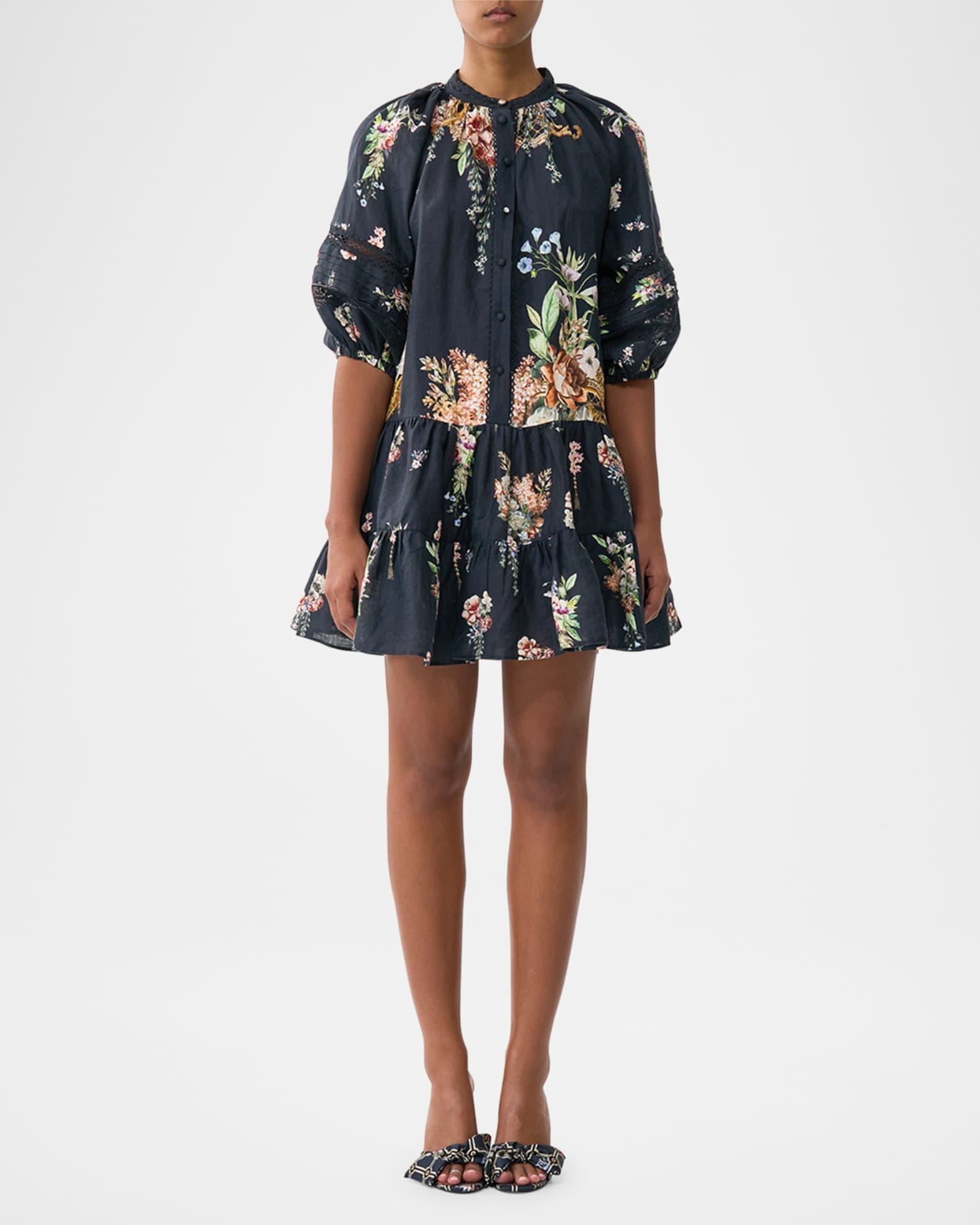 Handcrafted of pure linen, this shirtdress by Camilla is presented in a feminine floral print with crystal embellishments High neckline; button front Elbow-length puff sleeves with pintucking and lace detail Tiered skirt Hem falls above the knee Linen Imported