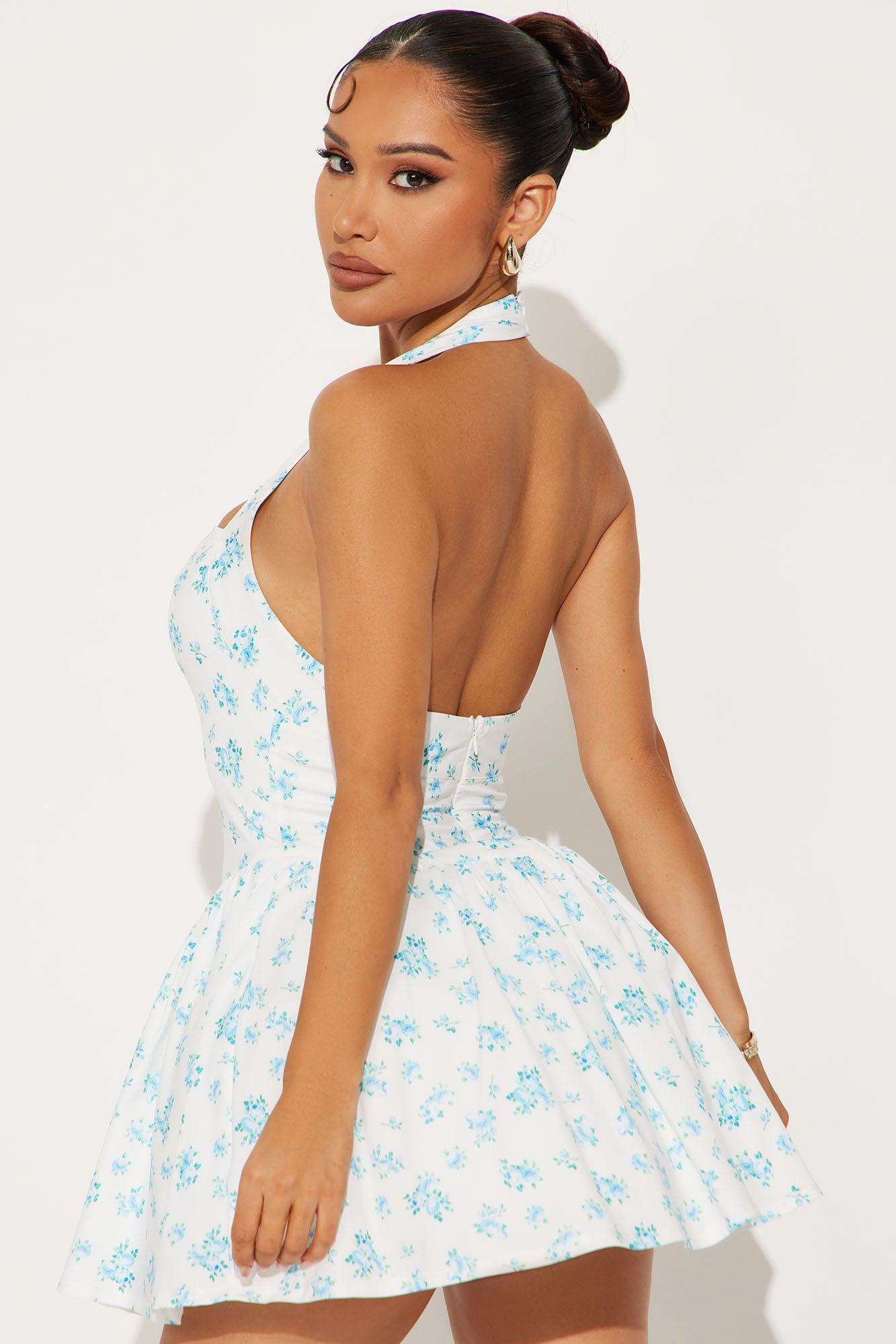 Available In Blue/combo. Floral Mini Dress Square neckline Halter Back zipper Tulle lining Length measured flat = 33" Disclaimer: Print Placement May Self 65% Rayon 30% Polyester 5% Spandex Lining 100% Polyester Imported