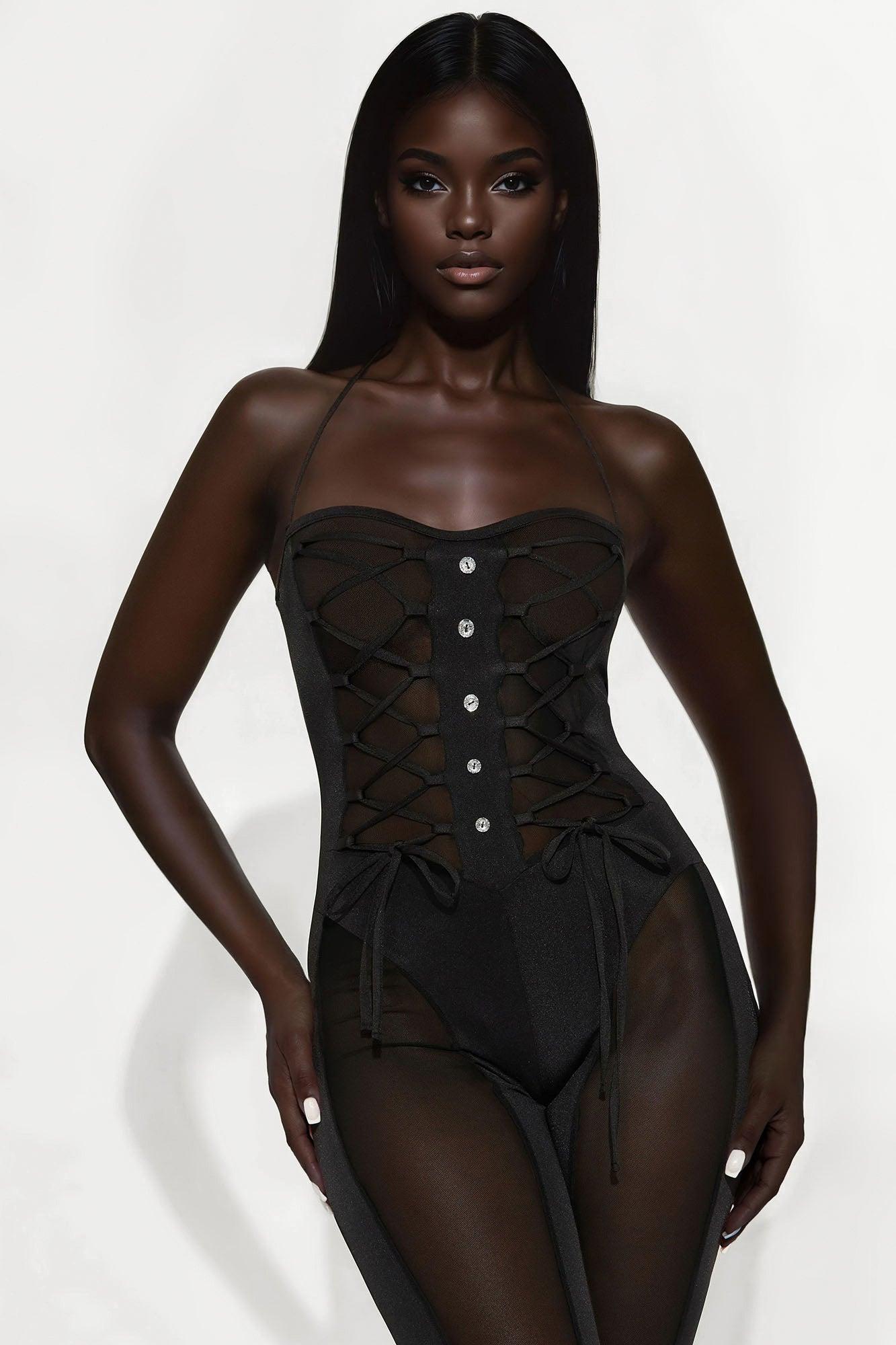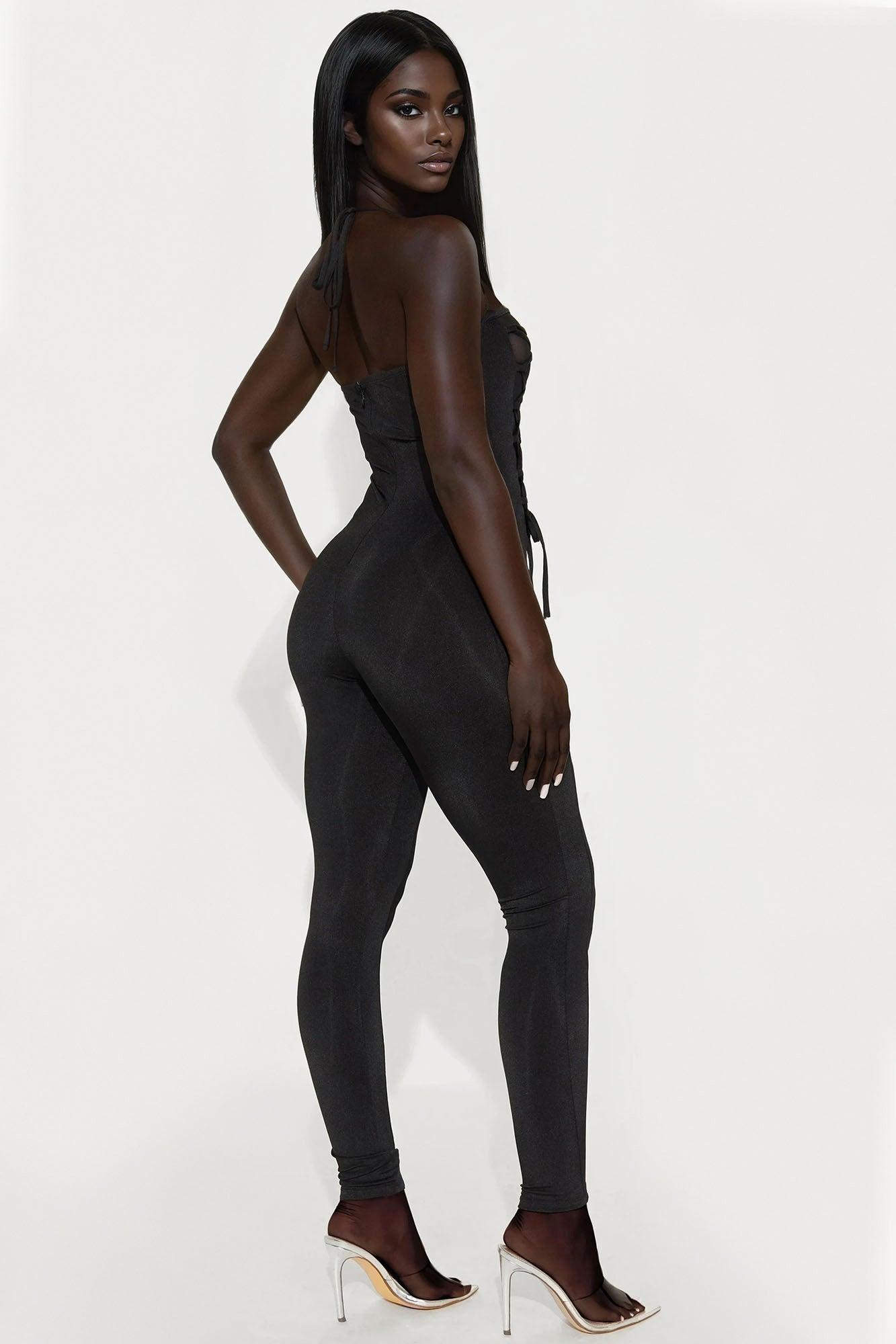 Available In Black. Jumpsuit Stretch Front Lace Up Mesh Cut Outs Diamond Button Details Invisible Back Zipper Skinny Leg 30" Inseam Self: 87% Polyester 13% Spandex Contrast: 95% Polyester 5% Spandex Imported California Proposition 65WARNING: Cancer and Reproductive Harm - www.P65Warnings.ca.gov.
