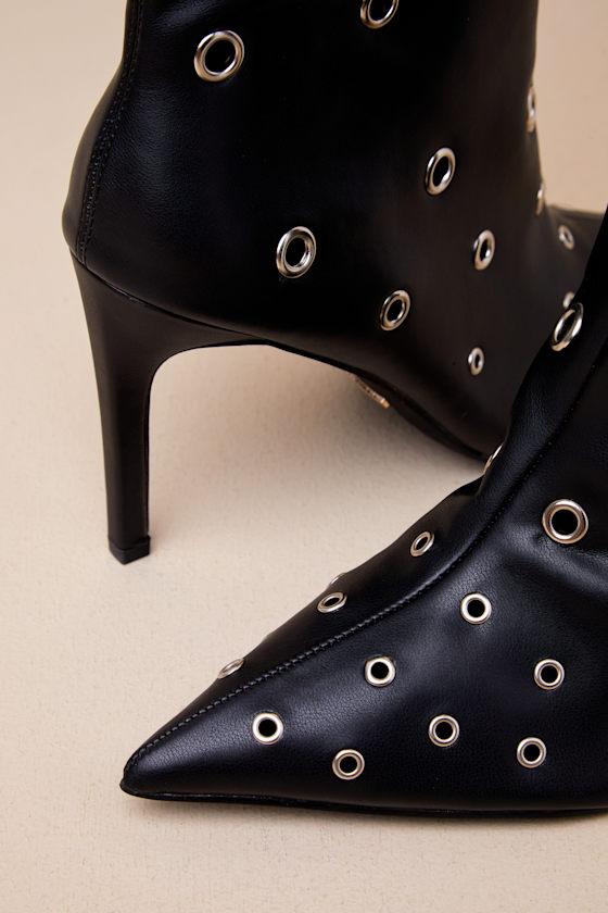 Dare to stand out from the crowds in style as you strut in the Billini Noella Black Eyelet Pointed-Toe Knee-High Boots! Smooth faux leather shapes eye-catching boots with a pointed-toe upper that rises to a 14.25" knee-high shaft with a 15.25" circumference. Shiny silver eyelet detailing adds a peek-a-boo cutout effect throughout the slip-on silhouette. Sexy stiletto heel completes the fashion-forward look! Available in whole sizes only.