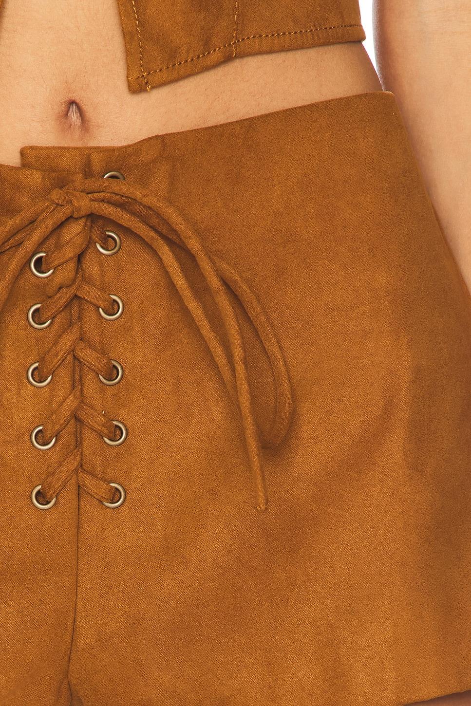 Self: 100% polyesterLining: 97% polyester, 3% elastane. Dry clean only. Front lace-up tie closure. Lightweight faux suede fabric. Item not sold as set. Shorts measure approx 9.5" in length. Made in Vietnam. Revolve Style No. LOVF-WF606. Manufacturer Style No. ACF10032 S25.