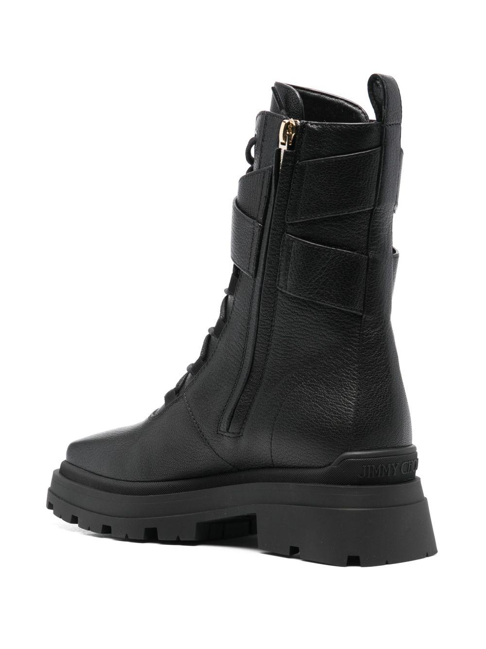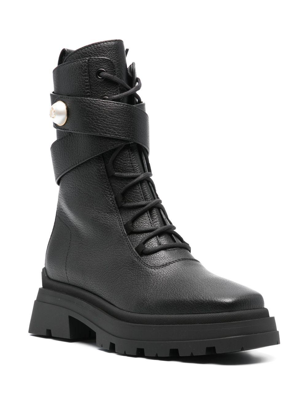 Jimmy Choo Noemi combat boots | Black | black | calf leather | grained texture | strap detailing | pearl detail with gold-tone logo lettering | branded heel counter | square toe | front lace-up fastening | side zip fastening | branded zip puller | mid-calf length | pull-tab at the heel | leather lining | chunky rubber lug sole | Leather | Combat Boots | Boots | Shoes | Women