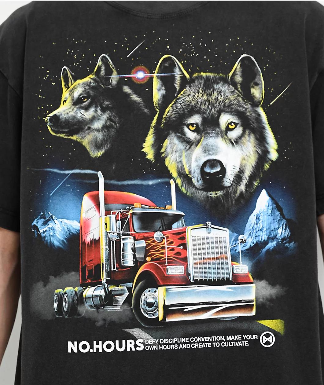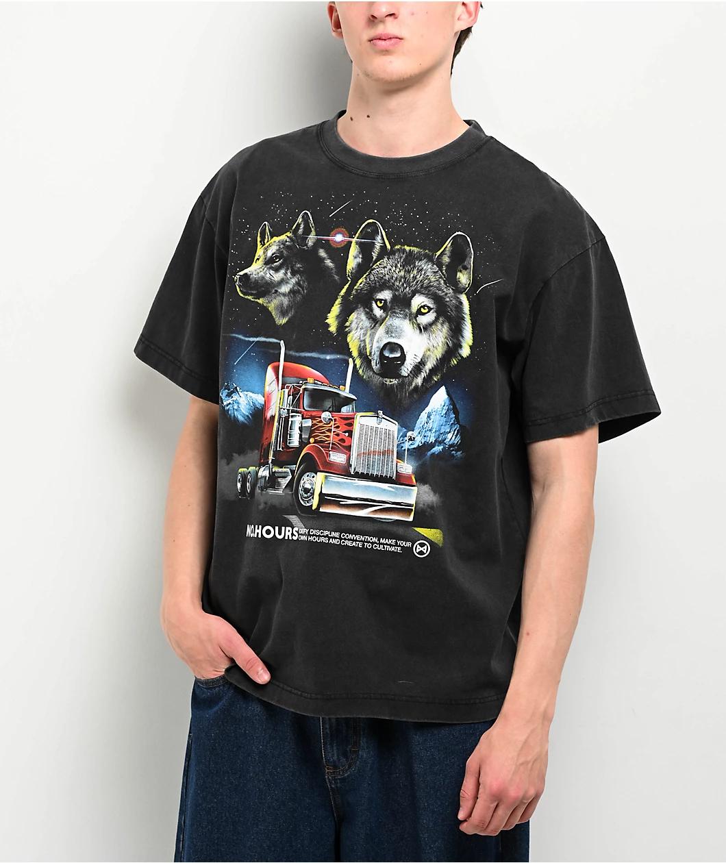 Add an alpha vibe to any casual outfit with the Night Moves t-shirt from NoHours. The black tee features art on the chest of two wolves above a 16-wheeler truck for a late Night, lonesome look. A pure cotton construction gives the relaxed streetwear