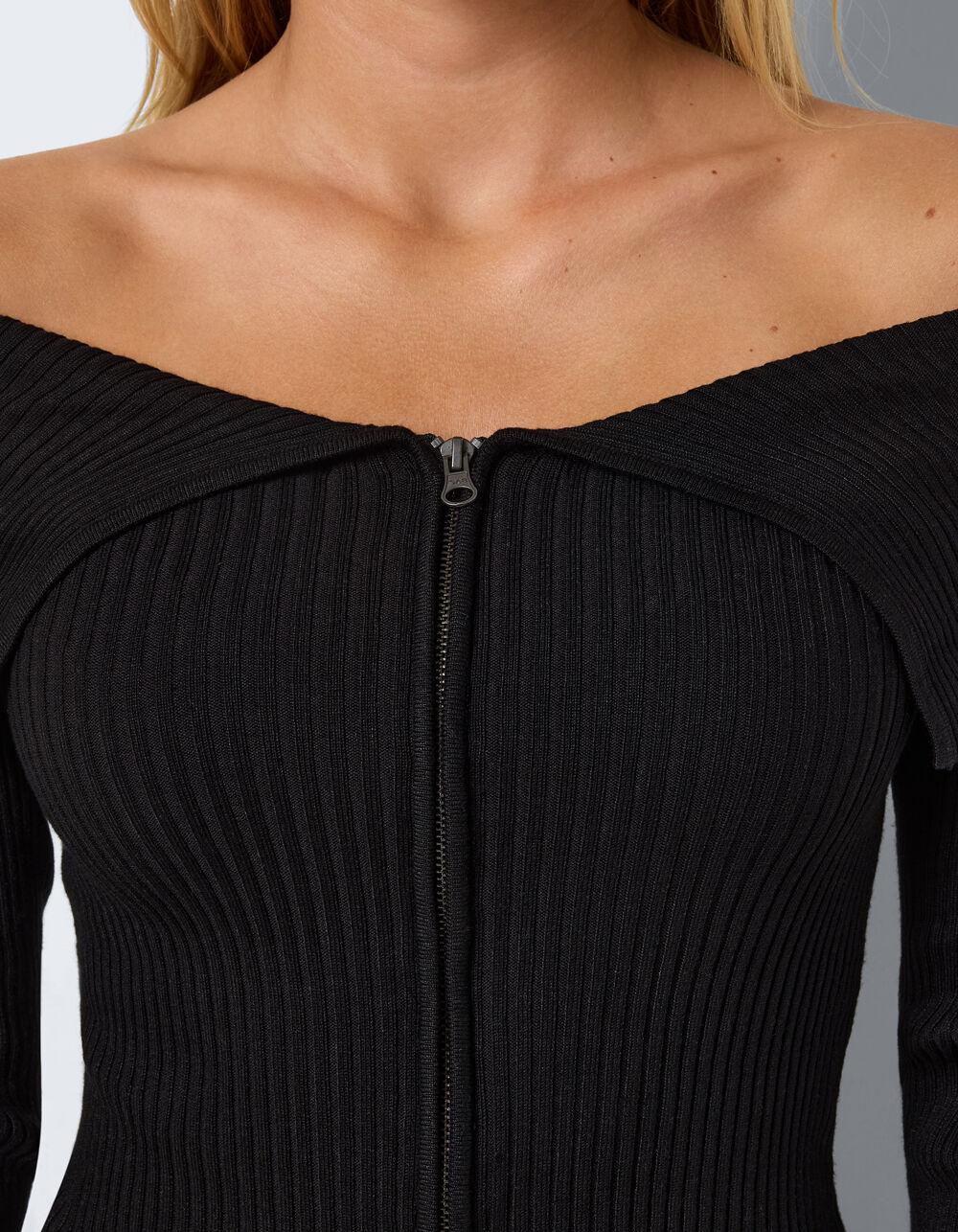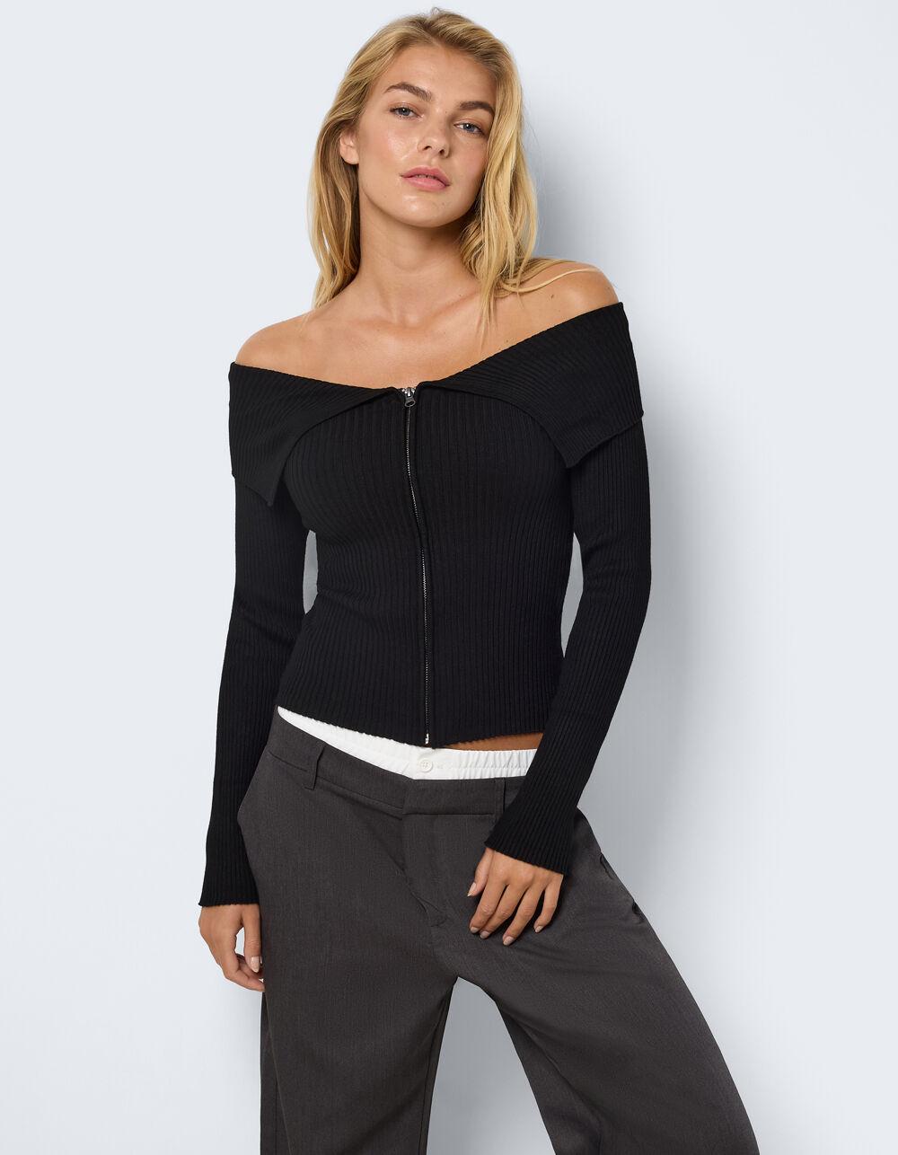 Noisy May Juliet Off The Shoulder Knit Top. Rib knit construction. Off the shoulder neckline. Zip-up front closure. Fitted design. 70% LENZING™ ECOVERO™ Viscose 30% Nylon Machine wash. Imported.