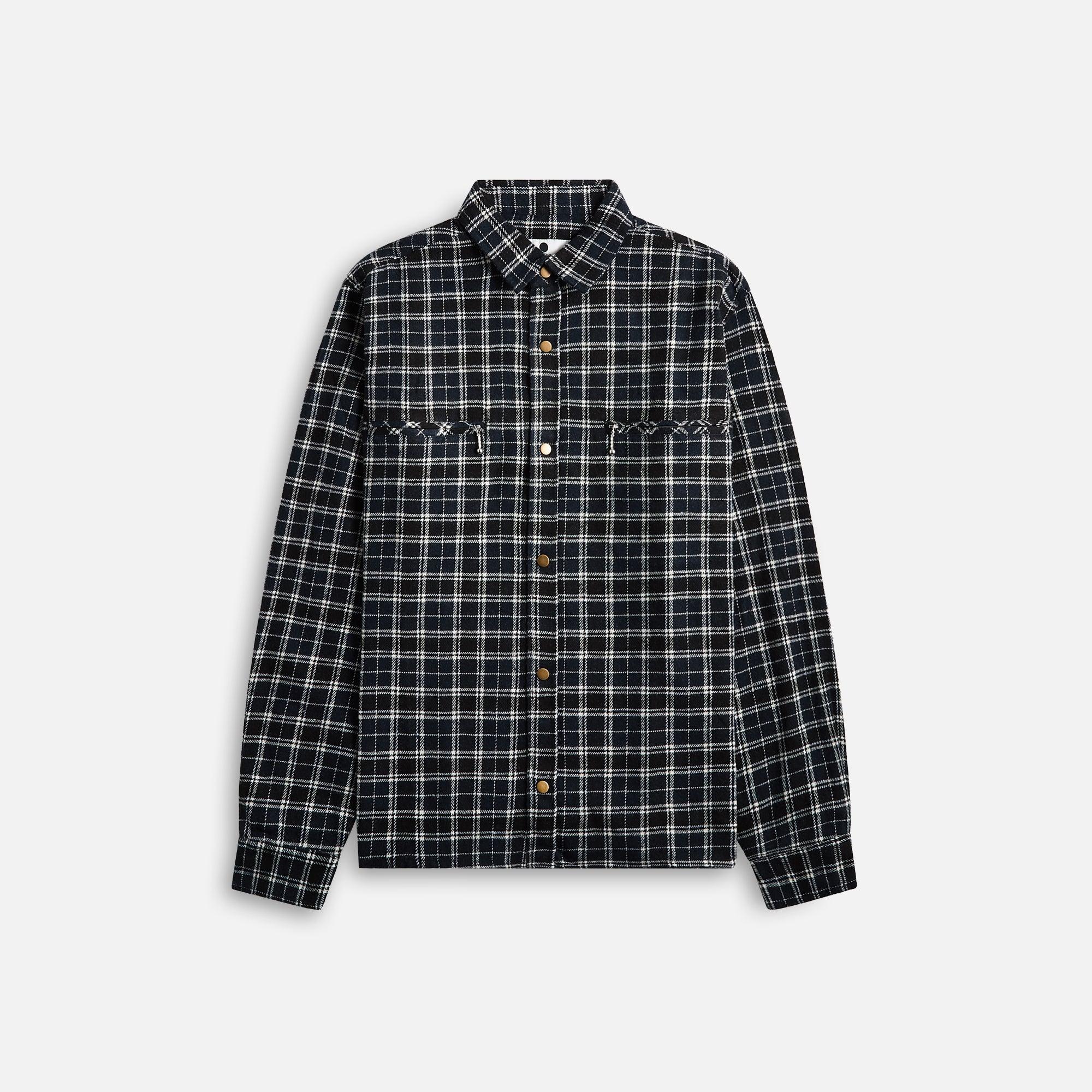Polyester blend fabric Snap button closure on front Classic collar Two zipper pocket on front Snap button closure on cuffs All-over check pattern Style: ngfw24013 Color: Black / Navy / White Material: 65% Polyester / 35% Cotton
