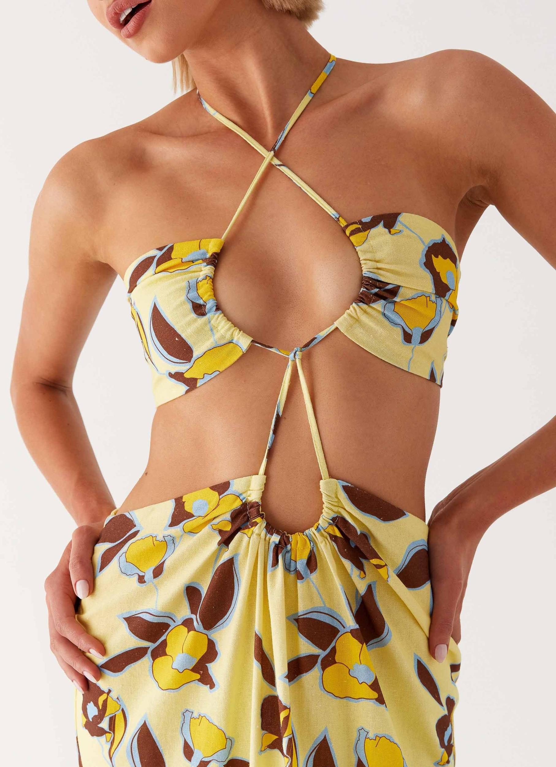 Peppermayo Exclusive Step into an evening of elegance with the Nora Linen Maxi Dress. This dress features a halter neckline and a keyhole cutout at the bust, adorned with bead detailing, capturing the essence of sunset silhouettes and golden skies. - Print placement will differ on each garment- Maxi length- Halter neckline- Exclusive print- Open back- Keyhole cut out at bust- Connected bandeau style top with skirt- Bead detail- Side seam invisible zipper- Fully lined- 45% Linen, 55% Cotton Size AU 8 / US 4 garment measurements: Bust: 74 cm / 29.1 inWaist: 79 cm / 31.1 inHip: 106 cm / 41.7 inHem: 138 cm / 54.3 inLength: 130.5 cm / 51.4 in Annalise is 176cm and wearing a size AU 8 / and US 4