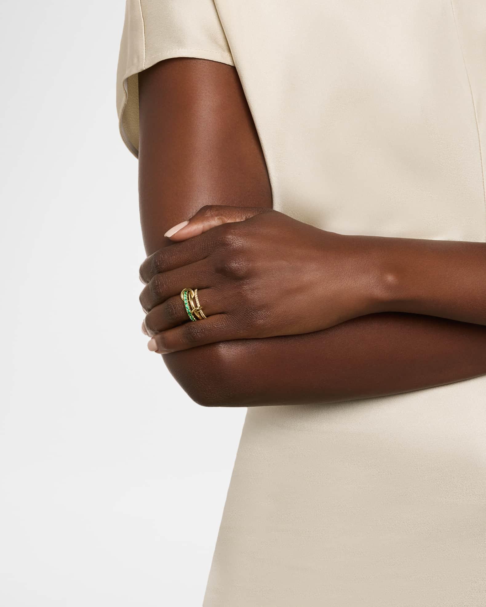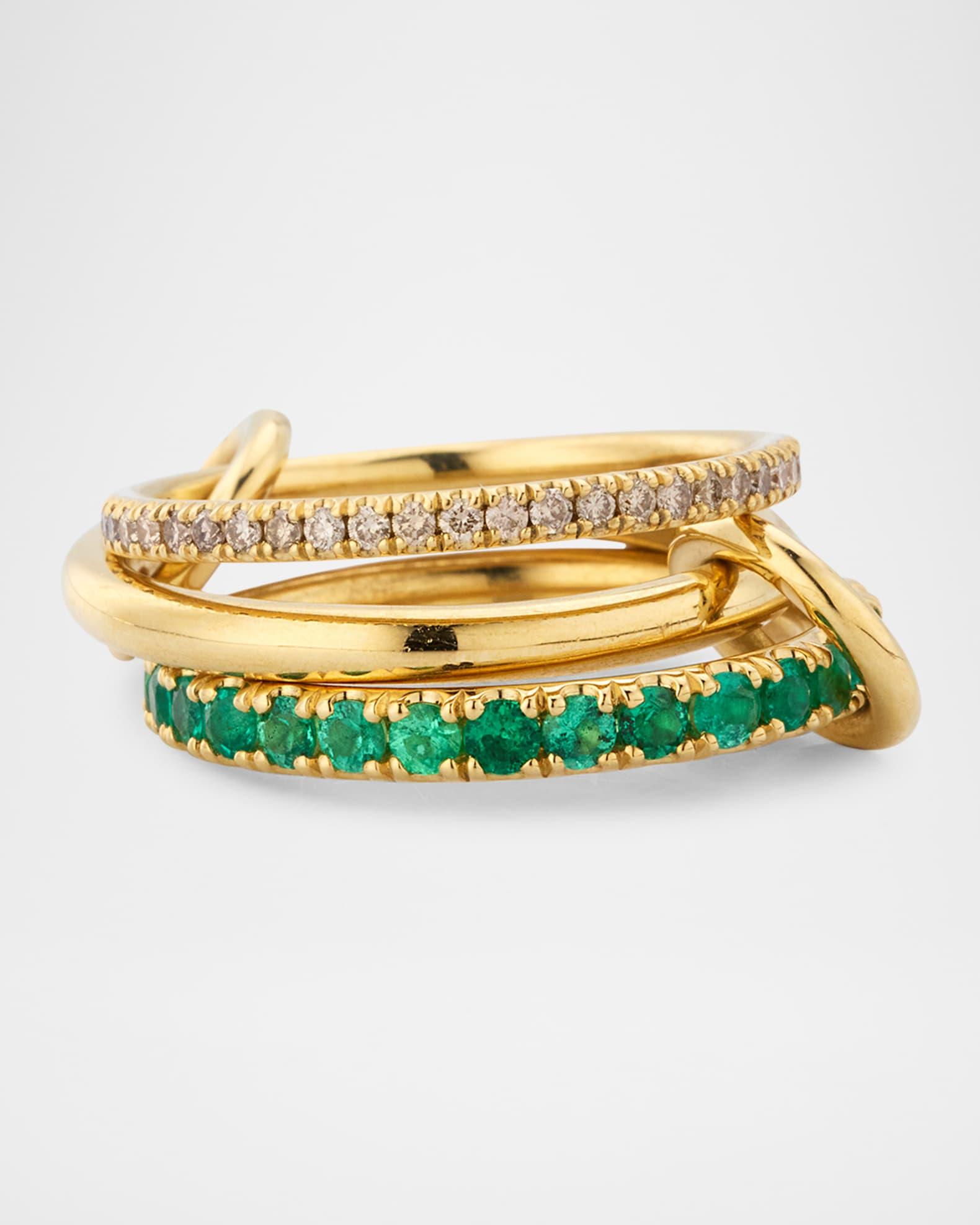 Spinelli Kilcollin rings are crafted with bands, annulets, and connectors. Three links compose the Norah YG with champagne diamonds and emeralds for a dynamic design. 18-karat yellow gold Diamonds and emeralds 1.55 total combined carat weight Professional cleaning recommended Made in USA