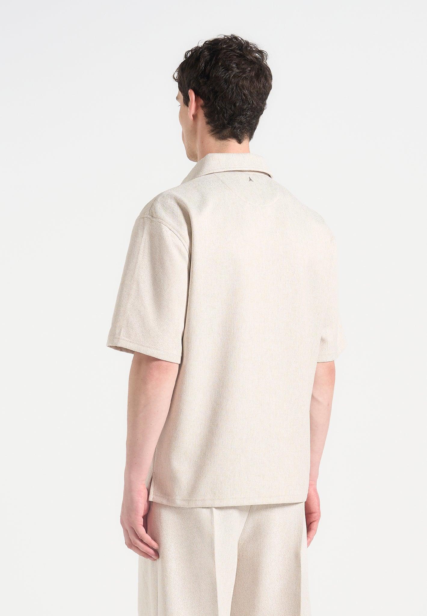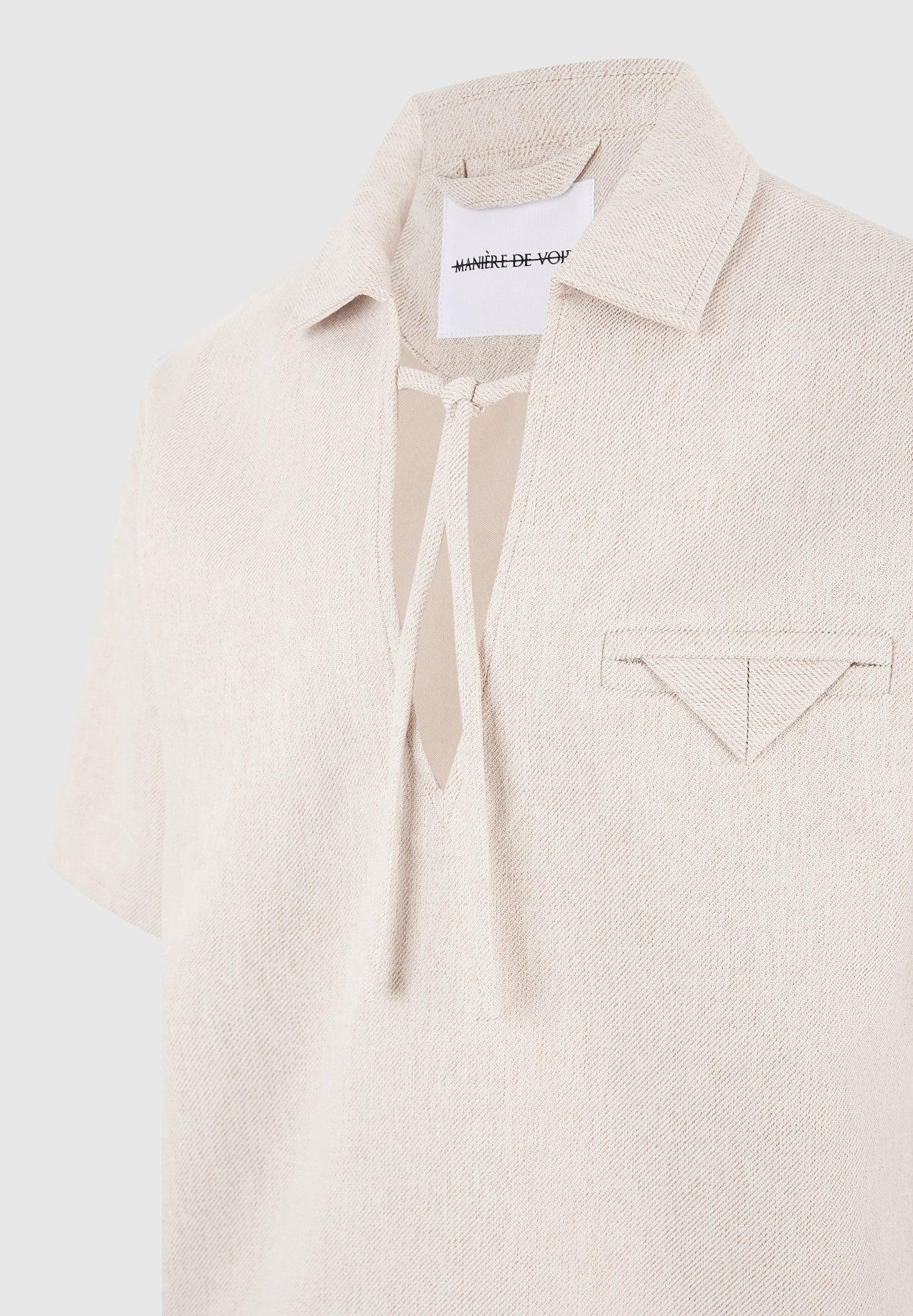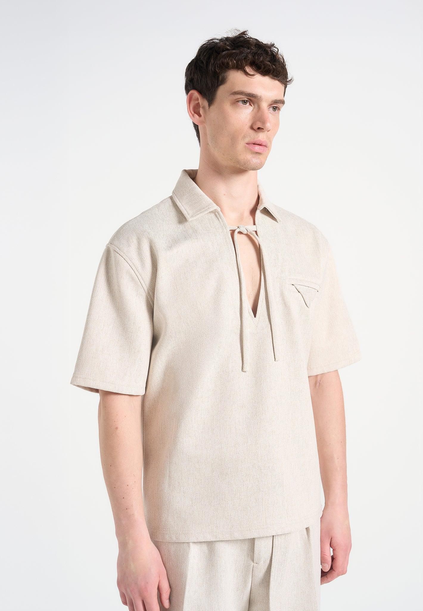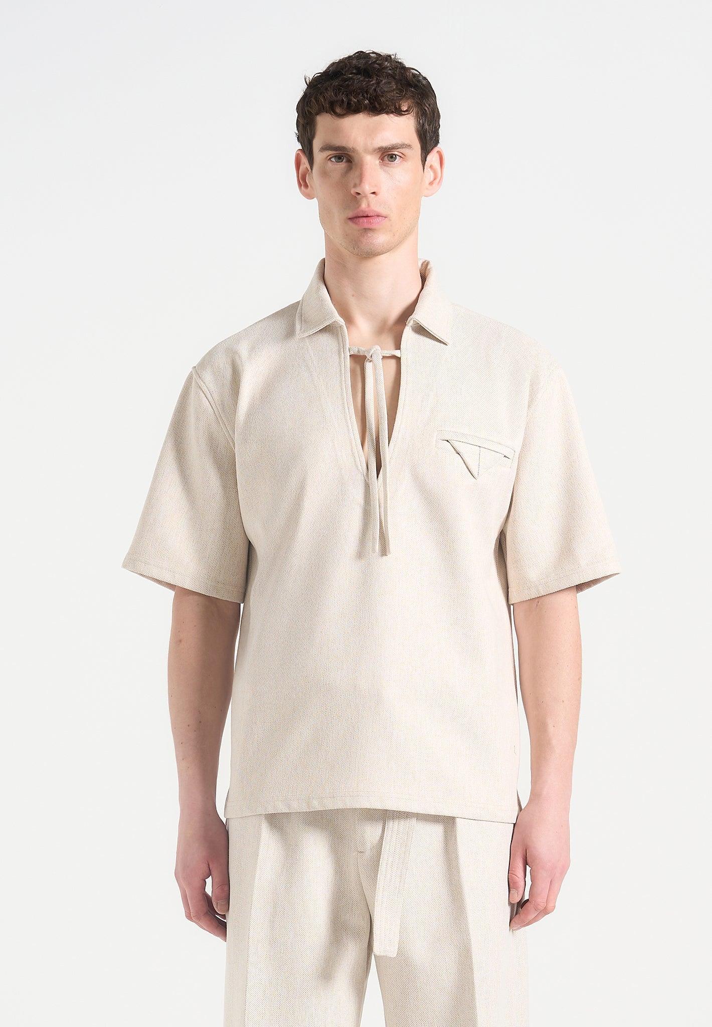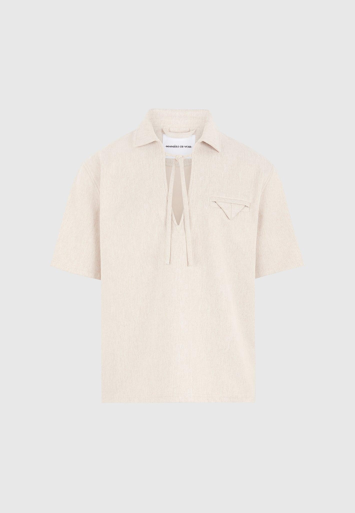 The Open Collar Textured Drawstring Shirt blends relaxed tailoring with subtle technical nuance. Crafted from a softly textured fabric, it features a contrast drawstring threaded through the open neckline, allowing for adjustable styling and added shape. A folded flap chest pocket introduces a sculptural touch to an otherwise fluid silhouette. Textured Fabric for Structure and Surface Depth Open Collar with Drawstring Insert for Styling Flexibility Relaxed Fit with Straight Hem Folded Triangular Chest Pocket for Geometric Detail Short Sleeves with Tailored Finish Silver Manière De Voir Eiffel Plaque on Back 100% PolyesterAlways check the care label for wash instructions.