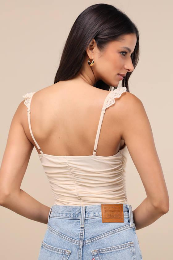Dinner dates with family, friends, and crushes are effortlessly paired with this airy mesh bodysuit, featuring adjustable straps and a sweetheart neckline, all adorned with darling lace trim. The lightly draped bodice boasts flattering ruching along the sides before ending with attached bottoms with snap closures.