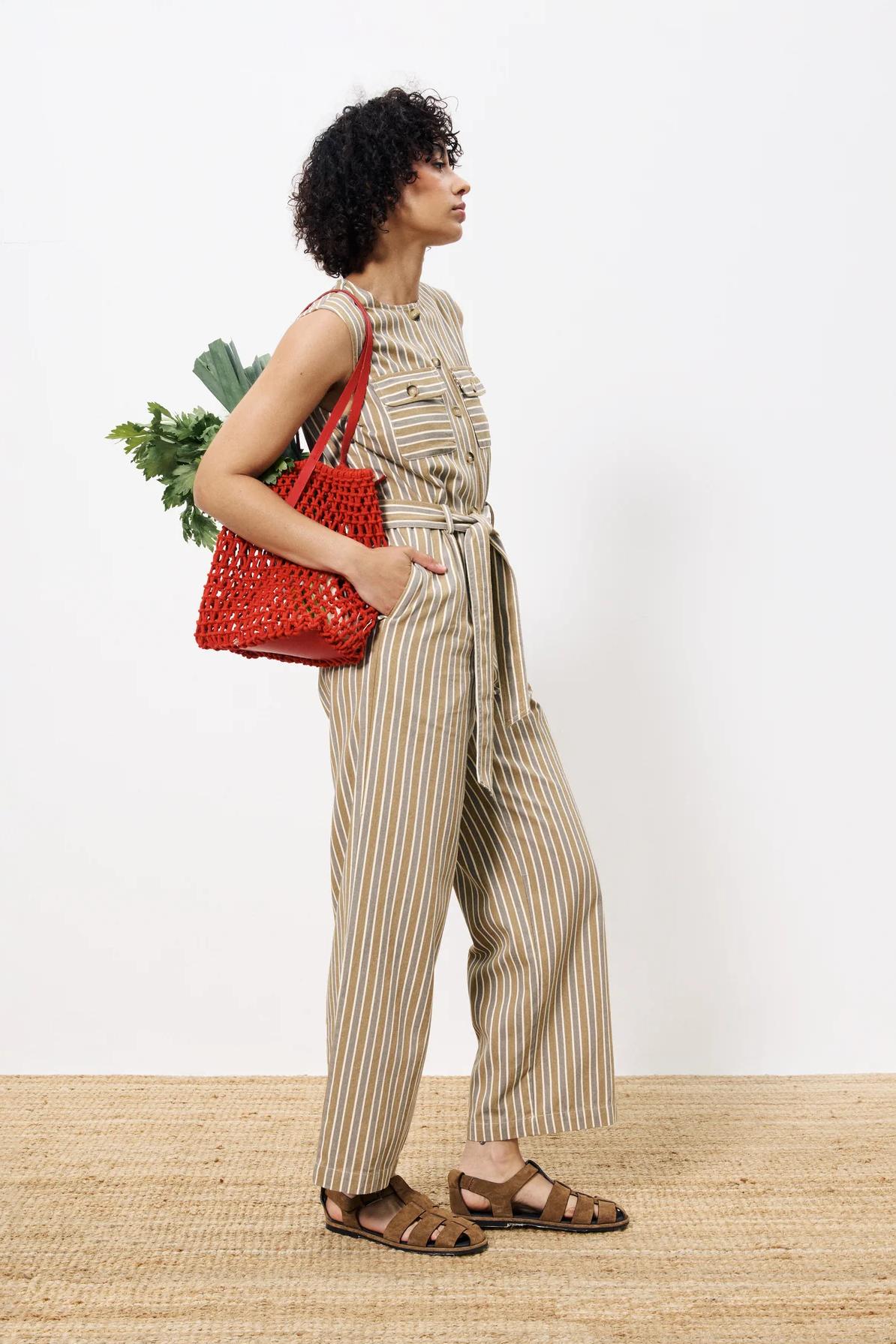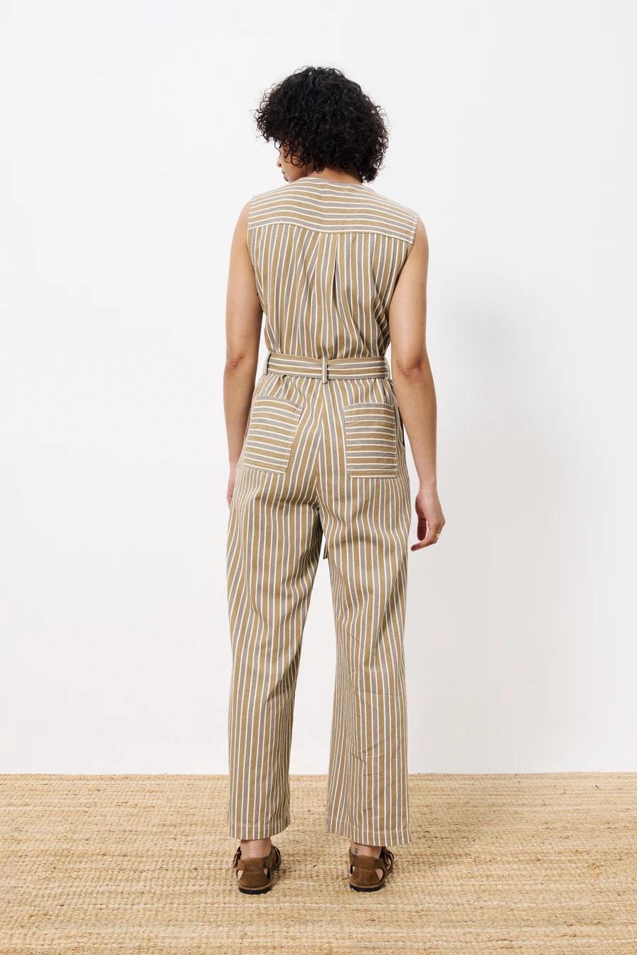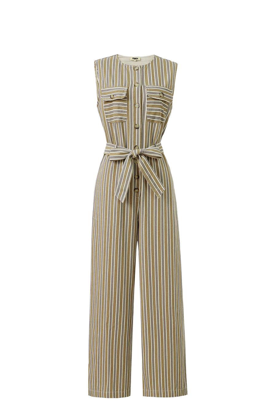 Exclusive to FRNCH striped pattern jumpsuit with removable self tie belt, font button closure and pockets front, side and back. Straight leg cut.