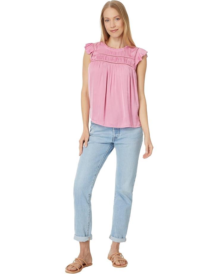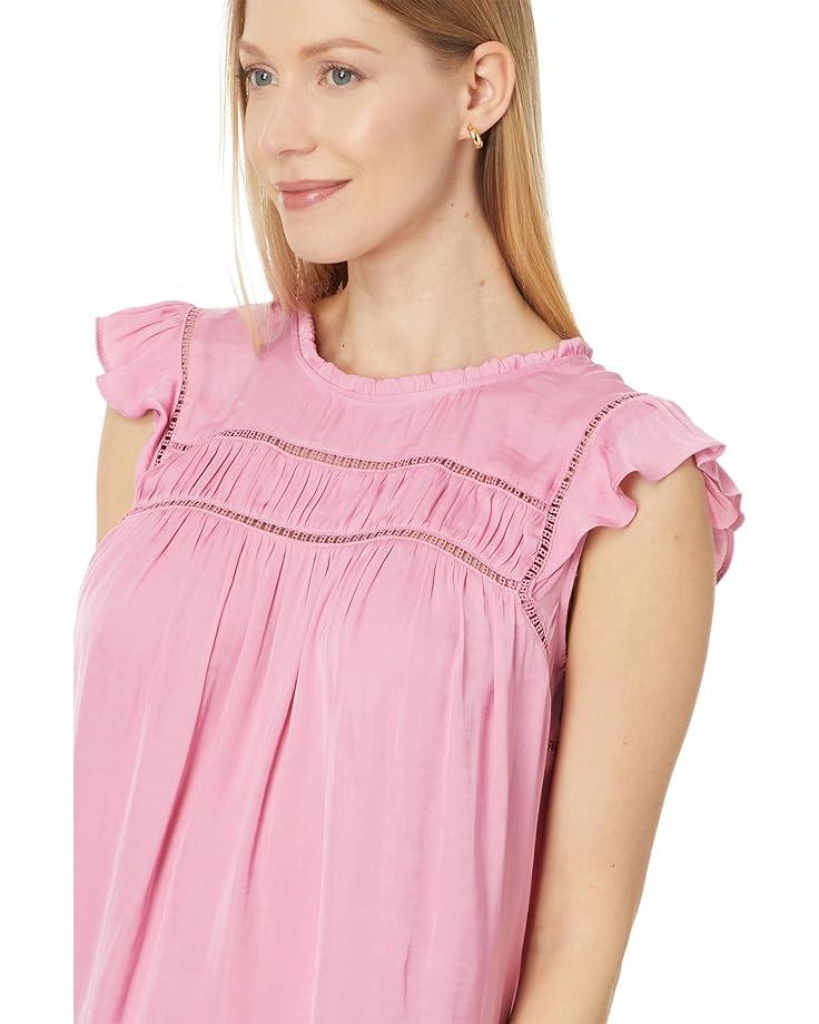 Bring an innovative depth of modishness to your look wearing the Liverpool™ Los Angeles Flutter Sleeve Top with Trim Detail Textured Sateen. It features a crew neckline with ruffled trims, short flutter sleeves, subtle eyelet trim detail, pleated back yoke, and keyhole back closure.
