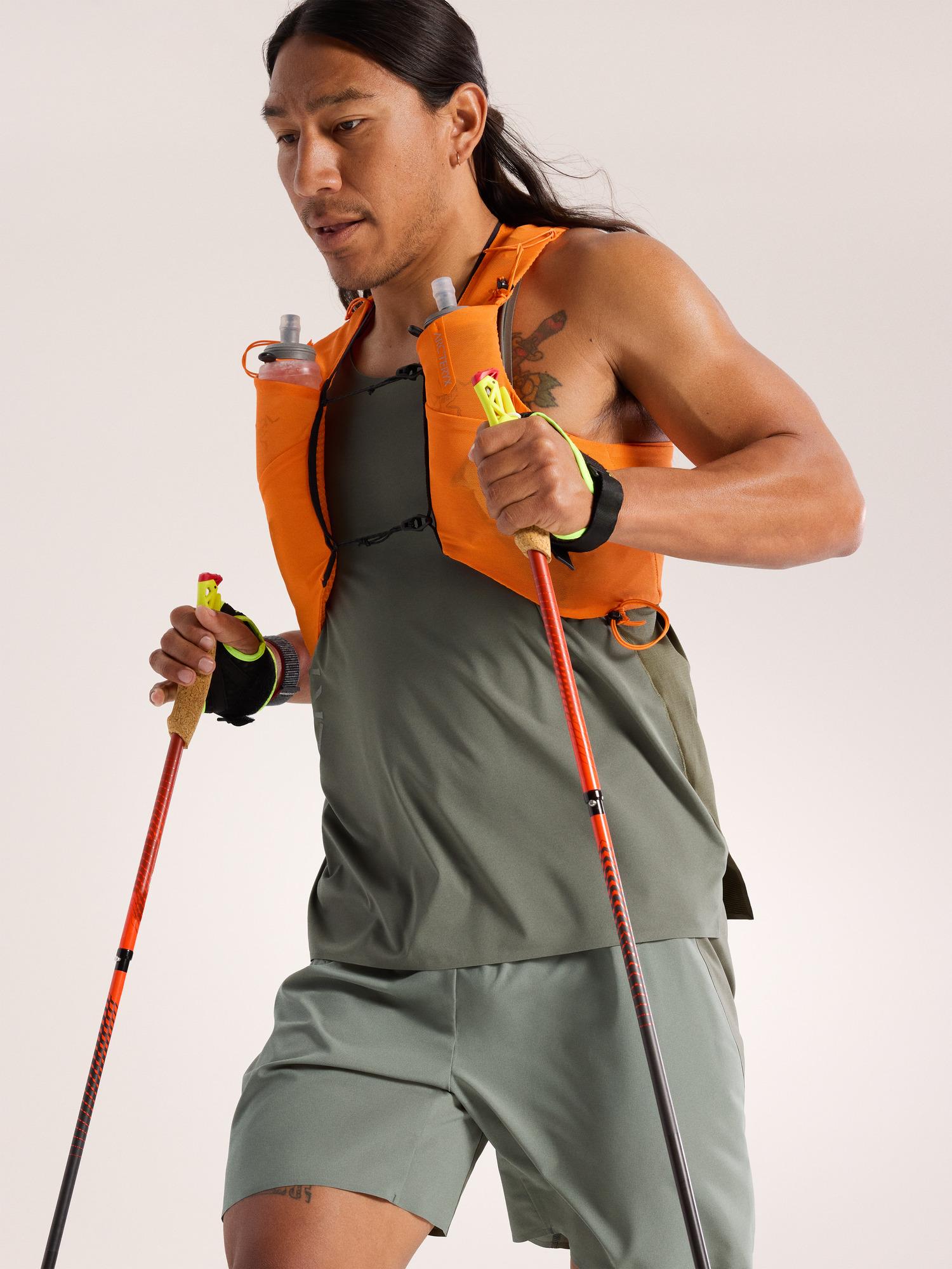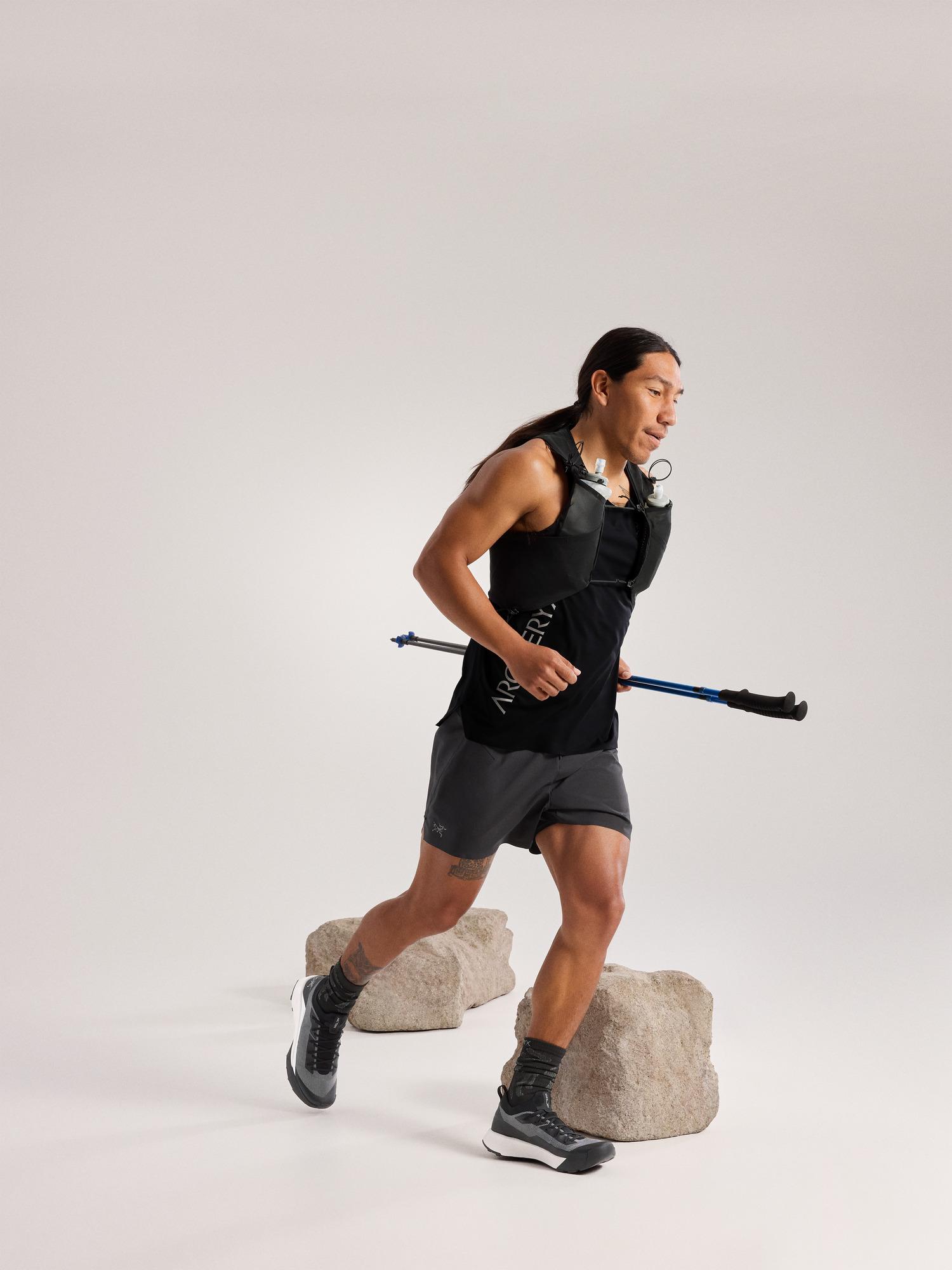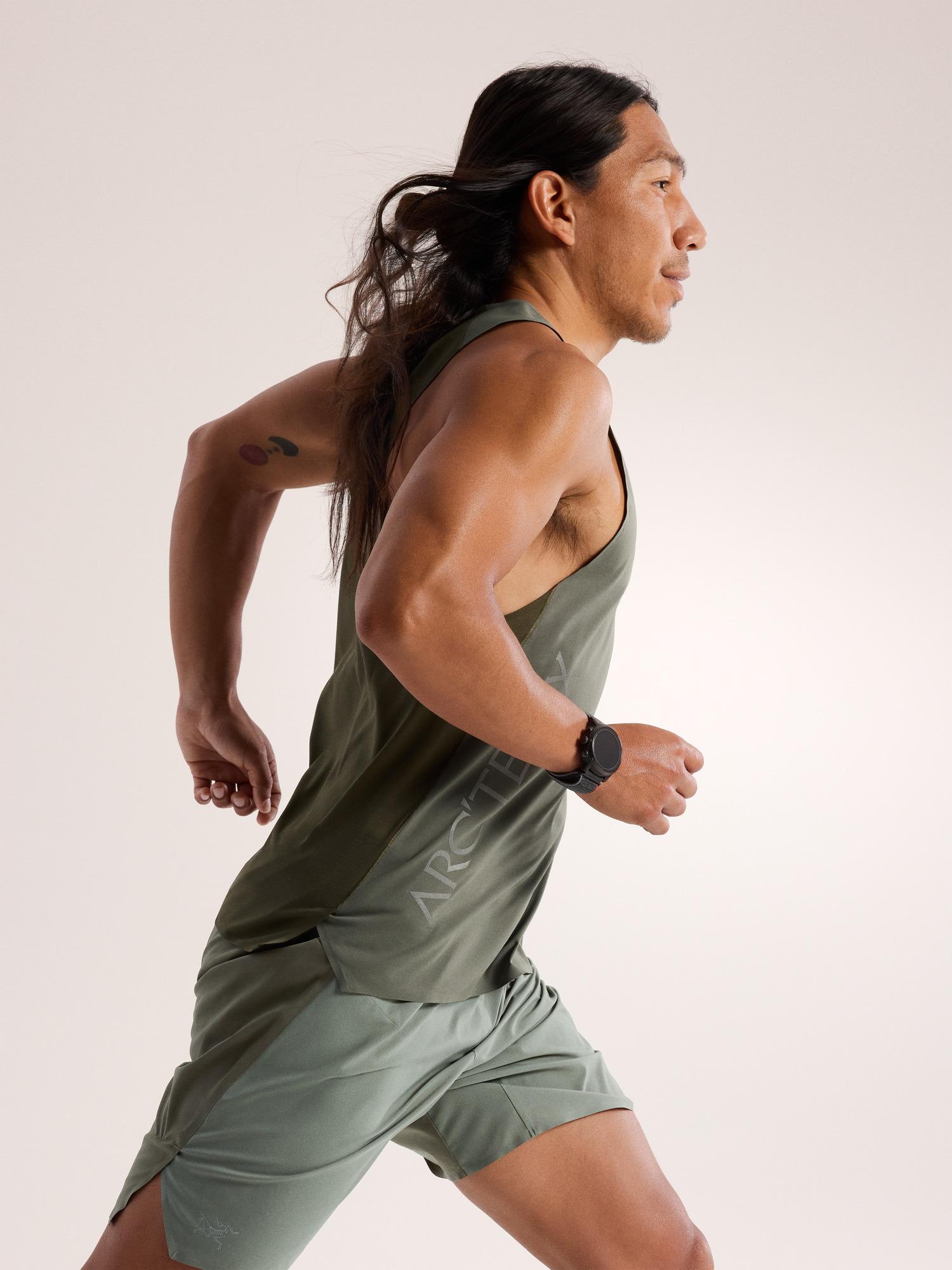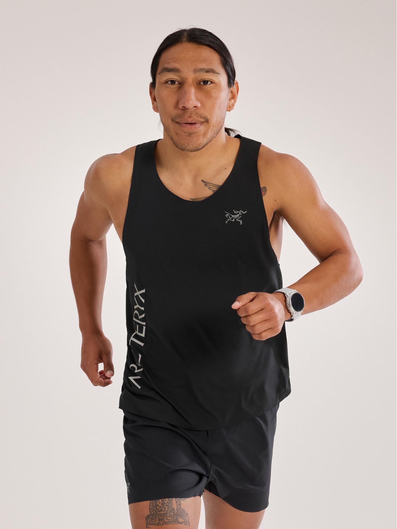 Pinnacle performance in a mountain running tank with a bold reflective graphic.