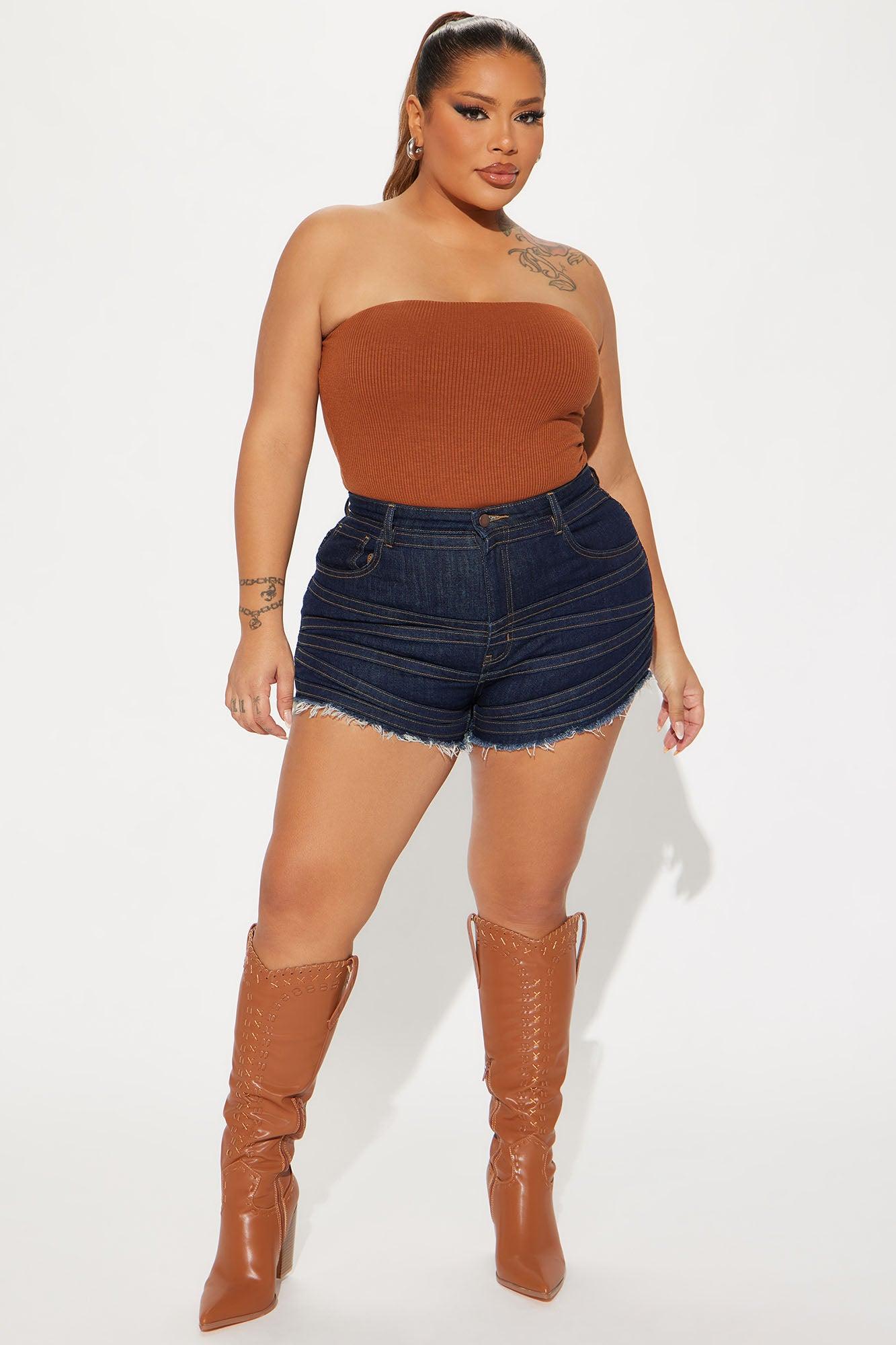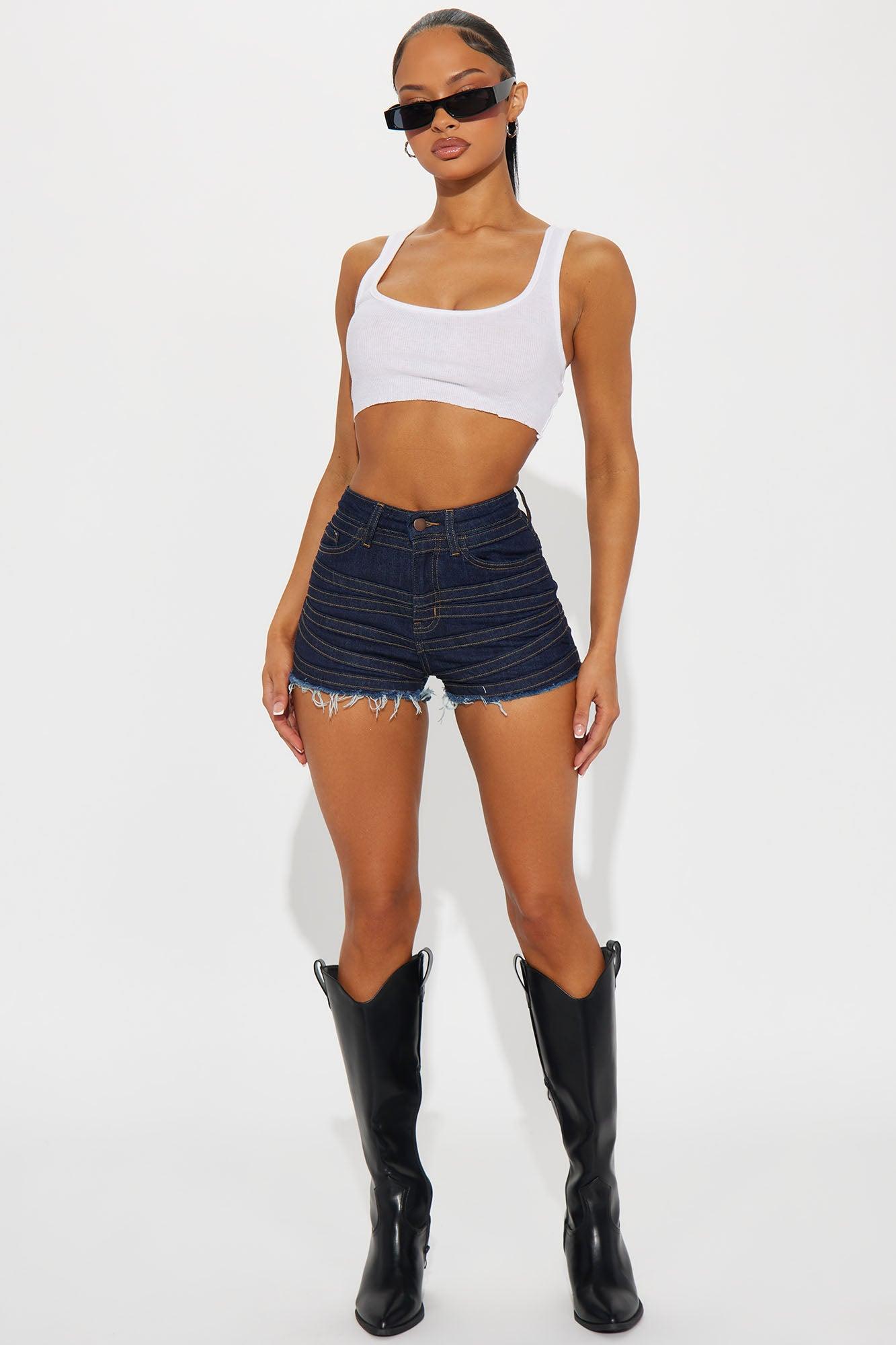 Available In Dark Wash. Denim Short 5 Pocket Seaming Fray Hem 2" Inseam 10.5" High Rise Low Stretch 98% Cotton 2% Spandex Imported California Proposition 65 WARNING: Cancer and Reproductive Harm - www.P65Warnings.ca.gov.