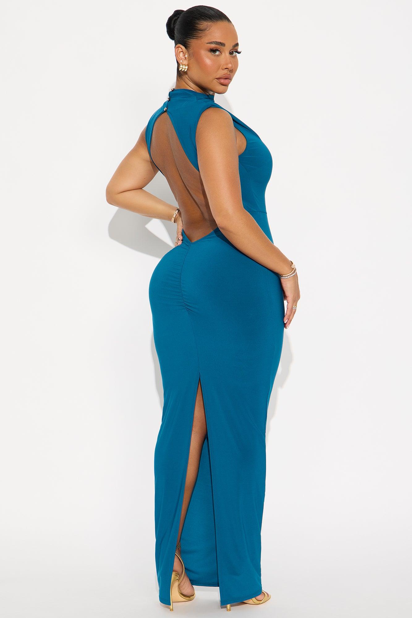 Available In Black And Teal. Maxi Dress Sleeveless Shoulder Pads Mock Neckline Backless Ruching Back Slit Lined Stretch 95% Polyester 5% Spandex Imported California Proposition 65WARNING: Cancer and Reproductive Harm - www.P65Warnings.ca.gov.