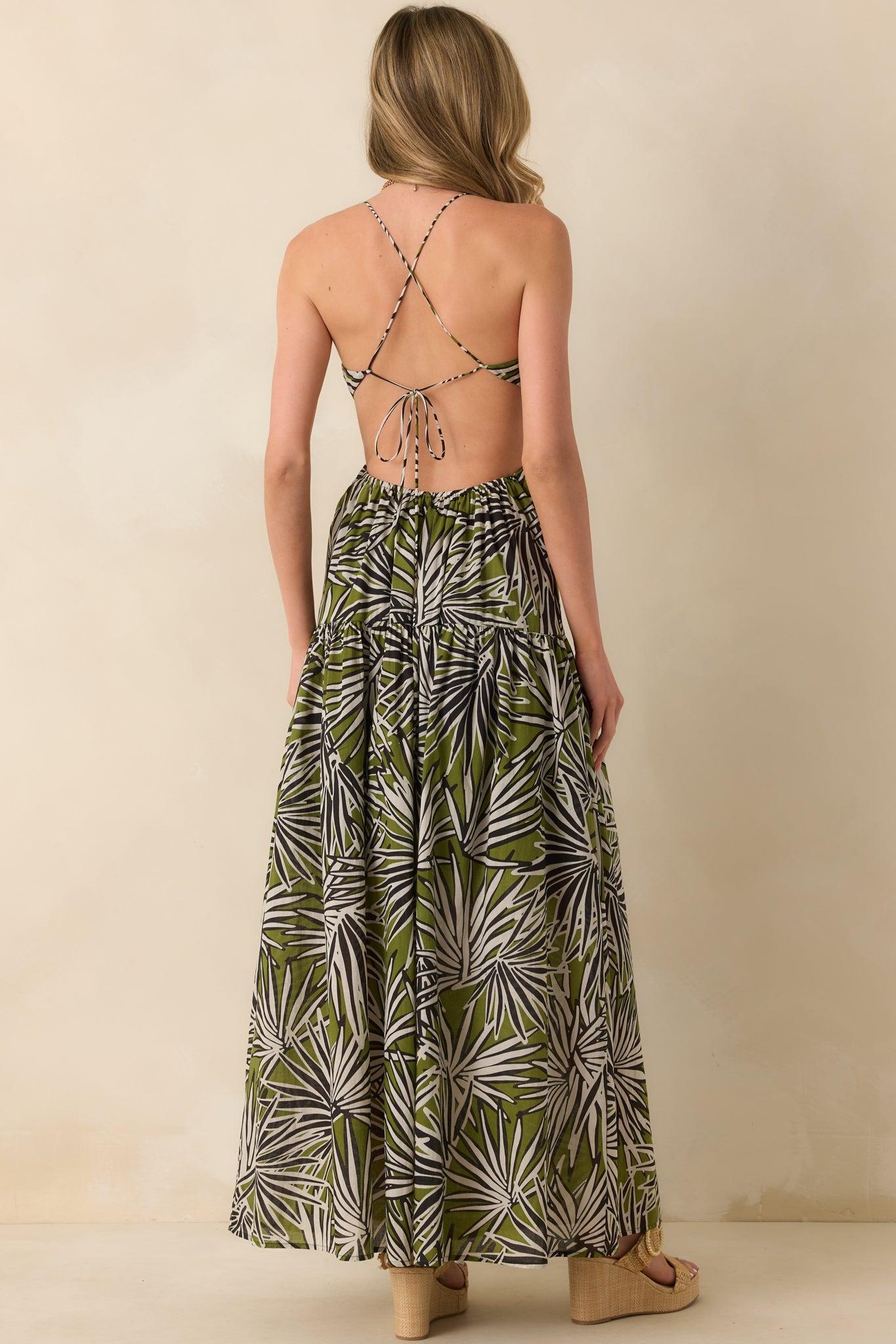 The Not In A Hurry Olive Green Tropical Print Cotton Cutout Maxi Dress is the kind of piece that lets you slow down and enjoy the moment. It’s effortlessly bold, easy to wear, and always makes a subtle statement. This olive green maxi dress features a black and white palm frond tropical print, a v-neckline, center bust cutout detail, elastic back waist, adjustable crisscross back spaghetti straps, an open back design, drop waist silhouette, and a mini length lining. 100% Cotton Lined: 100% Cotton Hand Wash Cold Manufactured in China Designed in The USA Model is Wearing a Size Small