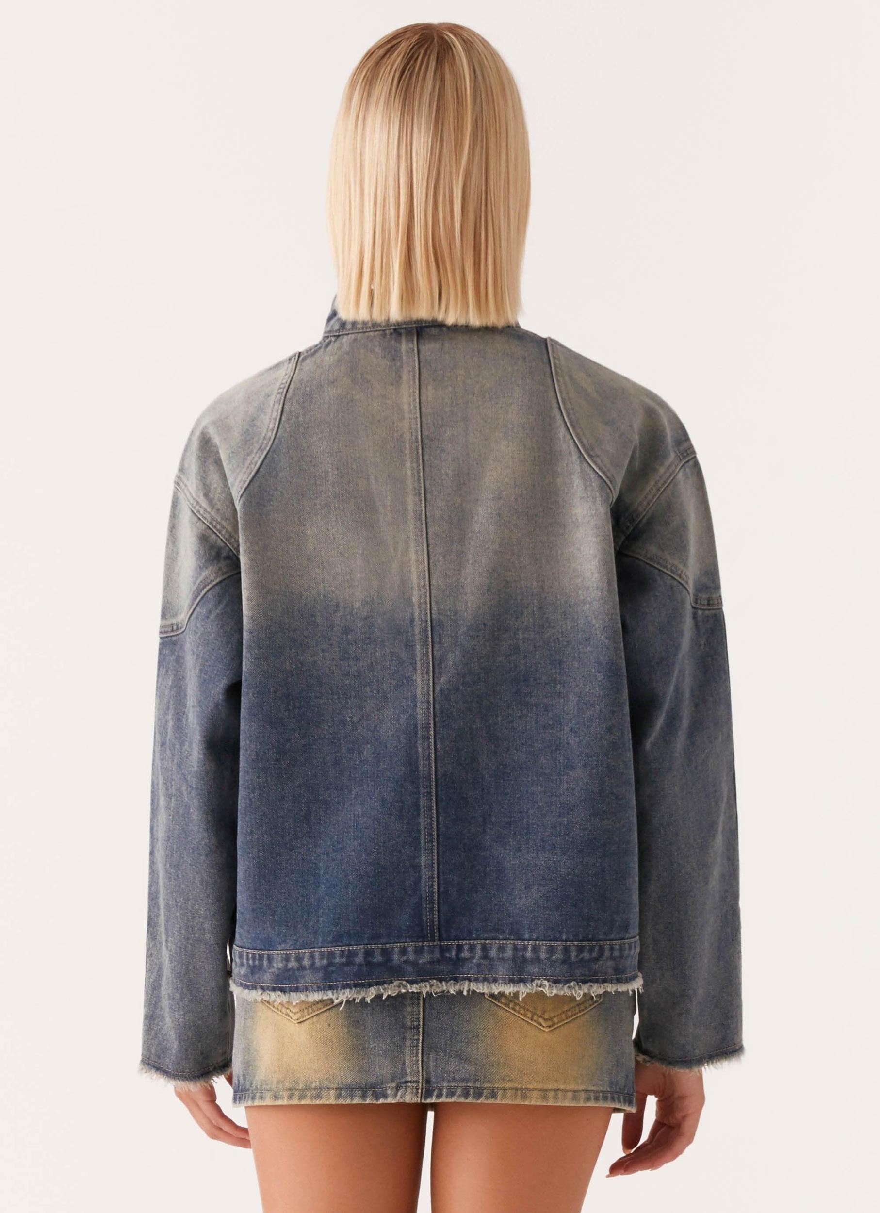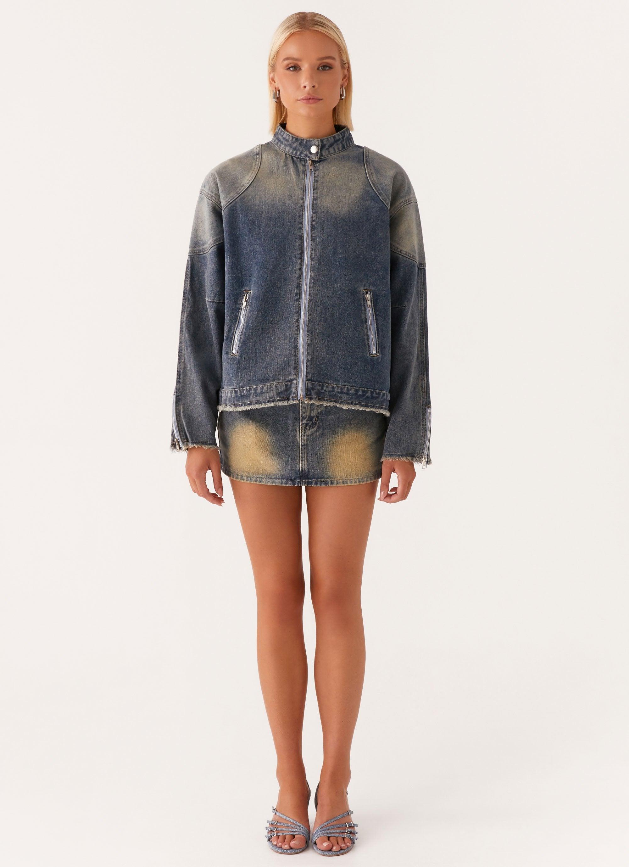 Peppermayo Exclusive The Not Like Us Denim Jacket combines classic style with modern flair, featuring a high rounded neckline and a sleek front metal zipper for an edgy touch. Complete with a neck button for added detail, this jacket is perfect for layering over your favourite outfits. - Midi length- High rounded neckline- Front metal zipper- Neck button clasp- Shoulder detailings- 2 front zipper pockets- Back belt buckle detailing- Unlined- 85% cotton, 10% polyester, 5% viscose Size AU 8 / US 4 garment measurements: Bust: 122 cm / 48.0 inWaist: 122 cm / 48.0 inHem: 120 cm / 47.2 inSleeve length: 41 cm / 16.1 inLength: 63 cm / 24.8 in Annalise is 176cm and wearing a size AU 8 / and US 4