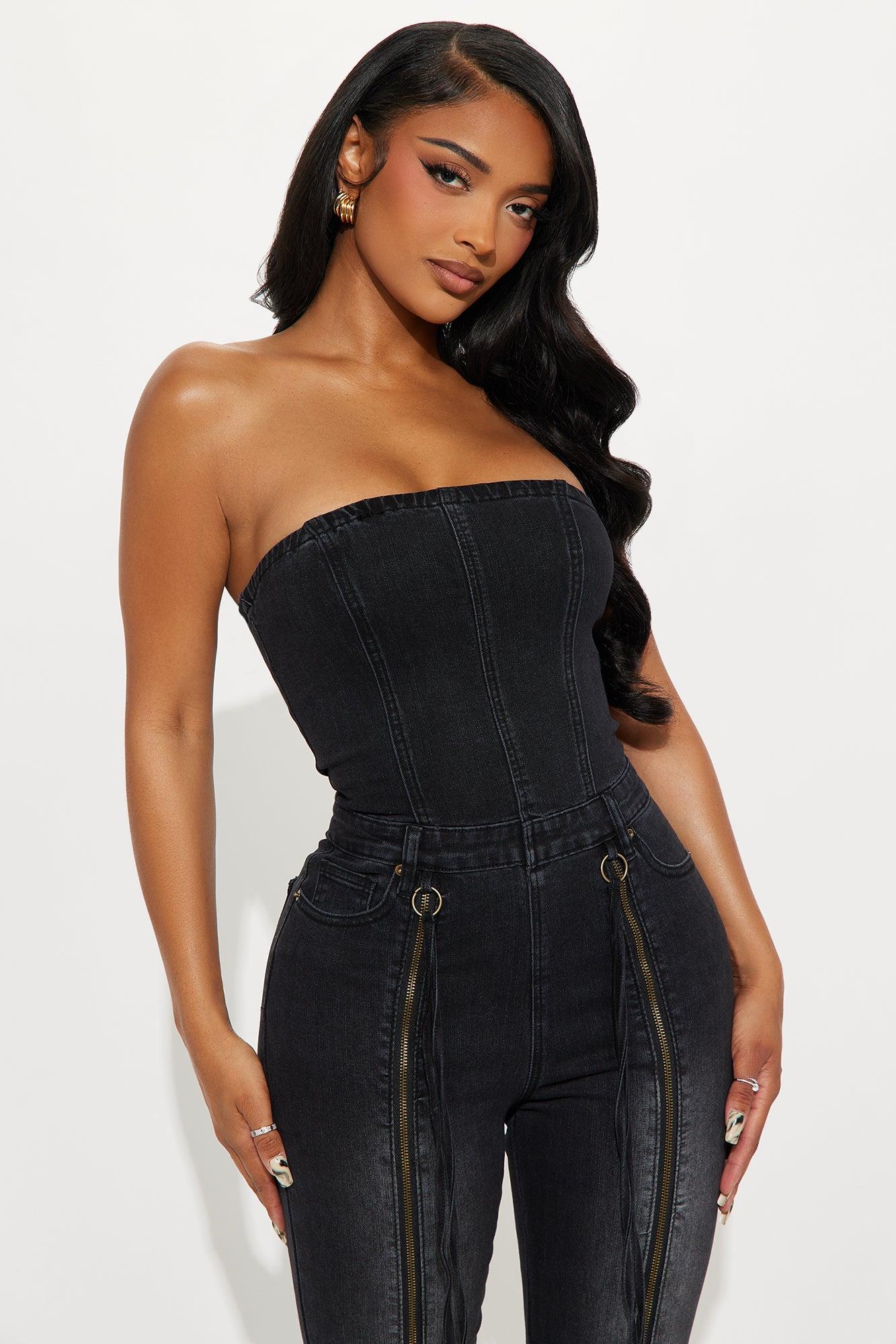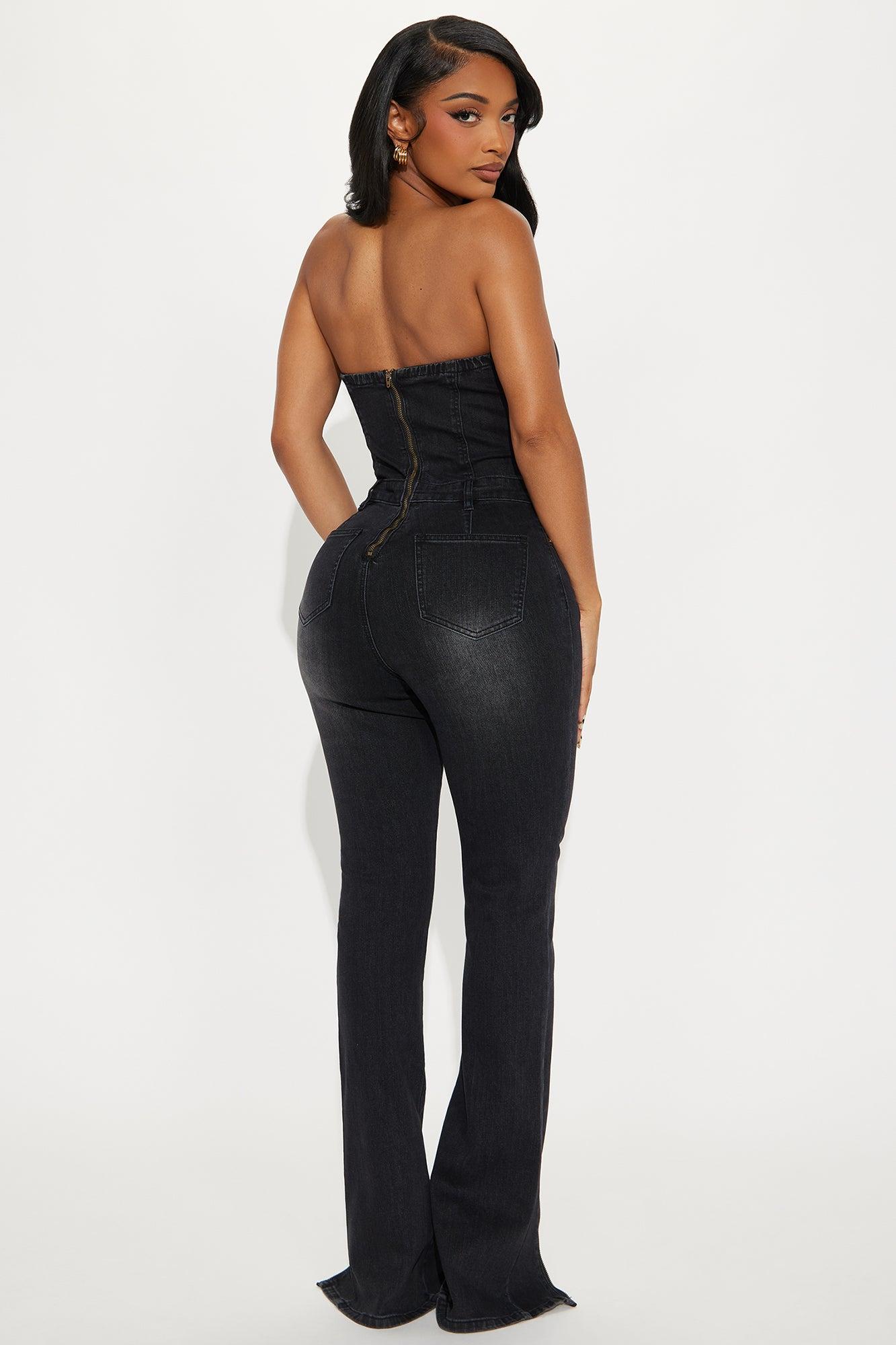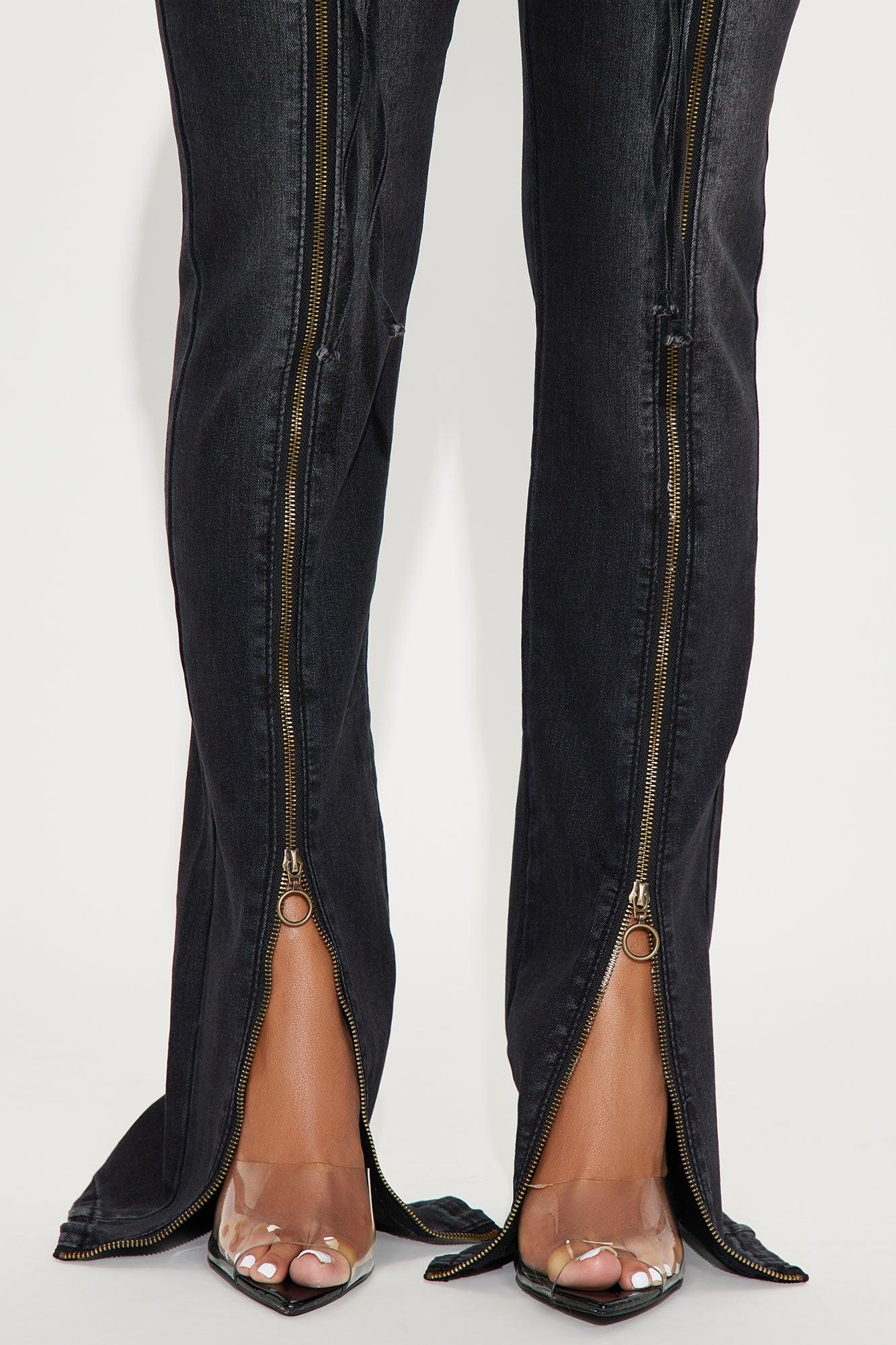 Available In Black Wash. Jumpsuit Back Zip Closure Front Leg Zipper Detail Flare Leg Stretch Inseam = 35" Self:68%Cotton 30%Polyester 2%Spandex Imported California Proposition 65WARNING: Cancer and Reproductive Harm - www.P65Warnings.ca.gov.