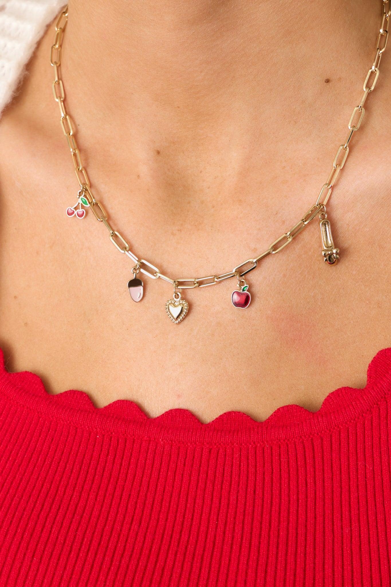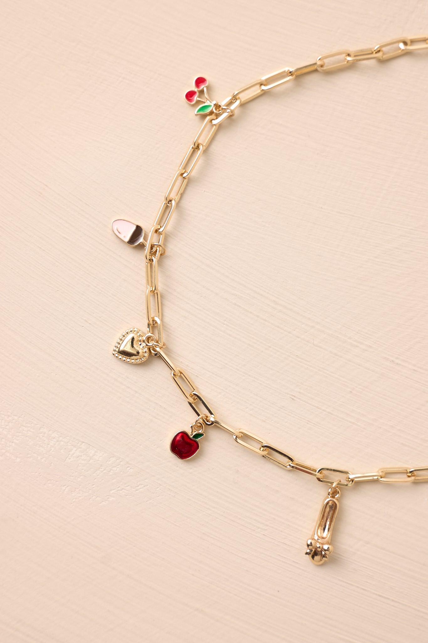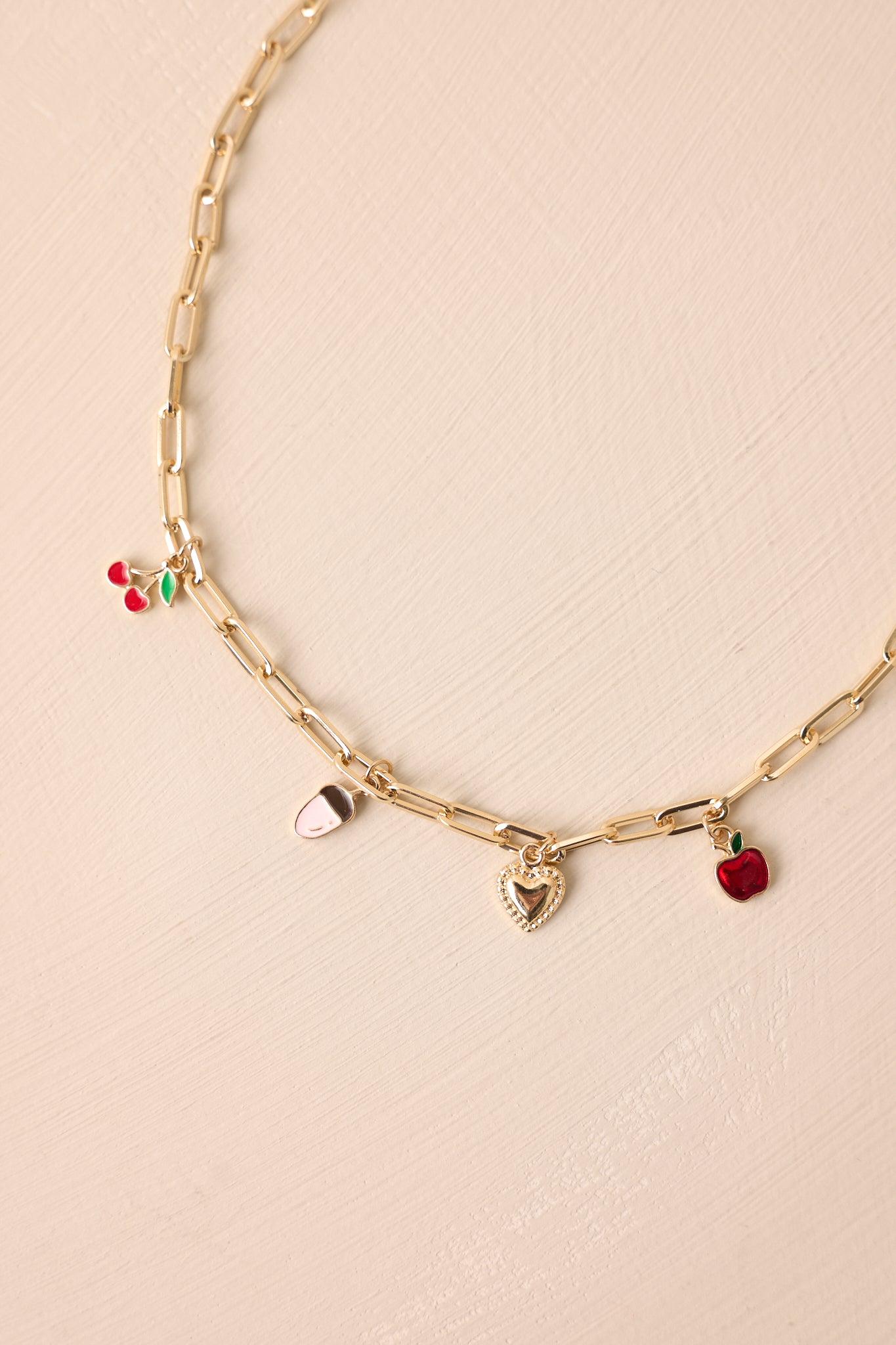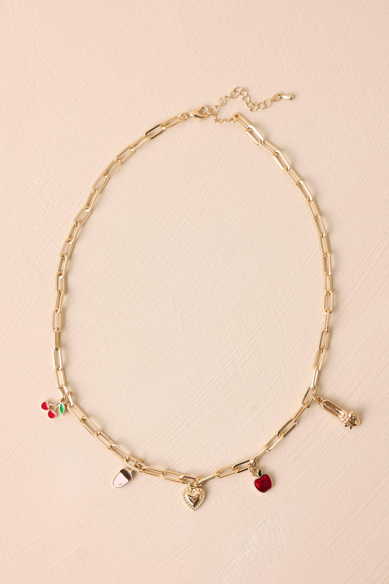 Upgrade your jewelry collection with the Not Today Gold Mixed Charm Necklace. This stunning piece features a variety of eye-catching charms, adding a touch of personality to any outfit. Elevate your everyday look with this must-have accessory. This gold charm necklace features a rectangular chain, a variety of small gold charms, a red apple charm, a heart charm, a ballet shoe charm, an acorn charm, a cherry charm and a lobster claw closure. This Necklace Measures: 18.25" Lead Compliant Manufactured in Korea