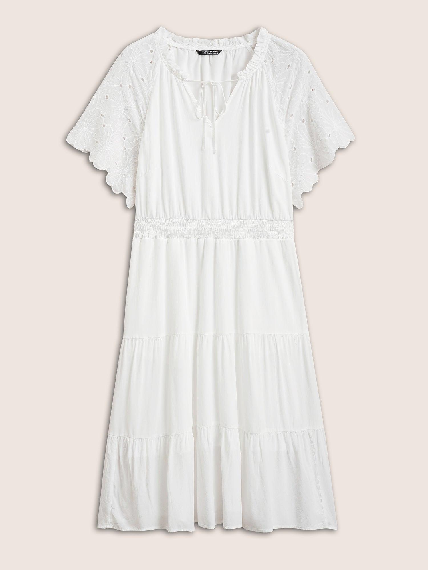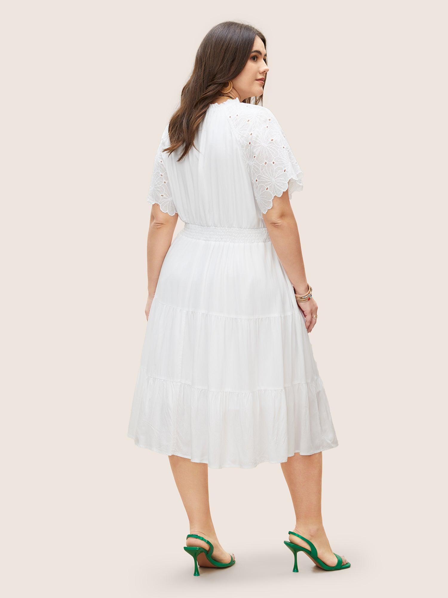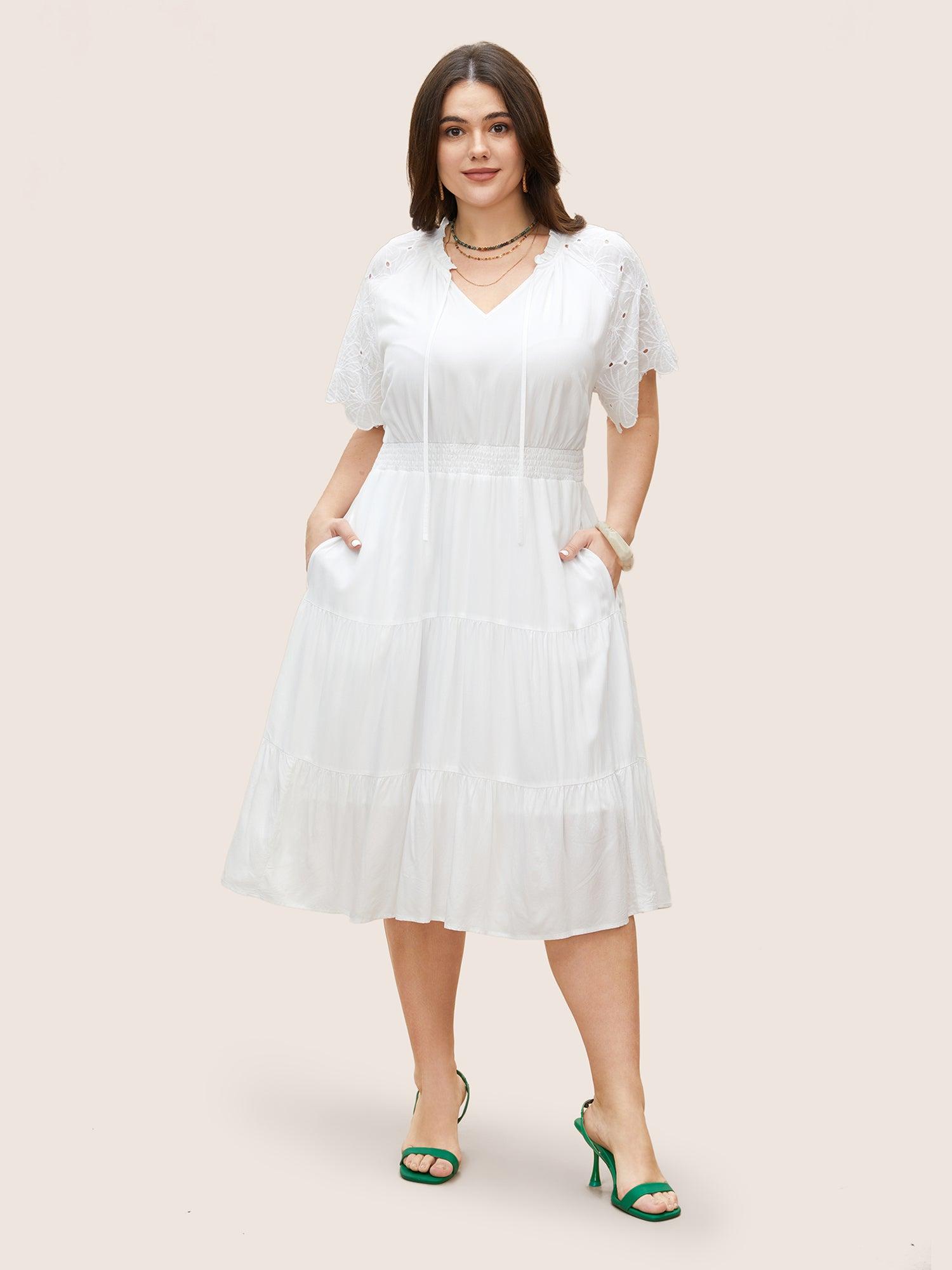 Shop Notched Collar Raglan Sleeve Ruffle Layered Hem Dress now and redefine your style with confidence at BloomChic. Tailored for mid and plus-size women. This trendy Dress, sizes 10-30. You can never go wrong with BloomChic Dresses. Season:Summer;Color:White;Style:Resort;Neckline:Notched collar;Sleeve Type:Raglan sleeve;Prints:Non;Details:Tie knot, Ruffles, Shirred, Patchwork;Pocket:Side seam pocket;Belt:No-belt