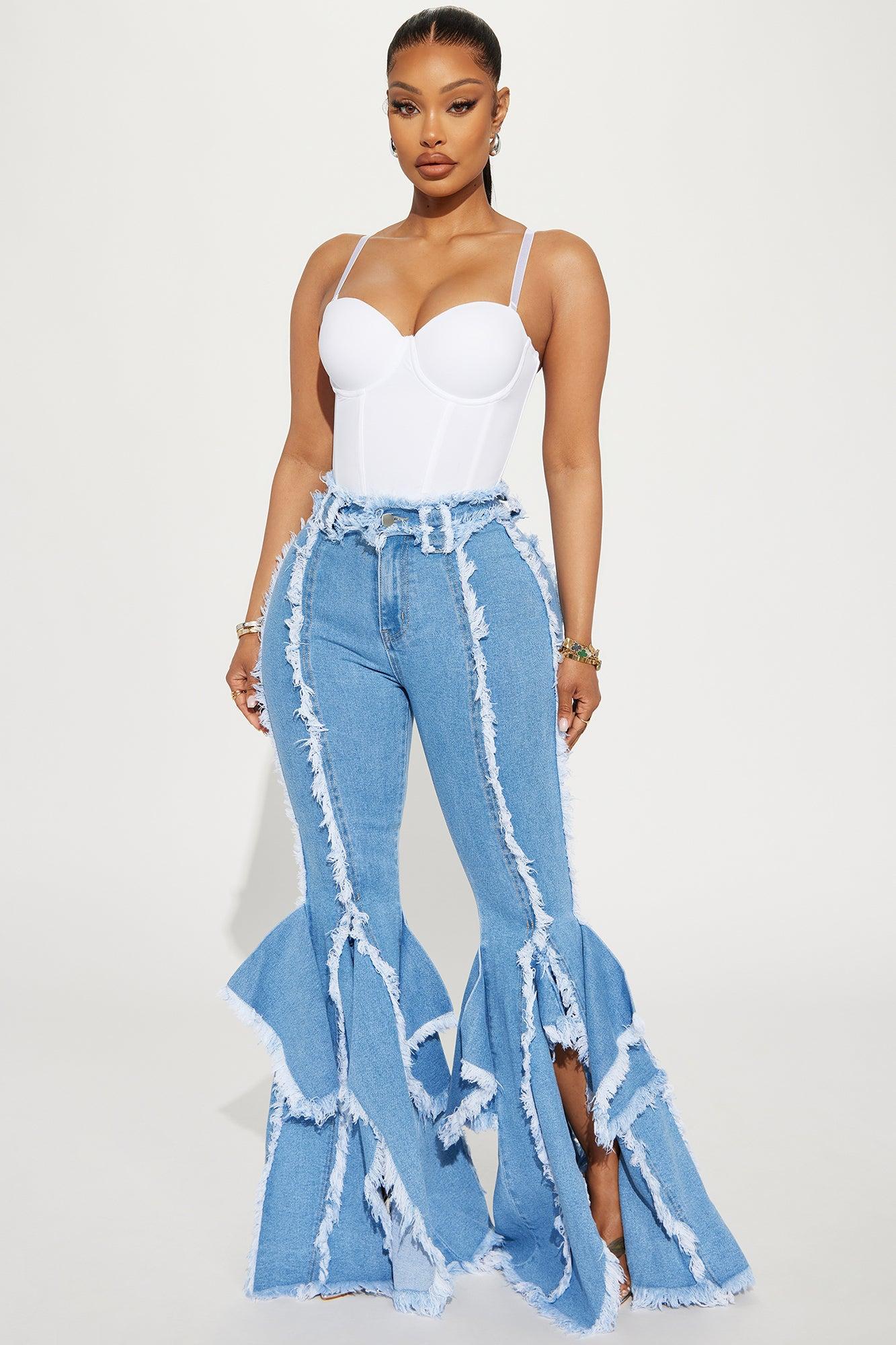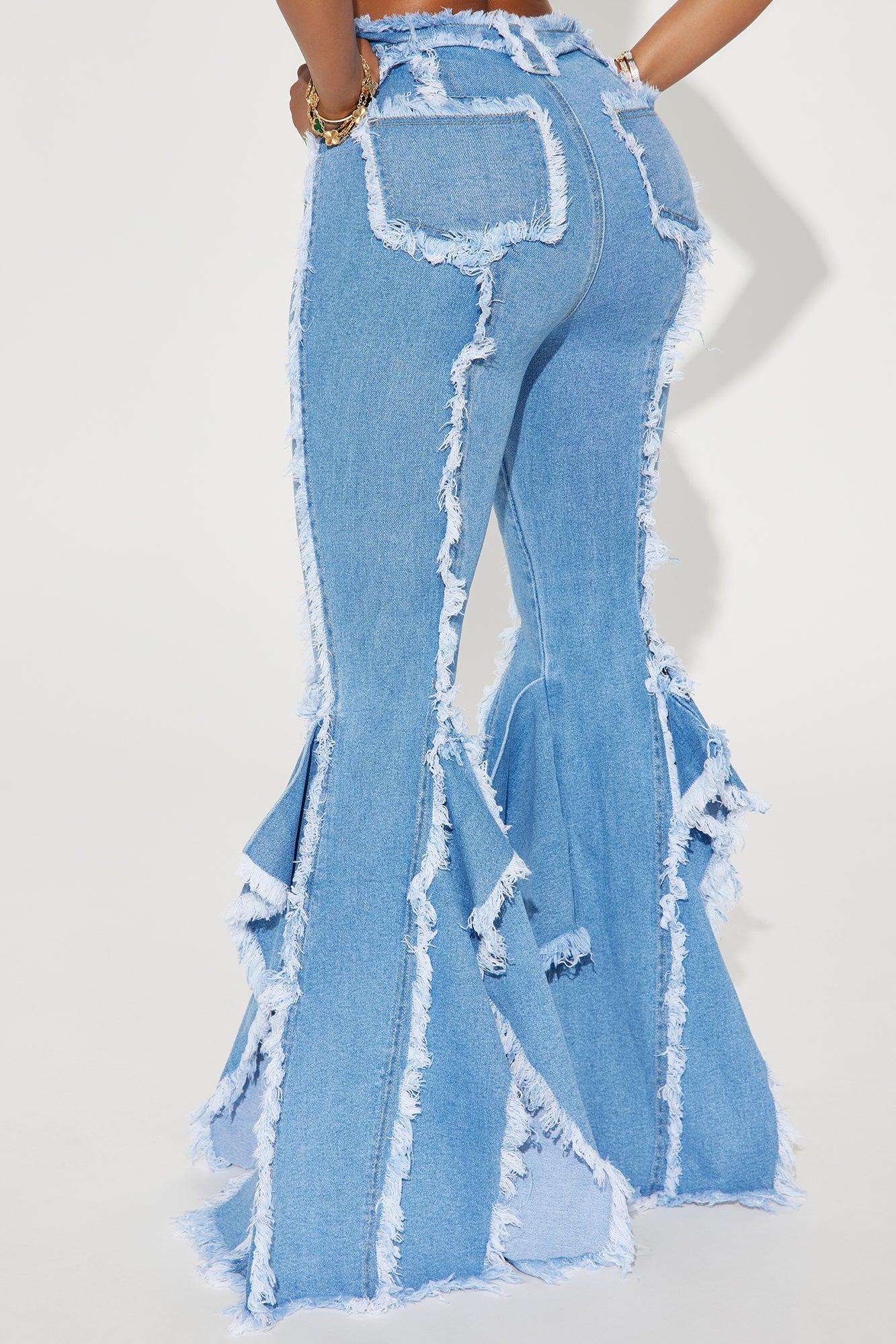 Available In Medium Wash. Flare Jean Back Pockets Fray Seam Detail Fringe Hem 12" High Rise 34.5" Inseam Medium Stretch Disclaimer: Due To The Specialized Wash & Distressing Process, Each Garment Is Unique. 92% Cotton 6% Polyester 2% Spandex Imported California Proposition 65 WARNING: Cancer and Reproductive Harm - www.P65Warnings.ca.gov.
